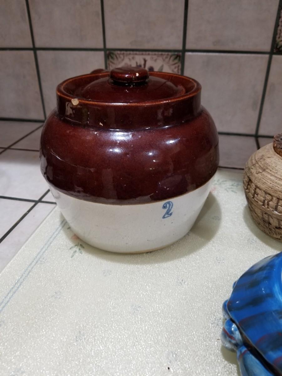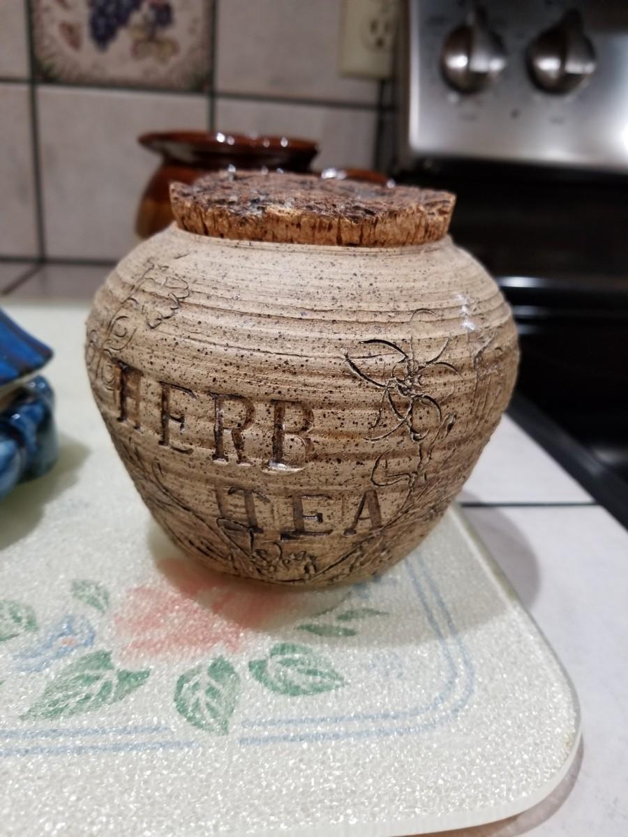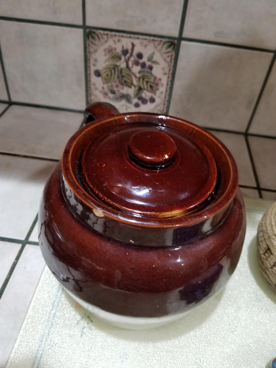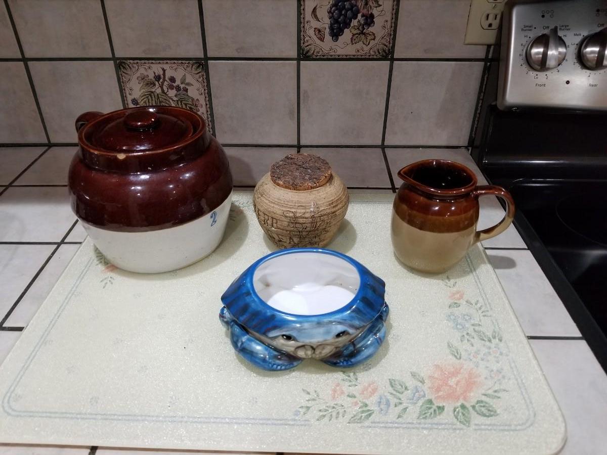 4 pieces of pottery crab, bean pot # 2 with chip and herb tea
