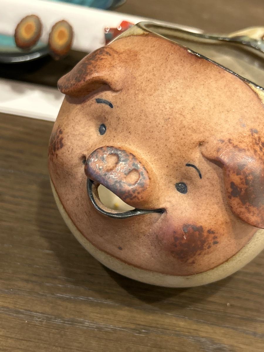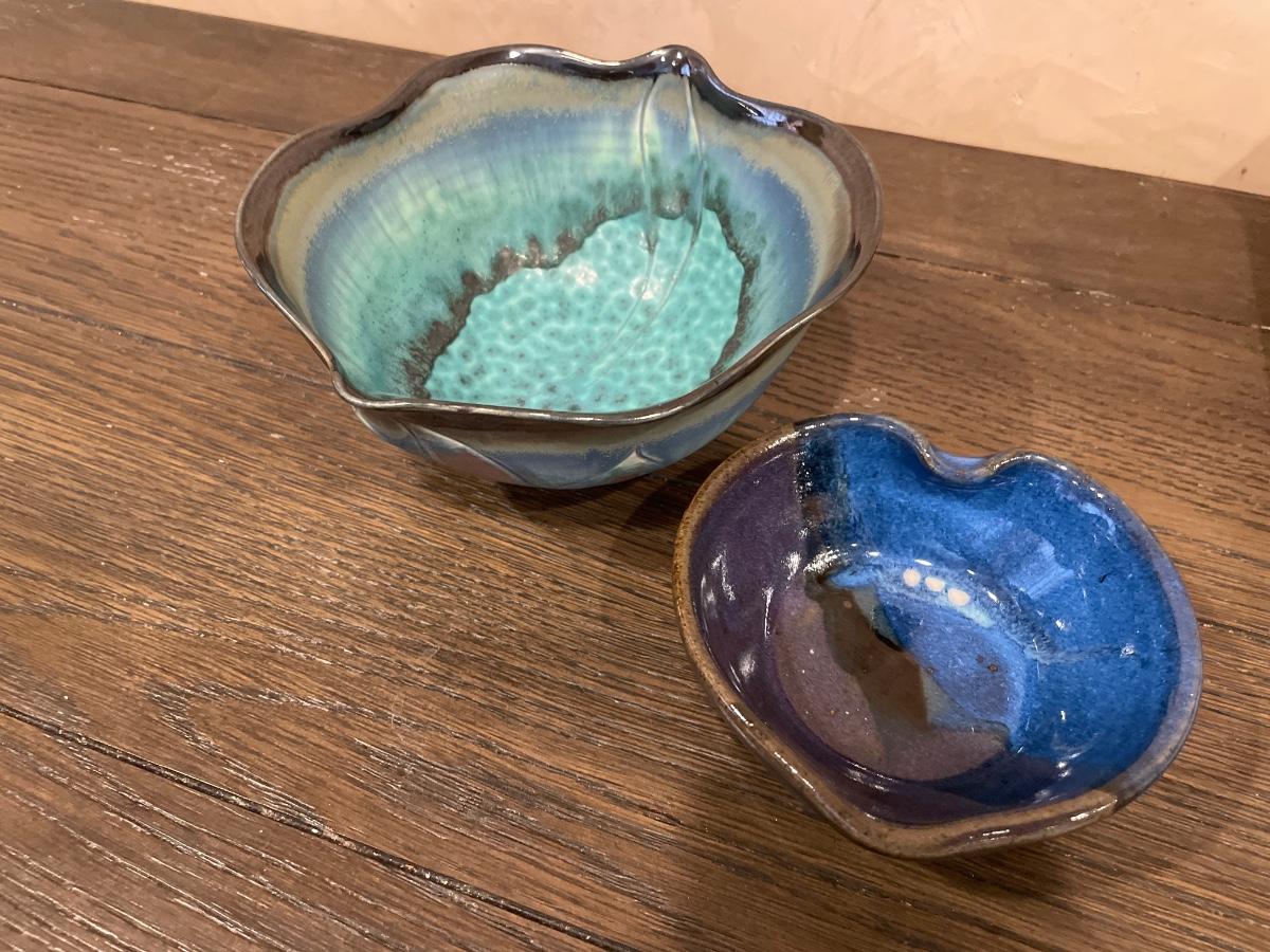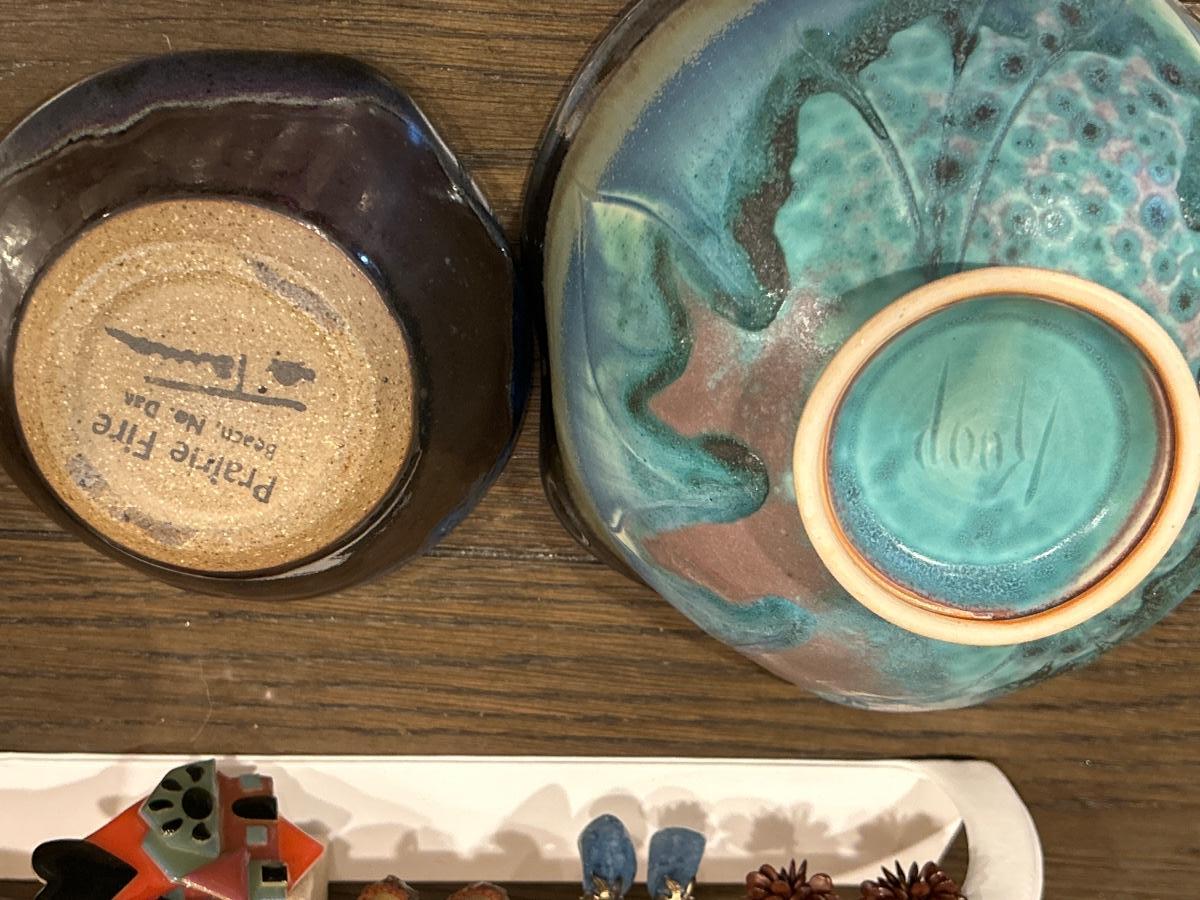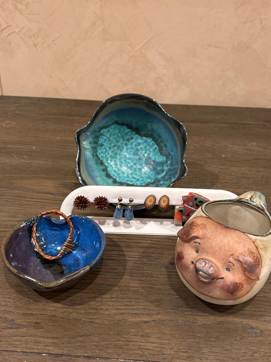 Vintage stoneware pig face creamer & signed pottery bowls.. 6” & 4” bowls. All earrings are clip ons, pin made by Lucinda & 1 very small bracelet. Pig creamer from the 60’s, other 2 bowls signed.