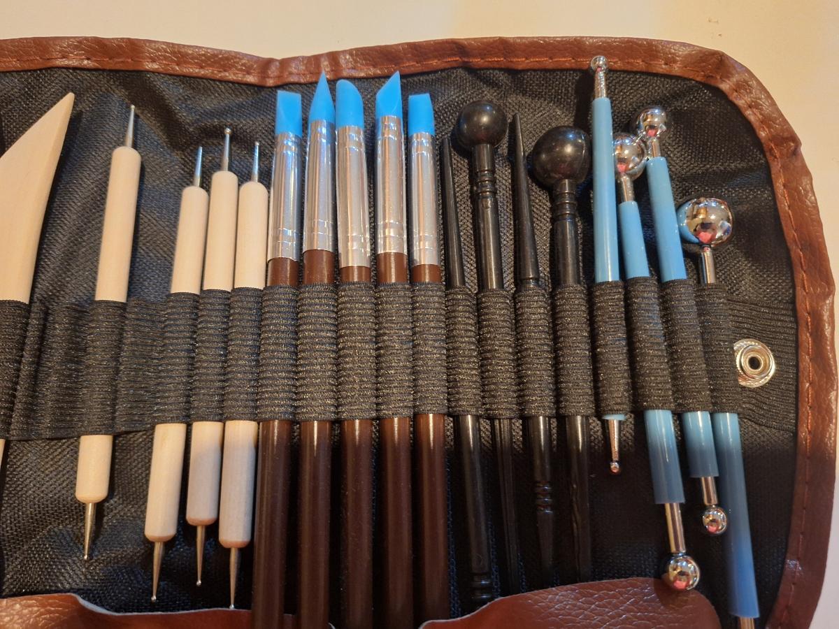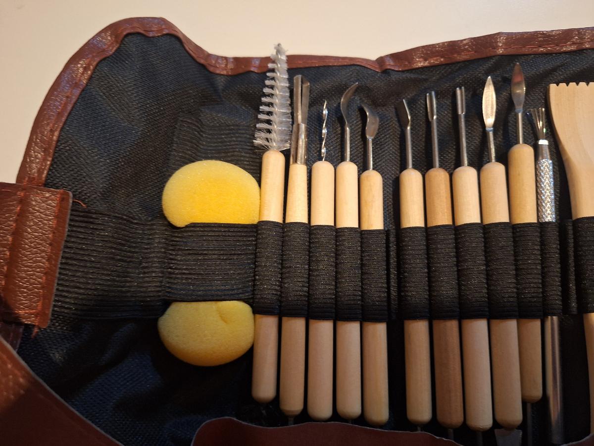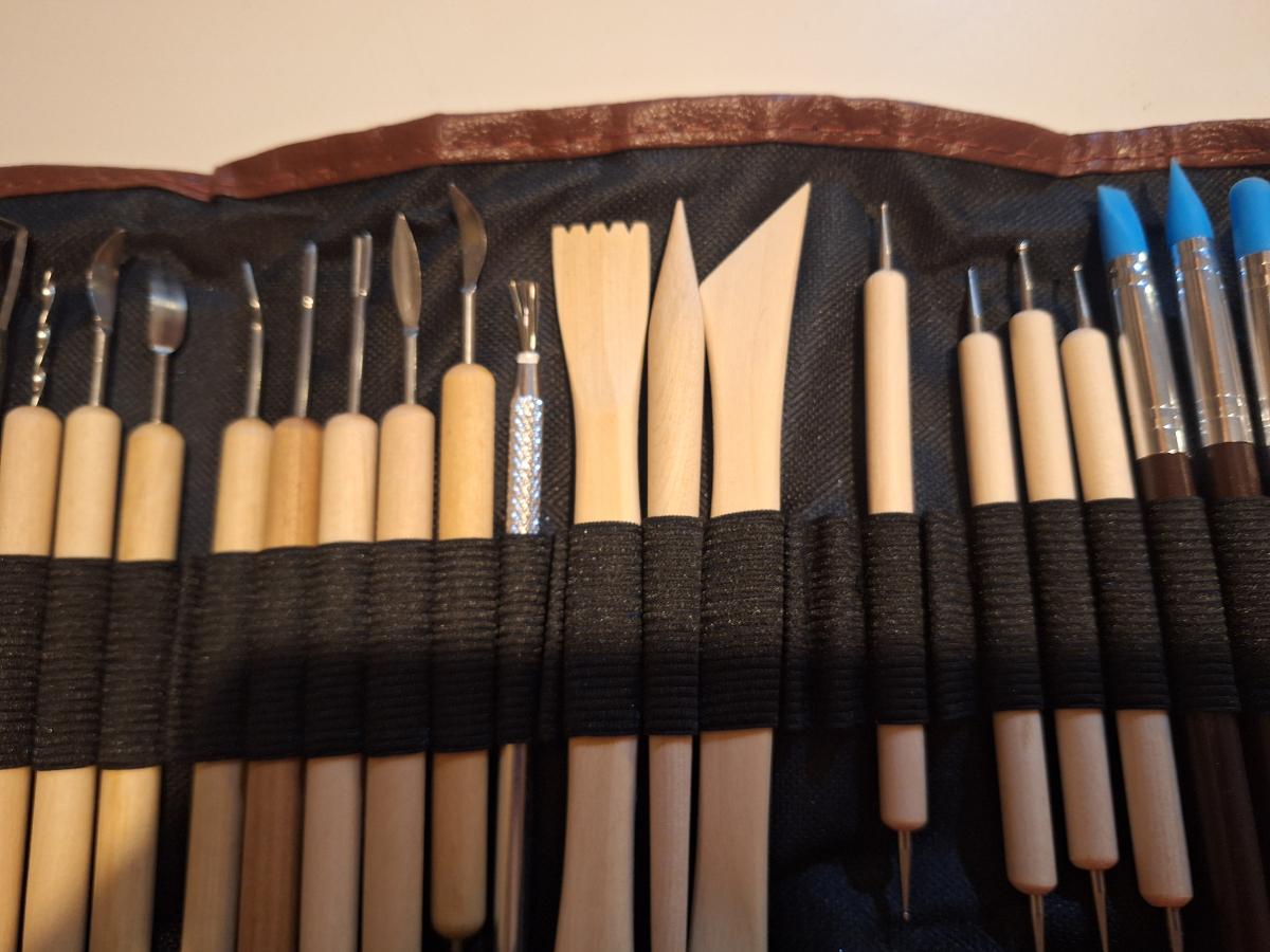 pottery and clay sculpting tool set in a brown roll-up carrying case.