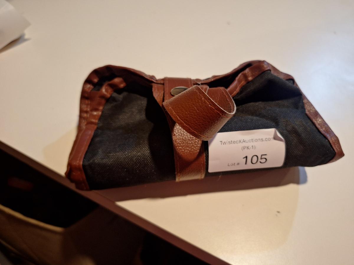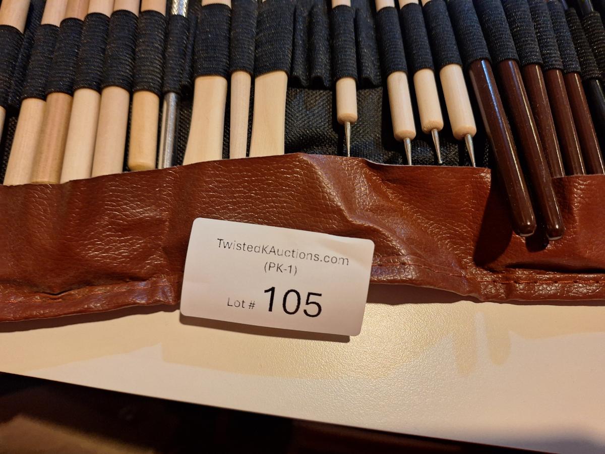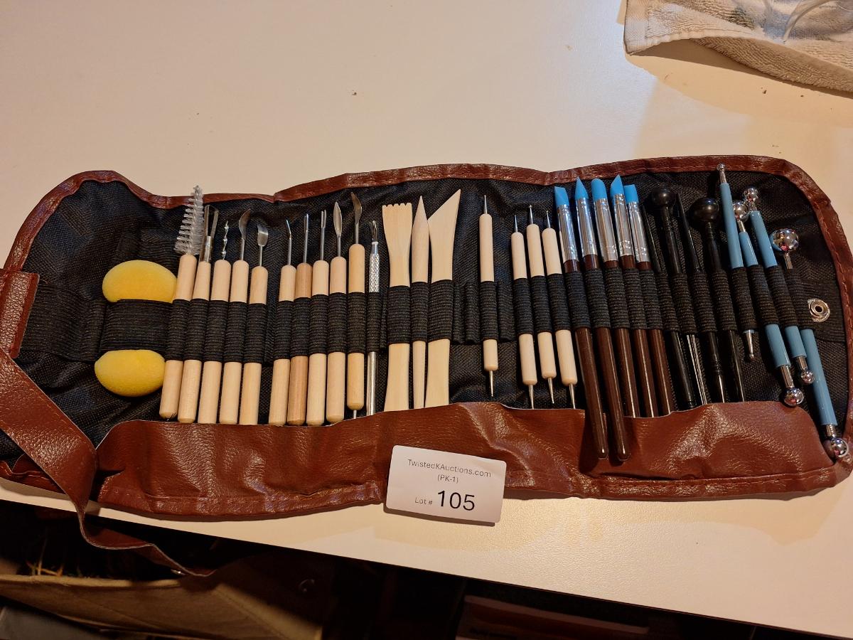 pottery and clay sculpting tool set in a brown roll-up carrying case.