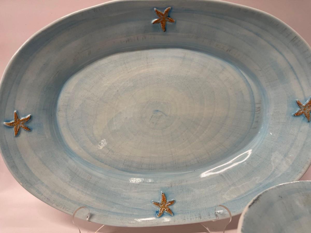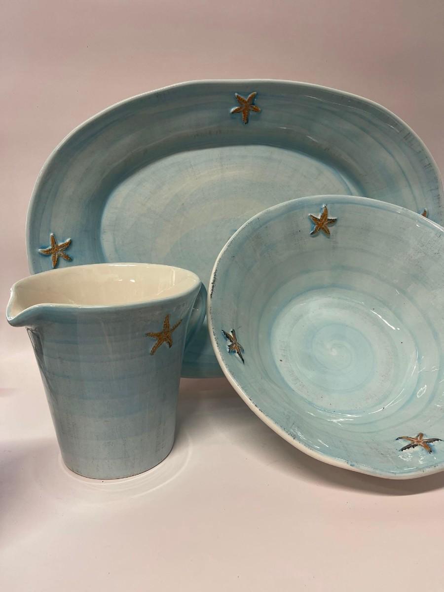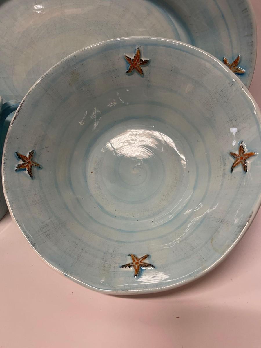 <p>Pottery Barn Blue Ceramic Starfish Serving Dishes. All very good condition. Minor crazing on a couple of pieces. </p>