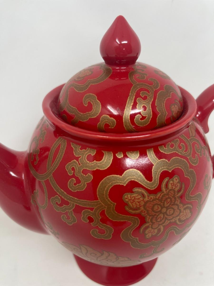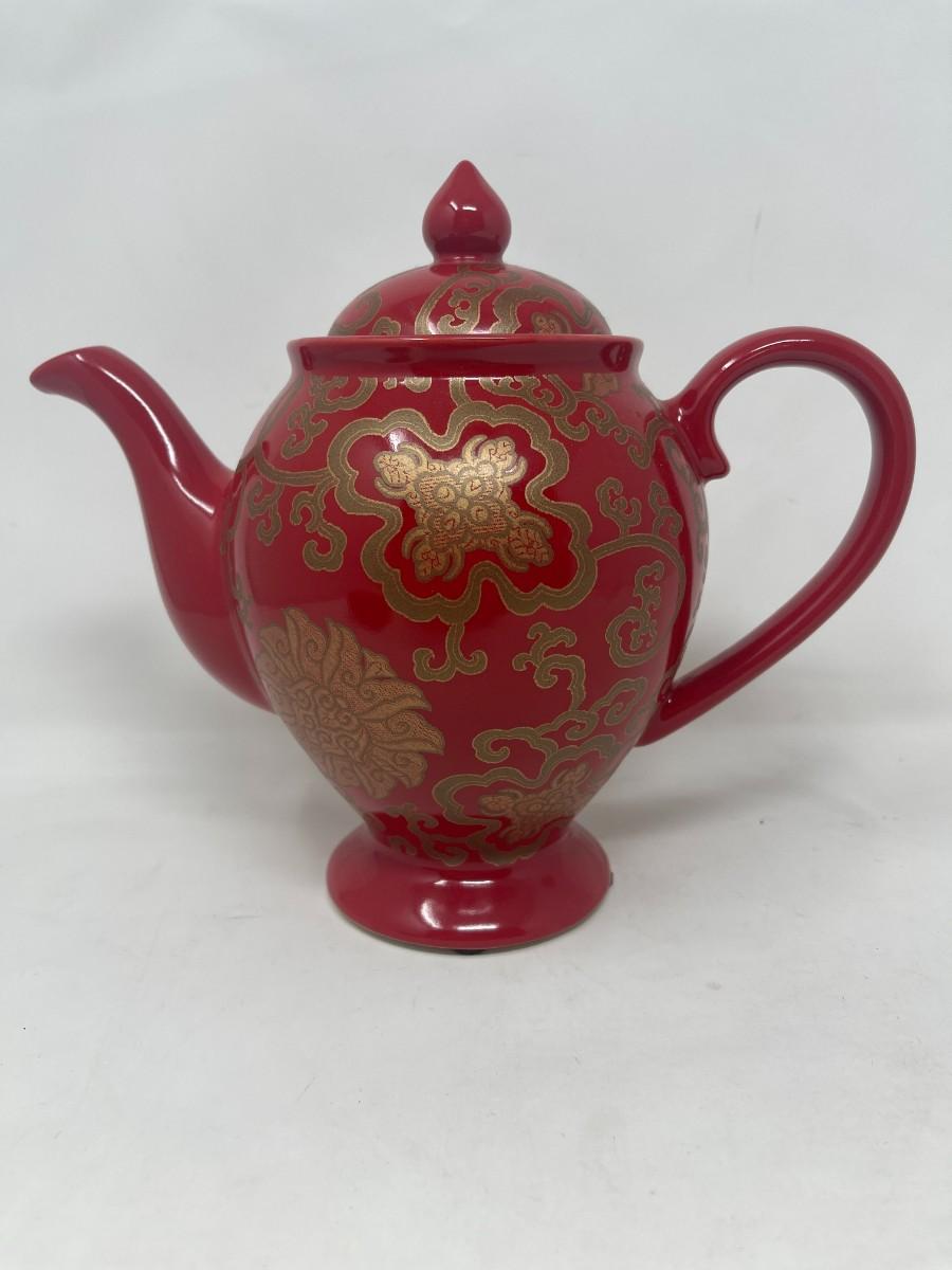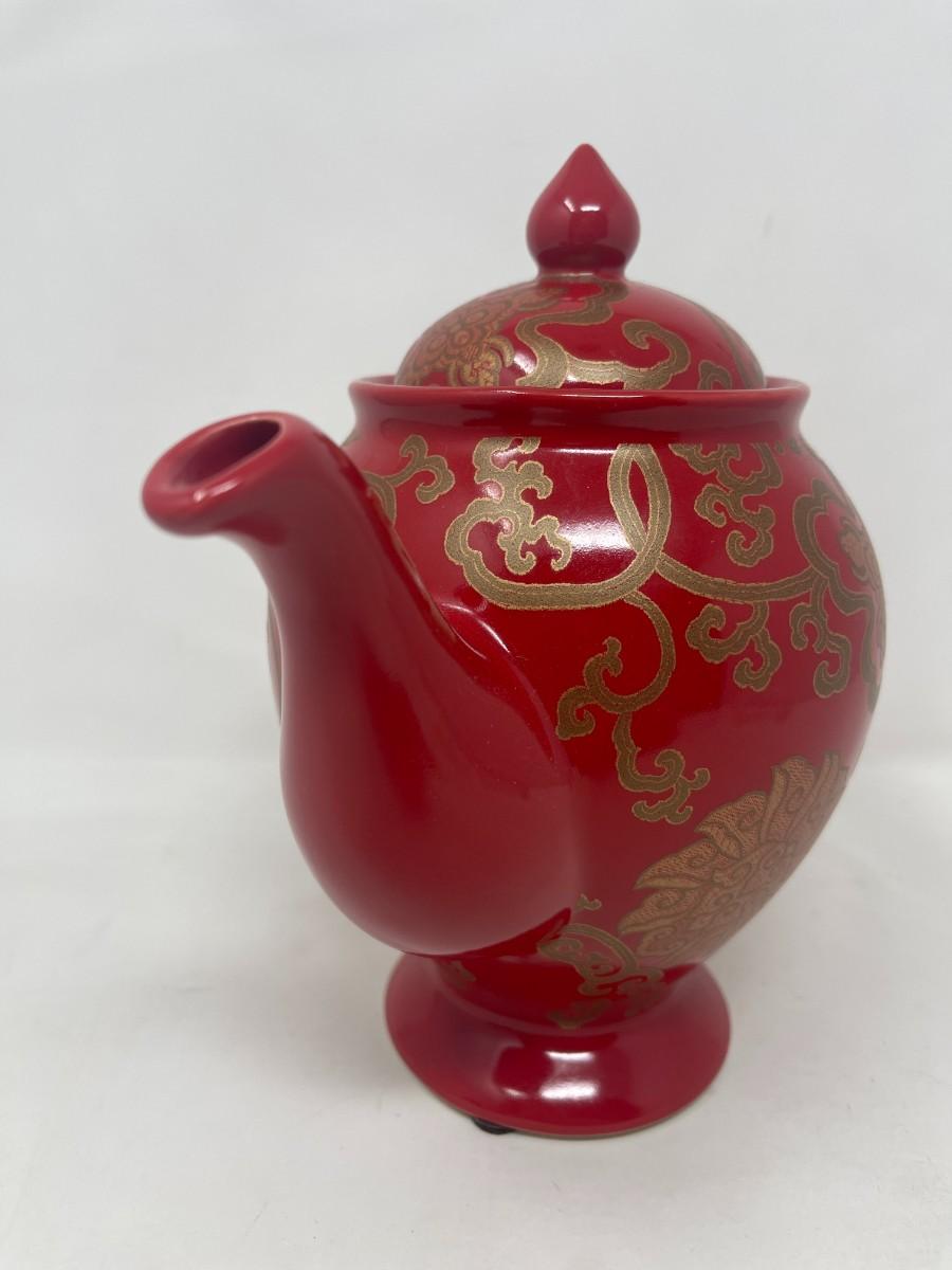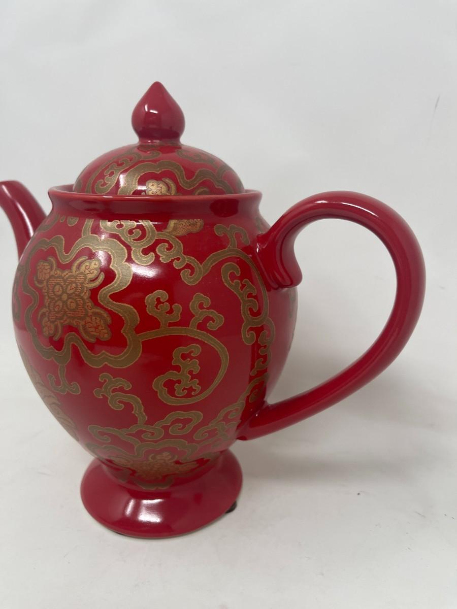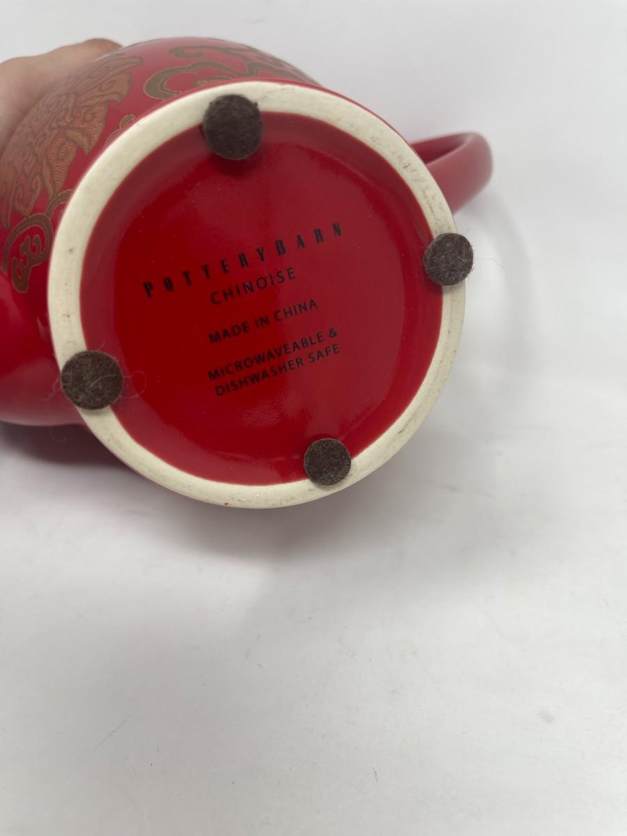 In striking red with gold-toned embellishments, this design from Pottery Barn in their Chinoise line makes a bold statement you're sure to love. It's safe to use. So, in addition to being pretty it's useful. Cheers! Approx.: 7 3/4" H. # 433