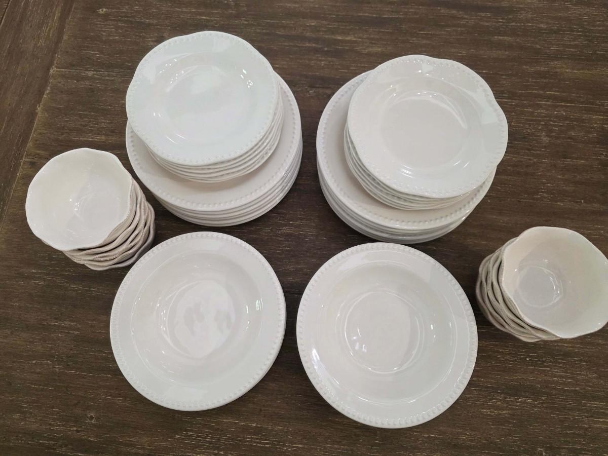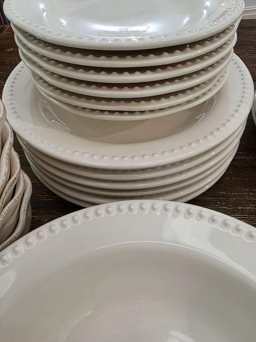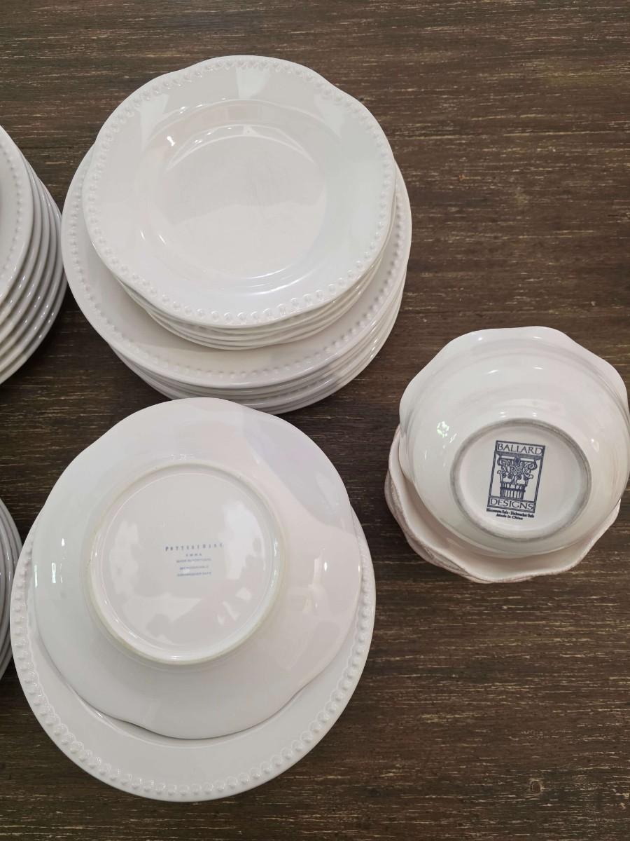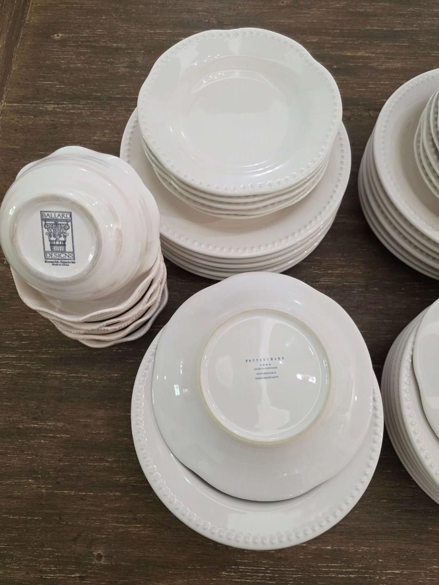 This is a lot including dinner plates and bowls by Pottery Barn, "Emma" pattern with a beaded edge. A few do show signs of wear (light gray lines), but only a few of them. The salad plates and dessert bowls are by Ballard Designs. They are the same white as the pottery barn with scalloped edges. Please see pictures for further description. You are bidding on the lot meaning you must pay for and take the entire lot.