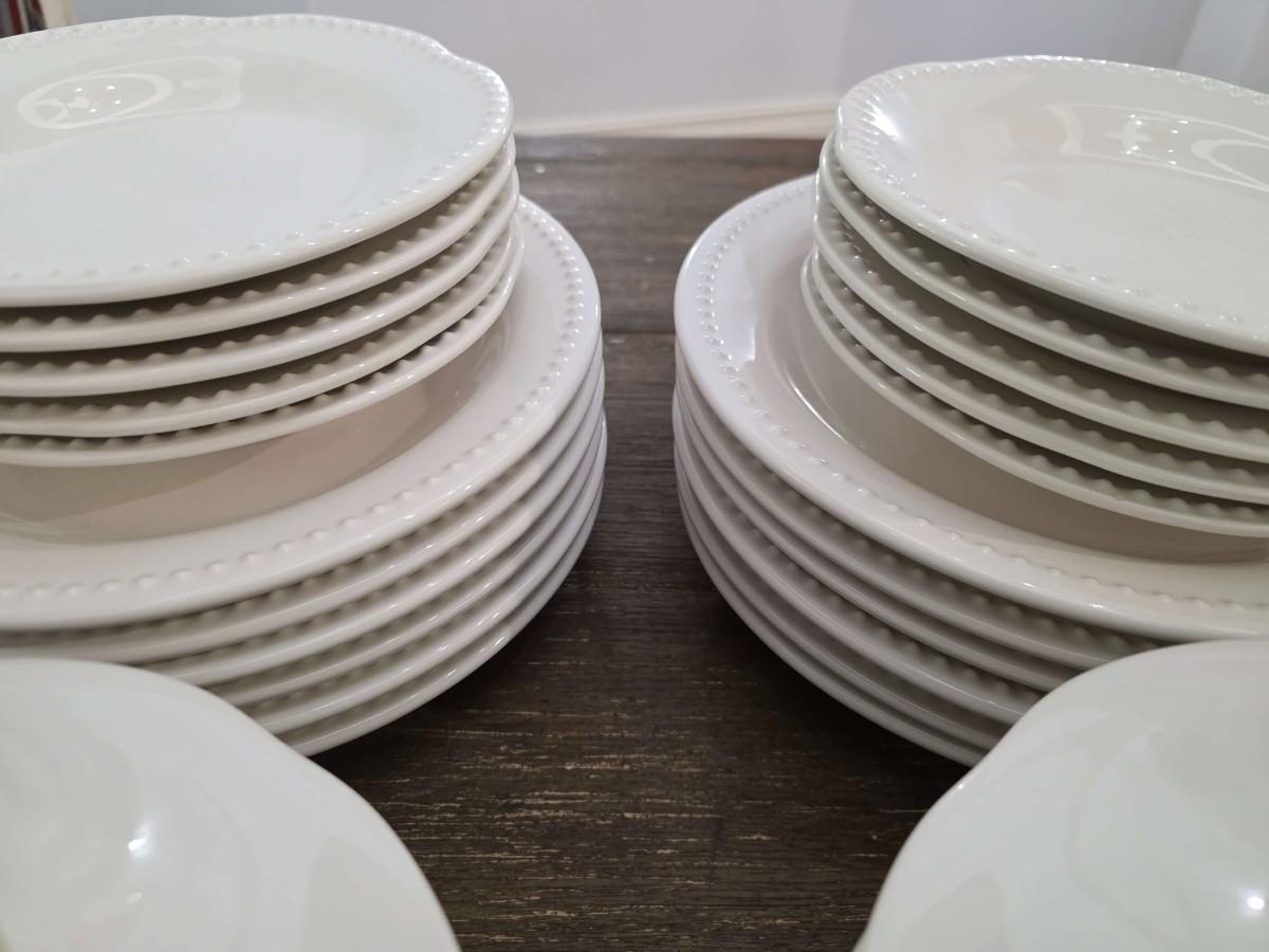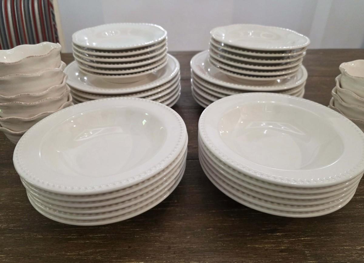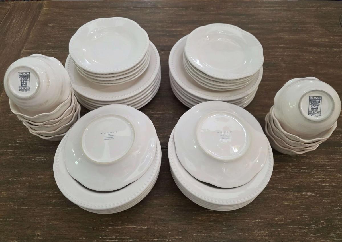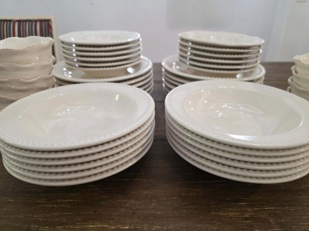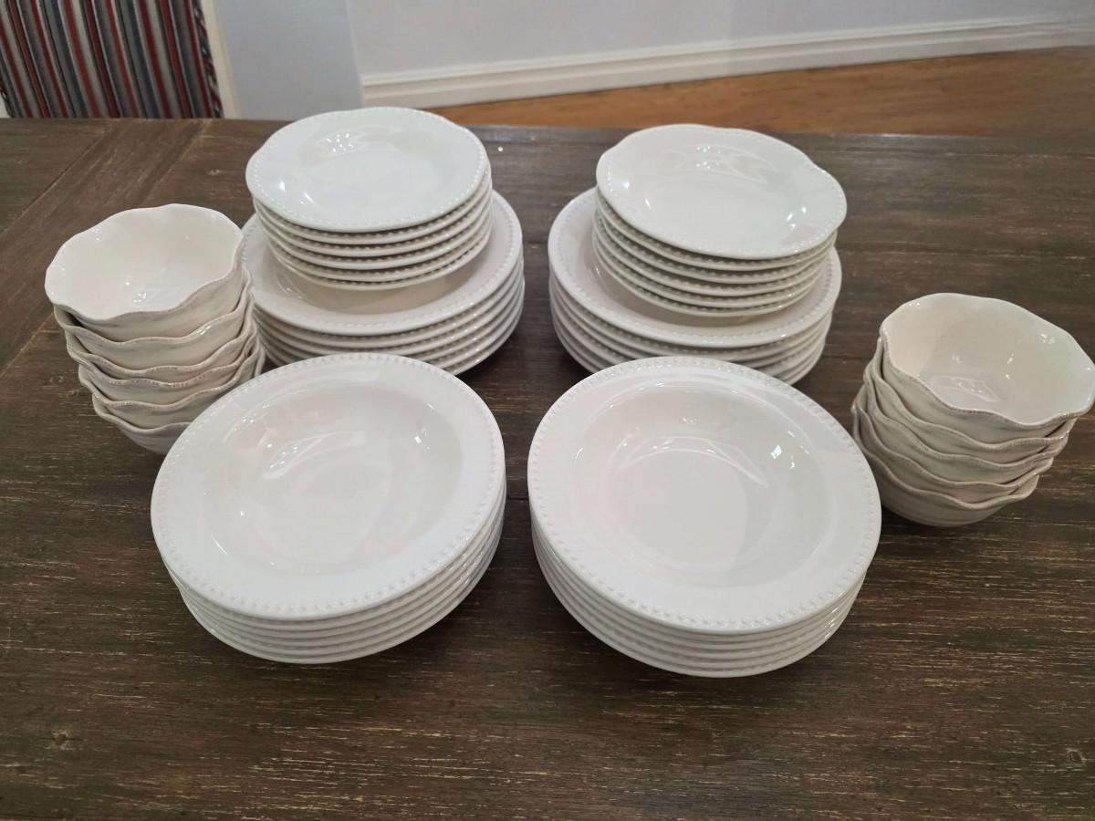 This is a lot including dinner plates and bowls by Pottery Barn, "Emma" pattern with a beaded edge. A few do show signs of wear (light gray lines), but only a few of them. The salad plates and dessert bowls are by Ballard Designs. They are the same white as the pottery barn with scalloped edges. Please see pictures for further description. You are bidding on the lot meaning you must pay for and take the entire lot.