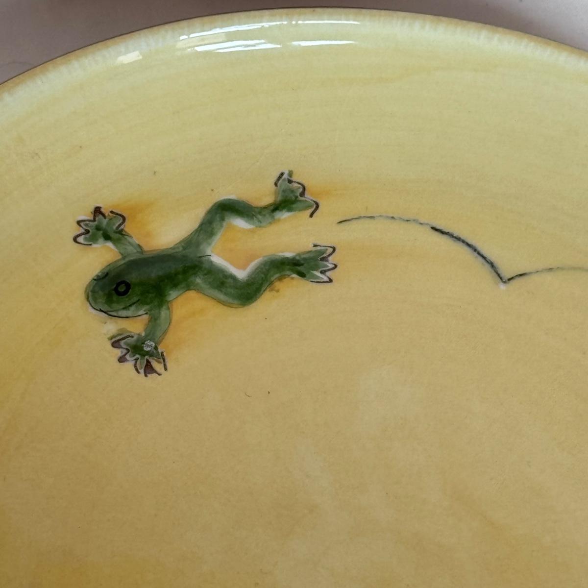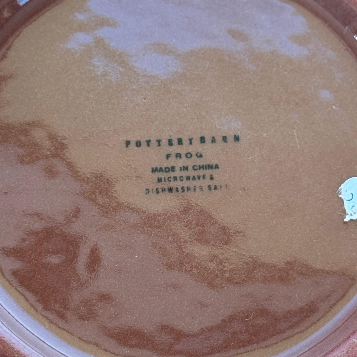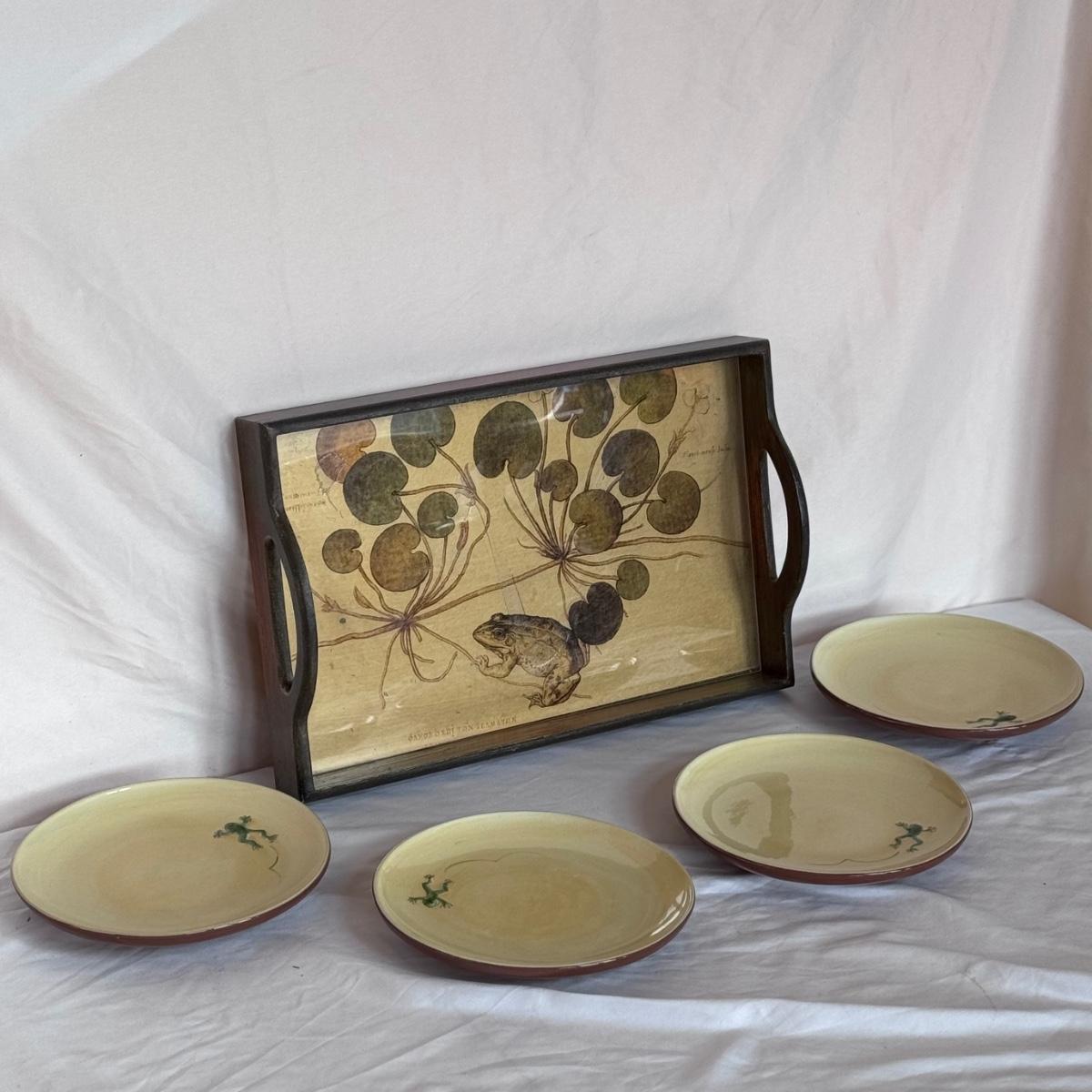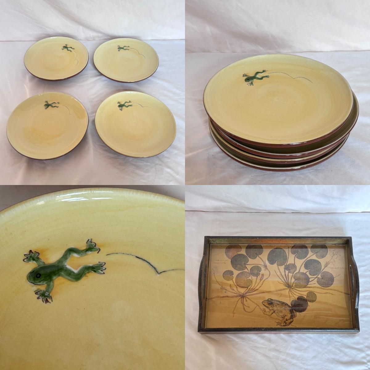 This lot includes four Pottery Barn ceramic plates with adorable frogs jumping on the front. It also includes one wooden tray with a frog and lily pads on the front. The wooden tray measures 16.95” x 11” x 3.5”H. Shipping available.