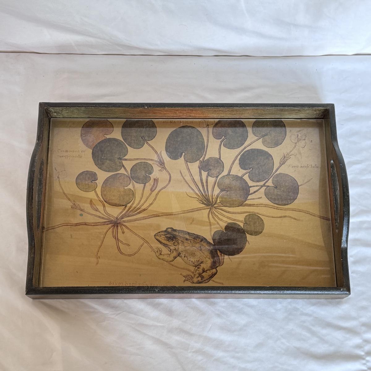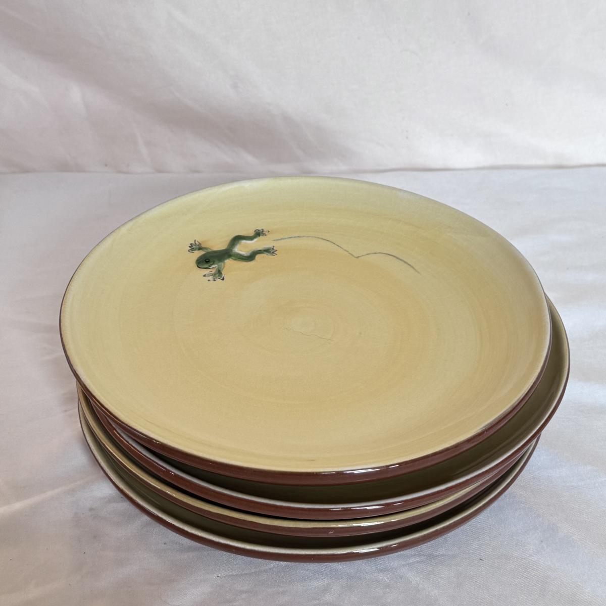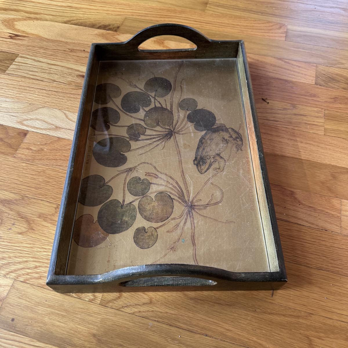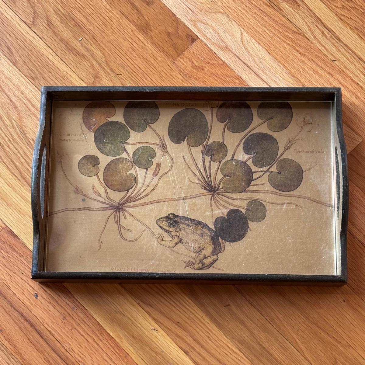 This lot includes four Pottery Barn ceramic plates with adorable frogs jumping on the front. It also includes one wooden tray with a frog and lily pads on the front. The wooden tray measures 16.95” x 11” x 3.5”H. Shipping available.