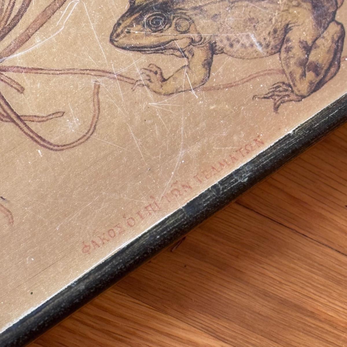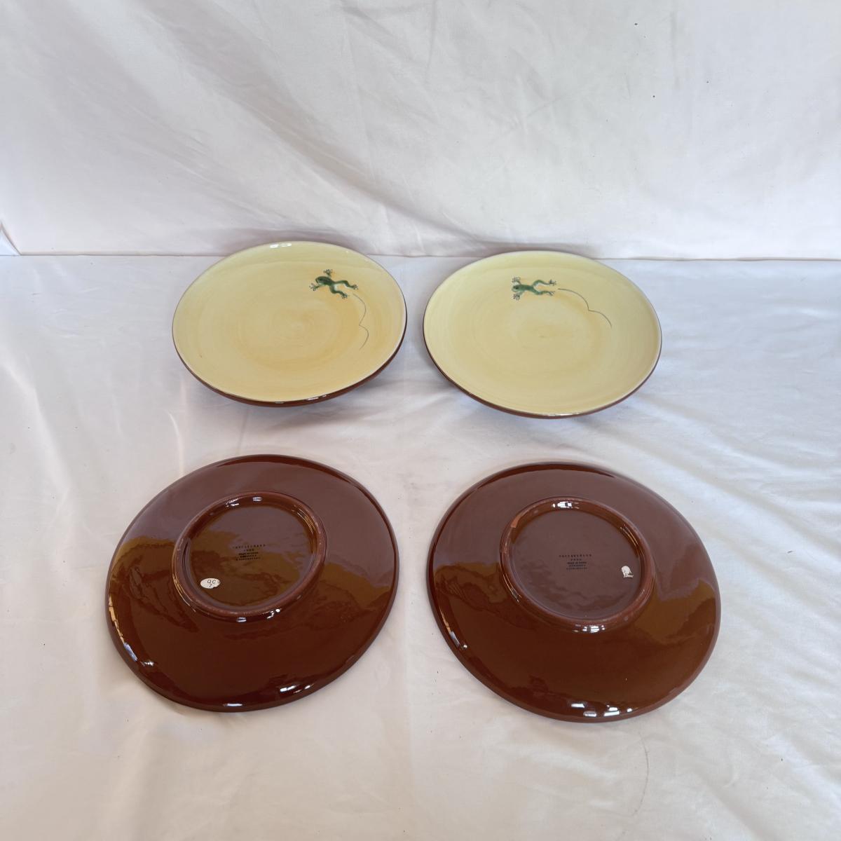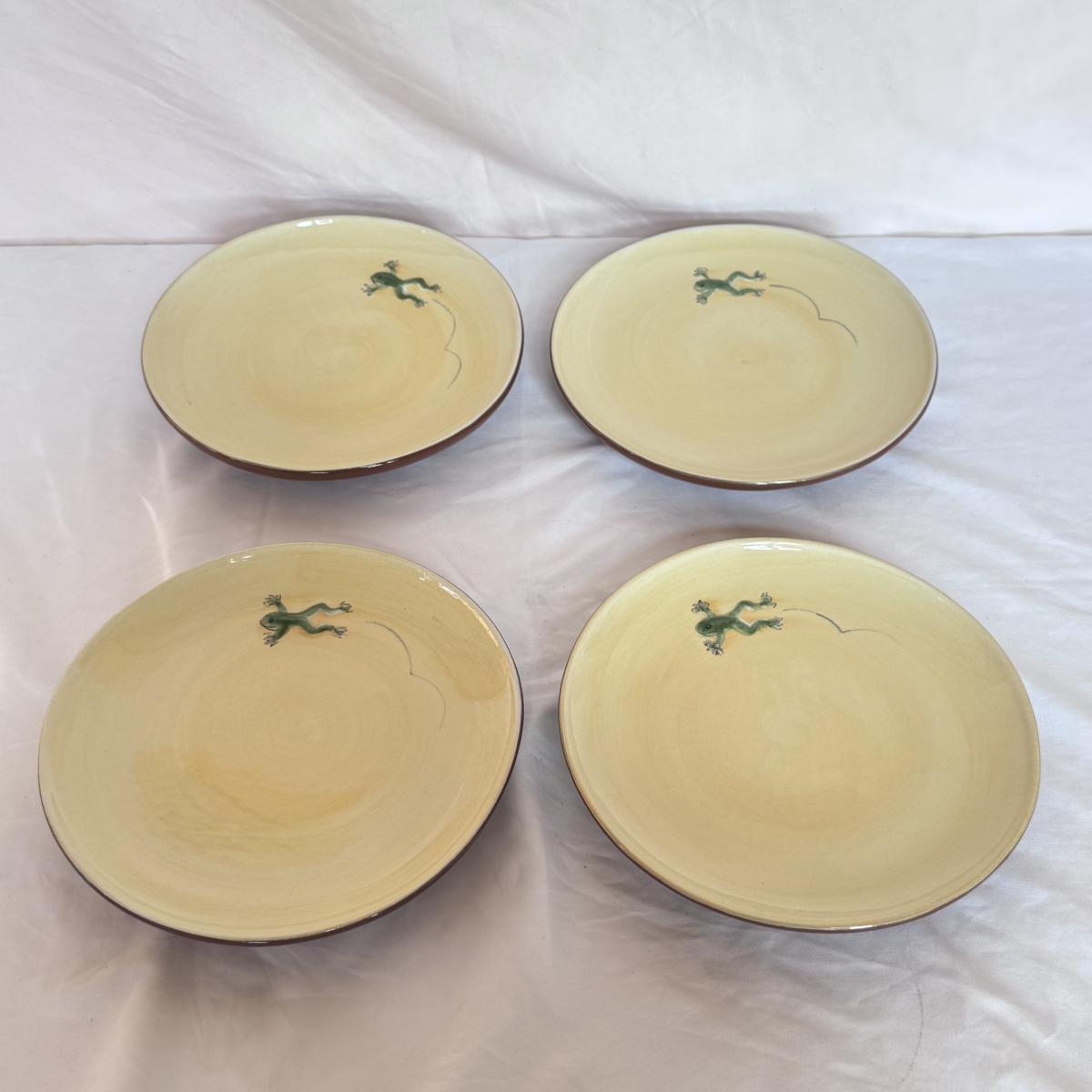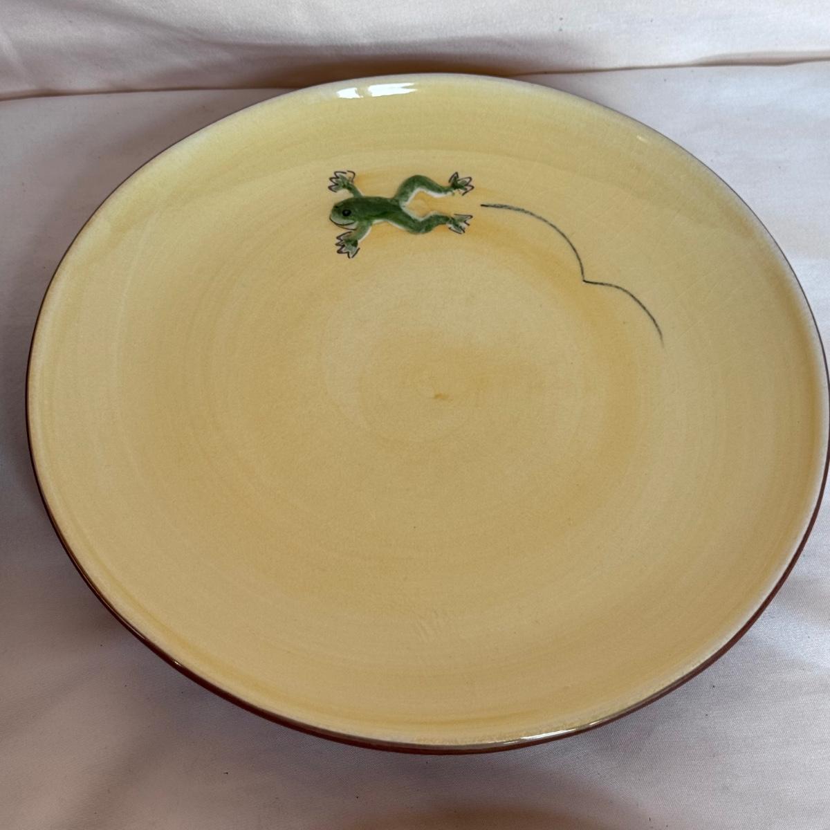 This lot includes four Pottery Barn ceramic plates with adorable frogs jumping on the front. It also includes one wooden tray with a frog and lily pads on the front. The wooden tray measures 16.95” x 11” x 3.5”H. Shipping available.