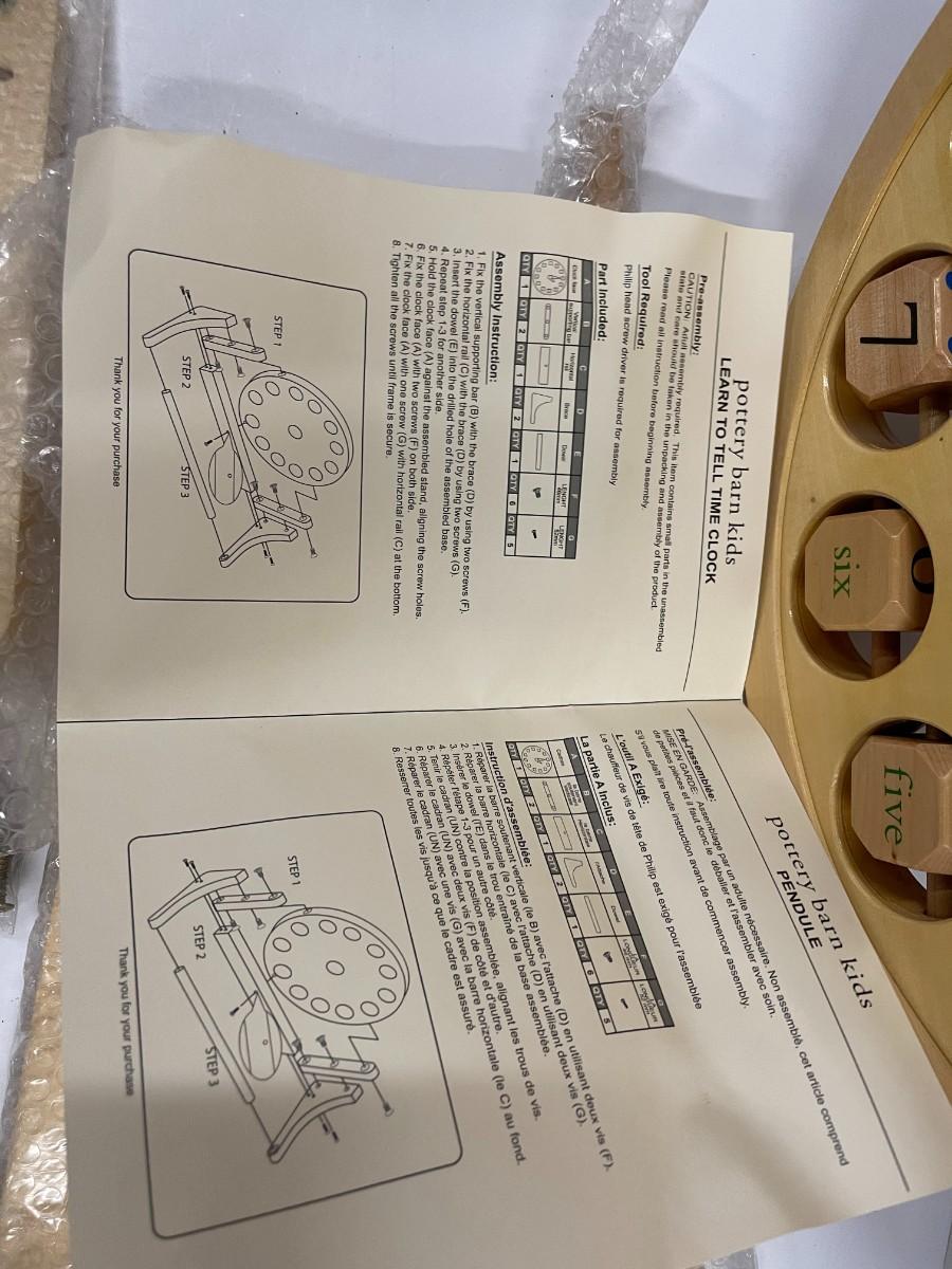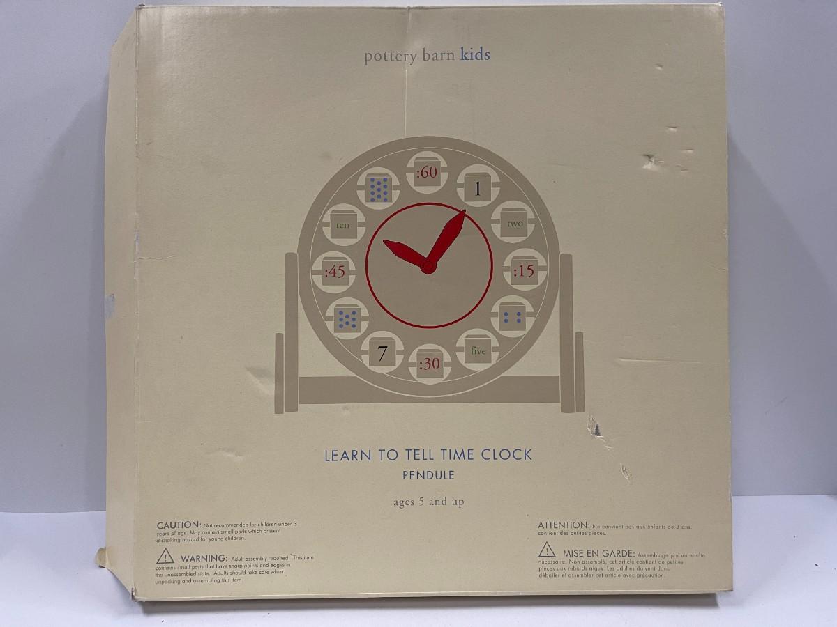 Pottery Barn Kids "Learn to Tell Time Clock" in original box, never used. Box is a bit damaged. Box dimensions: 14" x 14".