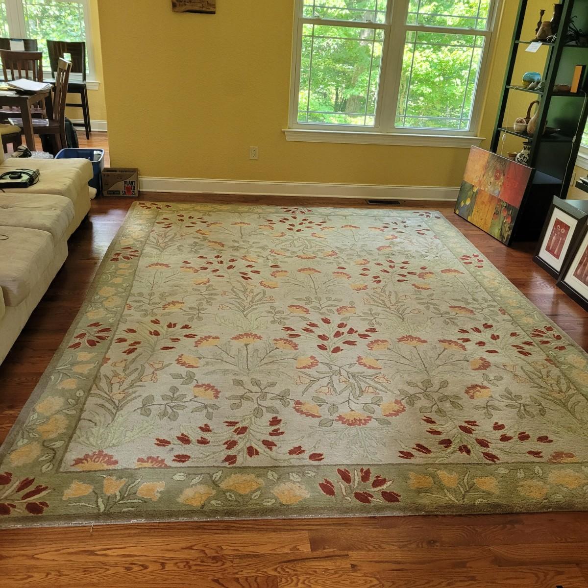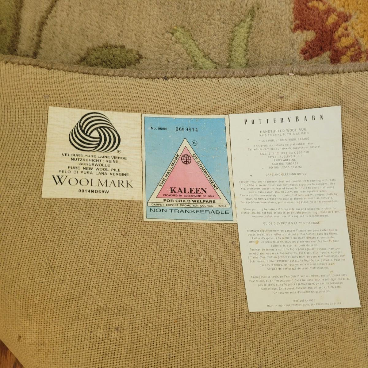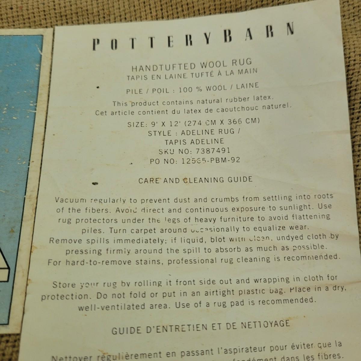 This Pottery Barn “Adeline” rug is 100% wool and measures approximately 9’ x 12.’ Some staining throughout and signs of wear (see photos). Local pick up only. Winning bidder must bring assistance to help move due to its weight and size.