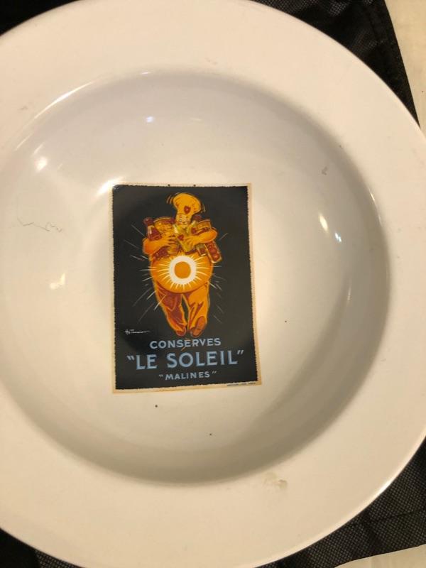 Set of four dinner plates from Pottery Barn, 4 pasta bowls and 1 large pasta serving bowl with classic vintage poster design 14.5 diameter on large serving bowl x 3.5 in tall at rim, bowls are 10in diameter x 2.5in tall and dinner plates are 11.5in diameter