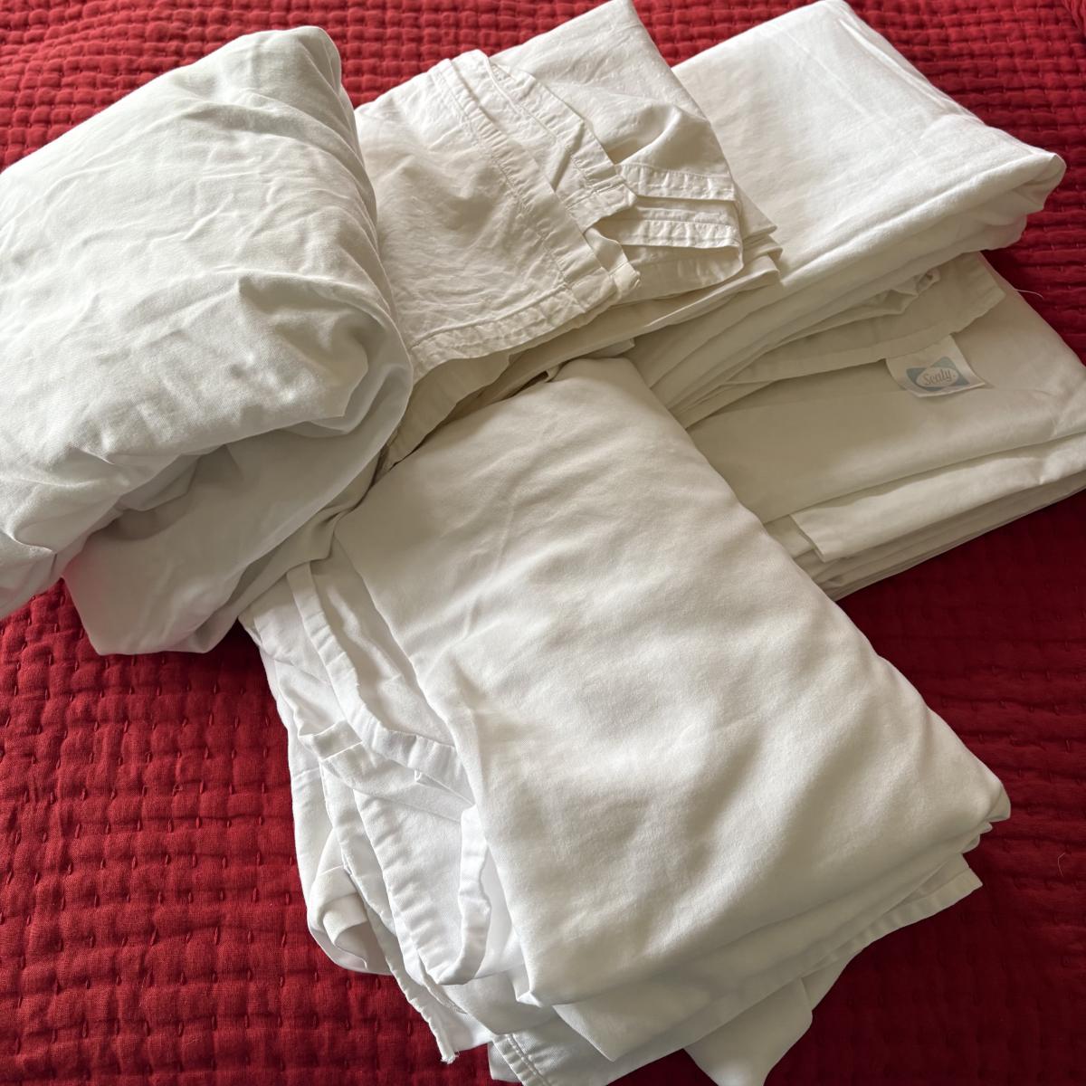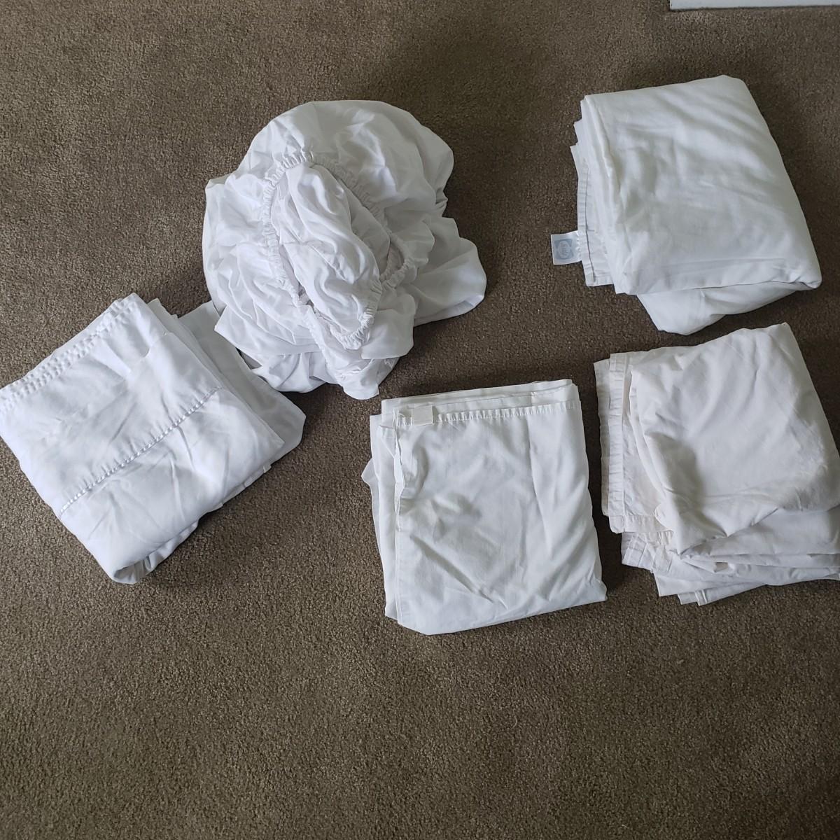 Spread has a quilted look and is cotton-poly blend. Shams fit standard pillows and have tie closures (pillows and bed not included; bed frame for sale in different lot). Mixed lot sheets include four flat sheets and one fitted sheet. One set of flat and fitted match. Shipping available.