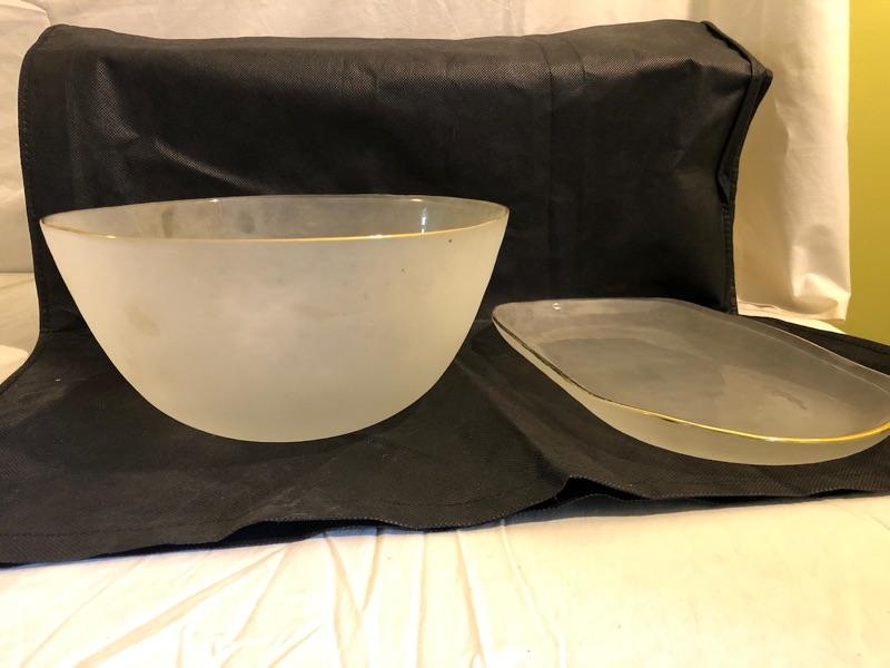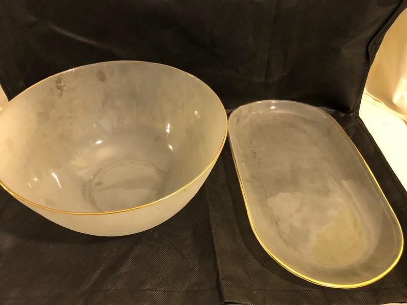2 frosted glass serving dishes with gold trim platter is 8in x 14.5 and serving bowl is 11.5in diameter x 5.5in tall