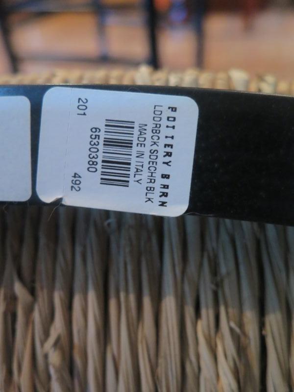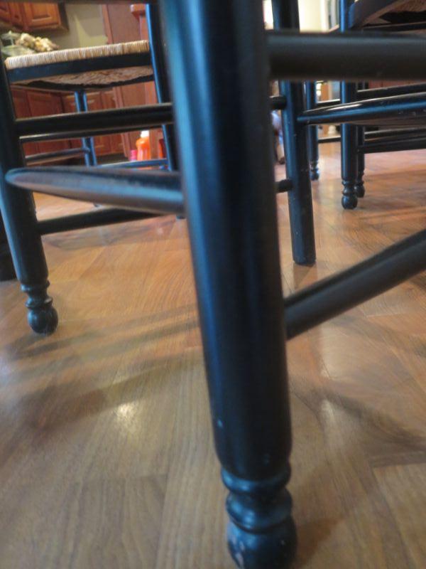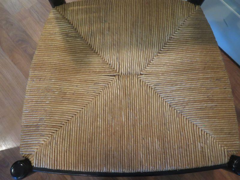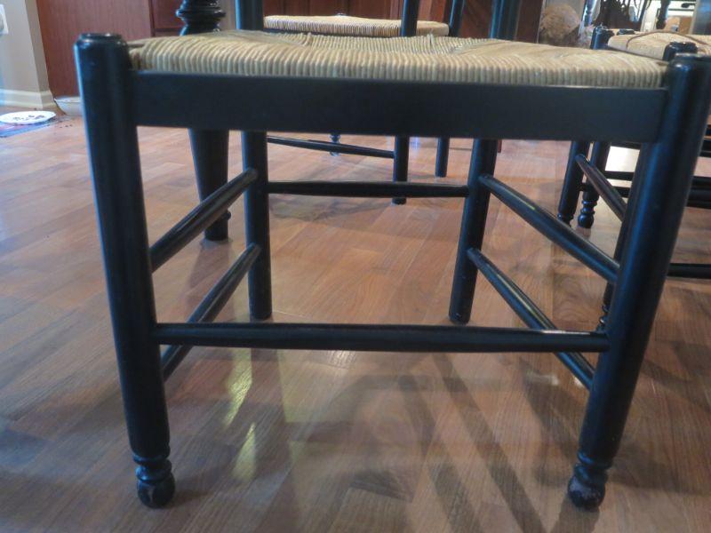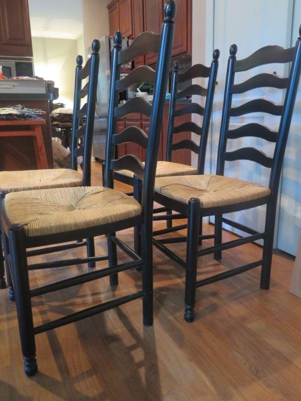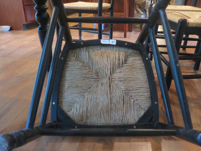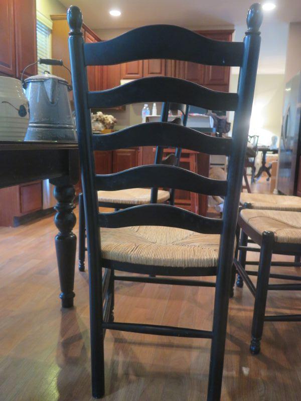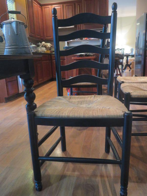 Lightly distressed black ladder-back rushed chairs (4) and farmhouse table. Made in Italy. Table is 72x40x30. **Please read Terms and Conditions before placing a bid. Pick up is Sunday, September 1, 2019 from 10am to 4pm in Williamstown. All sales are final. All sales are as is, where is. Please review all photos. Any props included in photos are not included in listing. All measurements are approximate. Comes from home with cats.