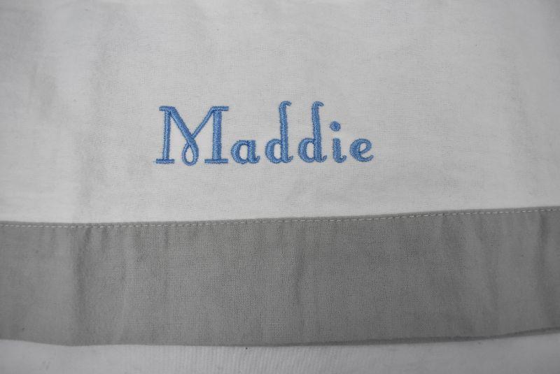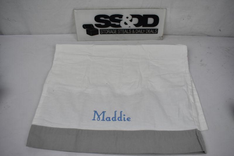 Pottery Barn Teen Stand Size Flannel Pillow Case, white & gray with Blue "Maddie" embroidered