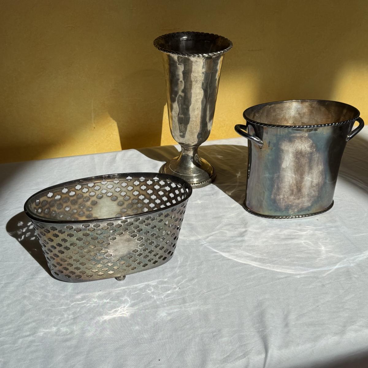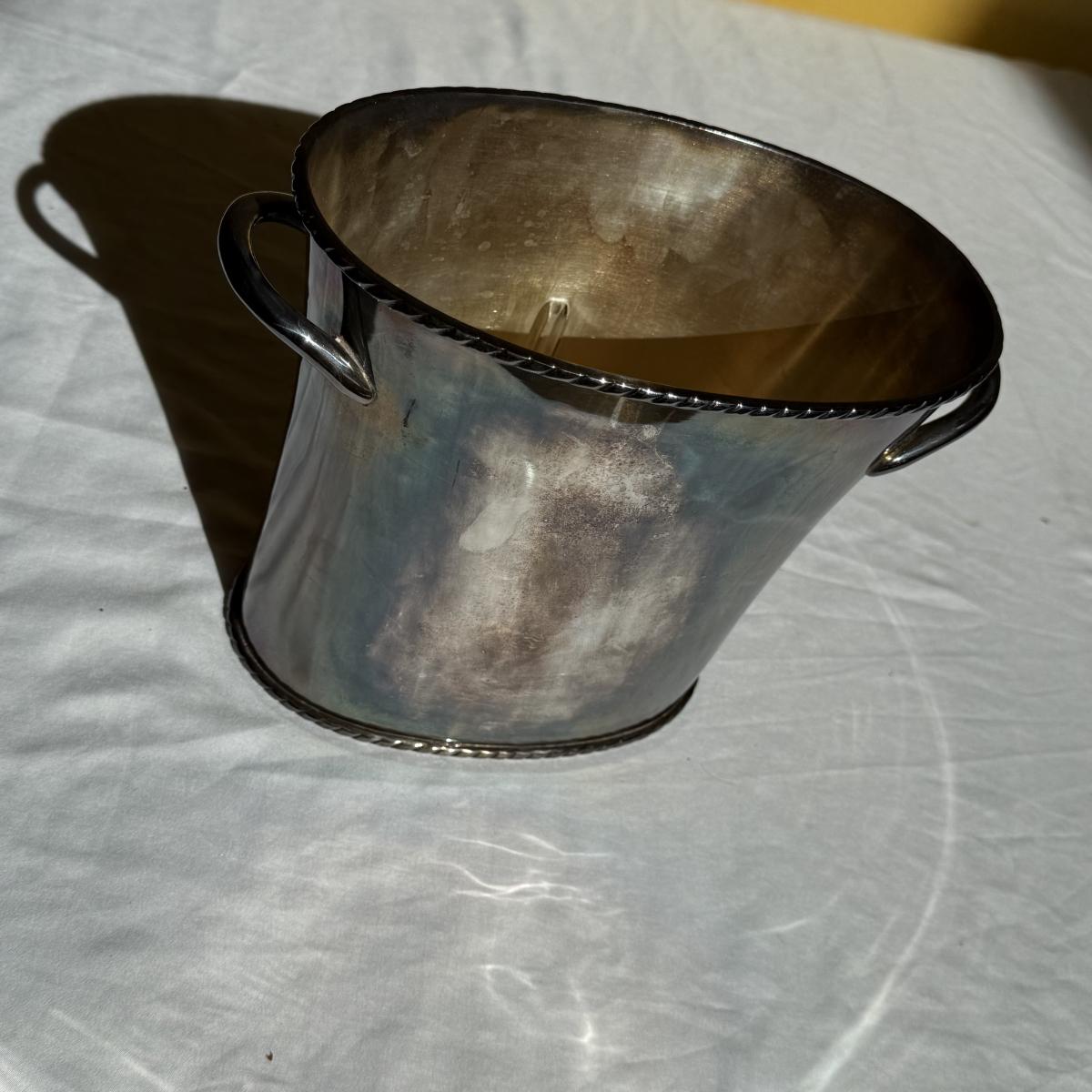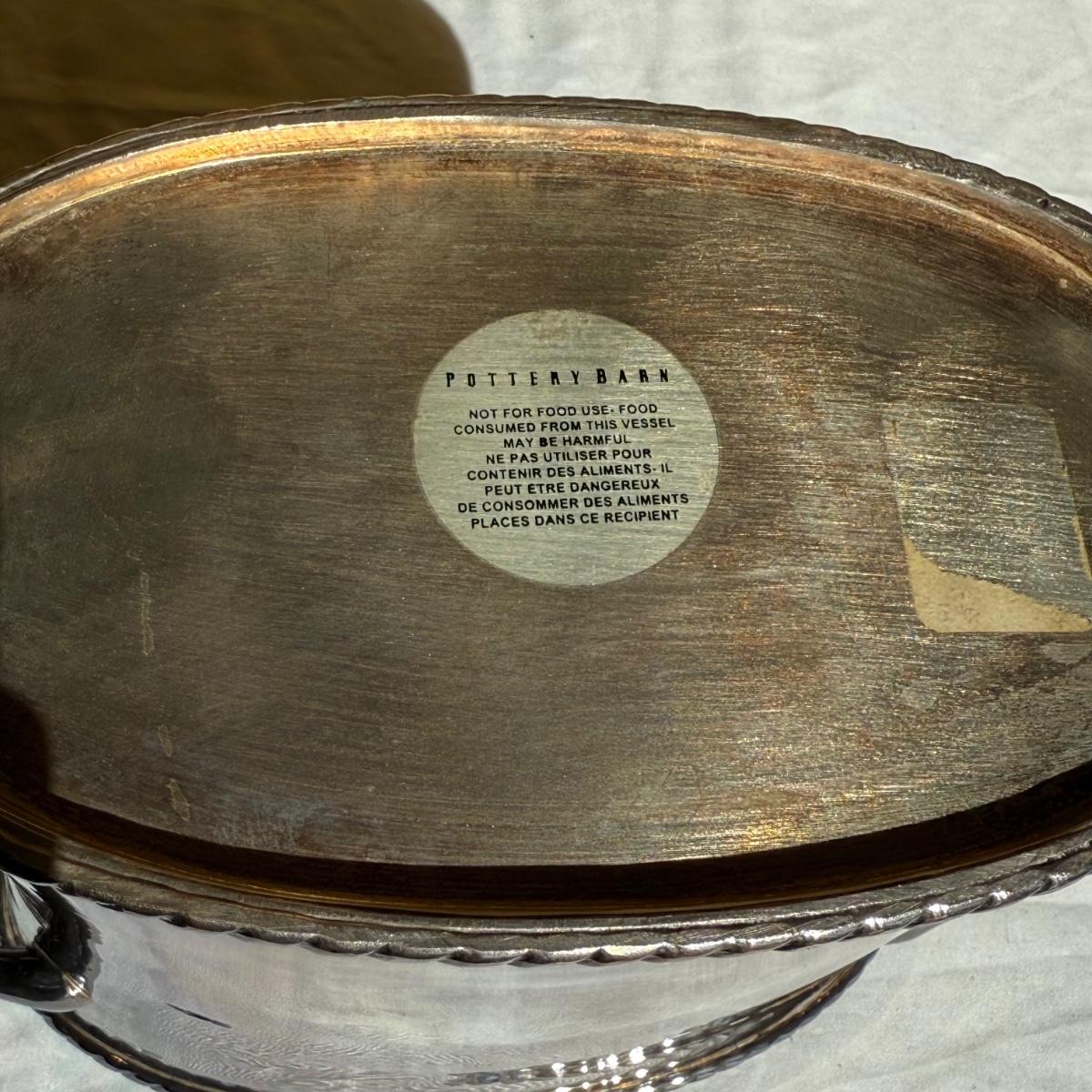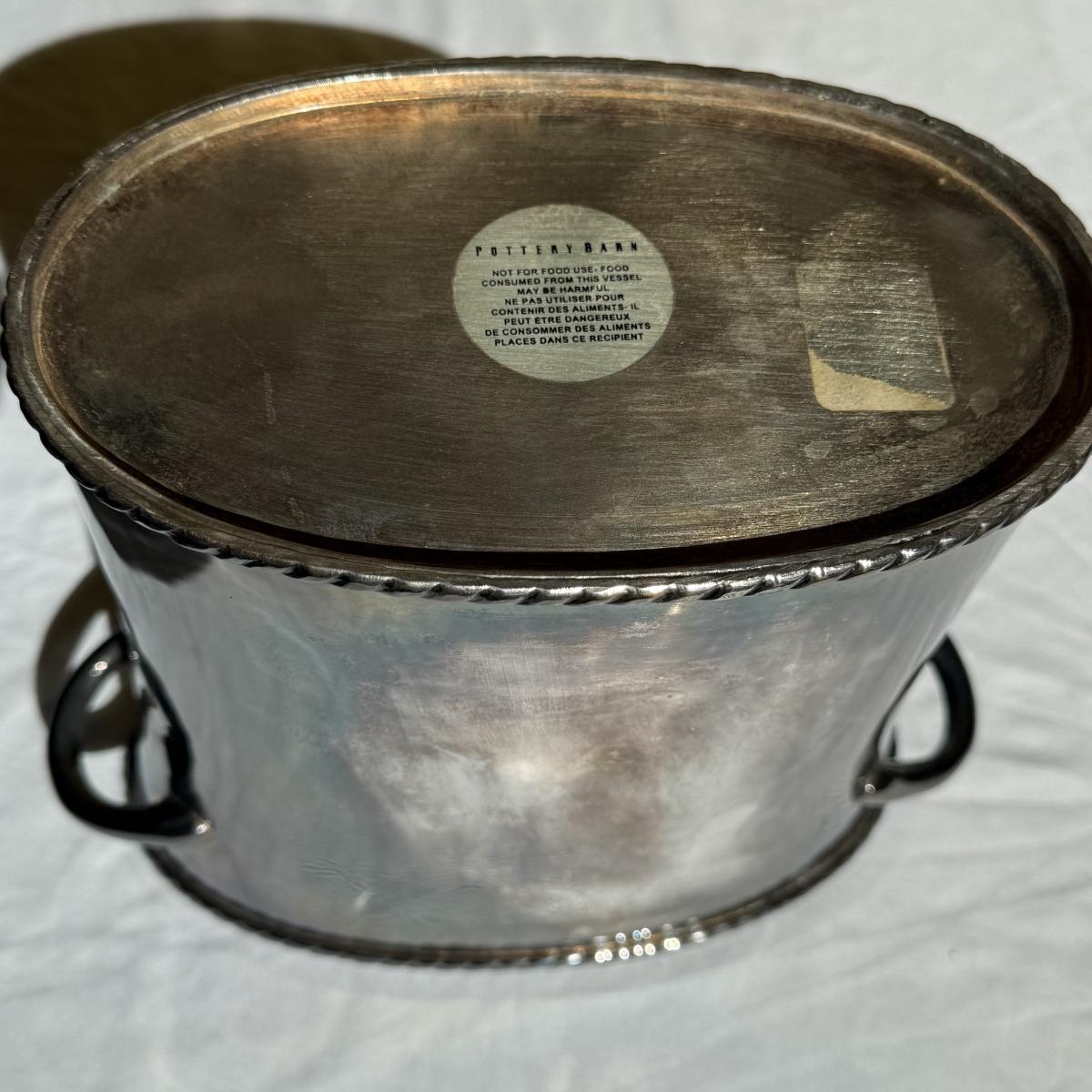 This lot contains three items all of which are different metal vessels that could be used at vases. This first is a pottery barn what appears to be silver plated oval vase. It measures 7.5” x 4.5” at the base and 8”H. Spot test seems to prove that tarnish could be removed with polish, see pictures for details. Next is an Andrea by Sadek what appears to be silver plated trophy style vase. It has a 5”D at the base, a 6”D at the mouth and stands 11.5”H. Again, spot test seems to prove that tarnish could be removed with polish. Last is another oval, what appears to be silver plated vessel that stands on four feet and is lined with another glass vessel. It measures 10” x 5.5” at the mouth and stands 5.5”H.