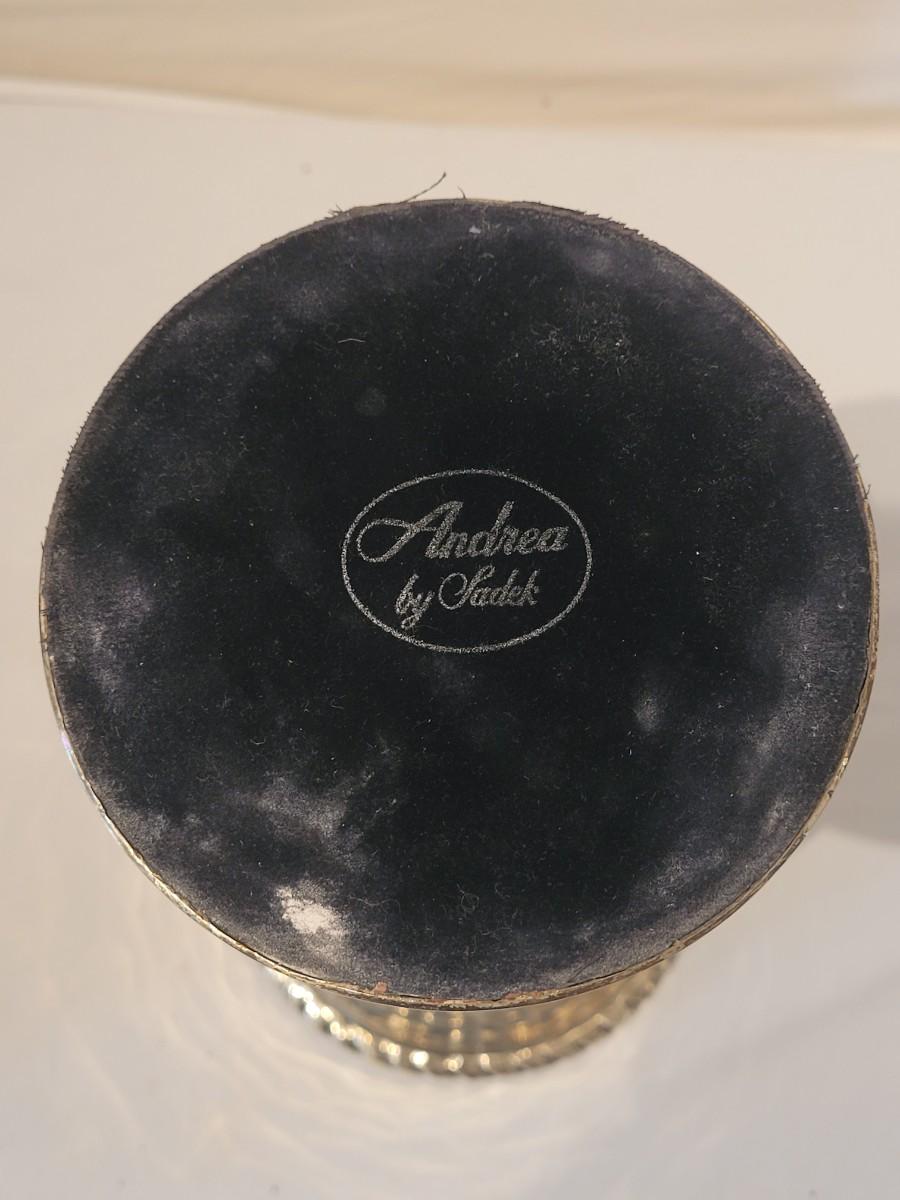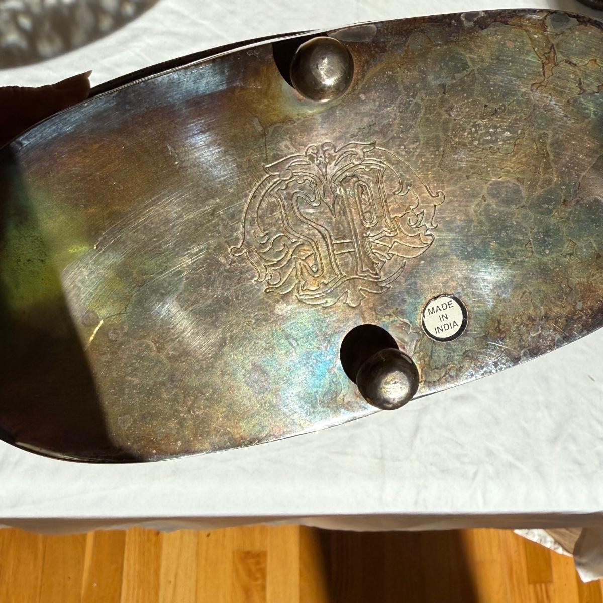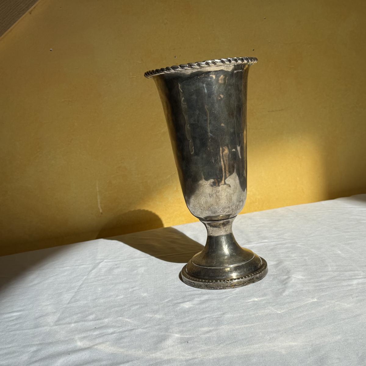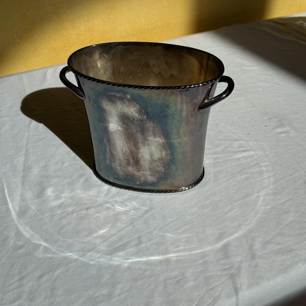 This lot contains three items all of which are different metal vessels that could be used at vases. This first is a pottery barn what appears to be silver plated oval vase. It measures 7.5” x 4.5” at the base and 8”H. Spot test seems to prove that tarnish could be removed with polish, see pictures for details. Next is an Andrea by Sadek what appears to be silver plated trophy style vase. It has a 5”D at the base, a 6”D at the mouth and stands 11.5”H. Again, spot test seems to prove that tarnish could be removed with polish. Last is another oval, what appears to be silver plated vessel that stands on four feet and is lined with another glass vessel. It measures 10” x 5.5” at the mouth and stands 5.5”H.