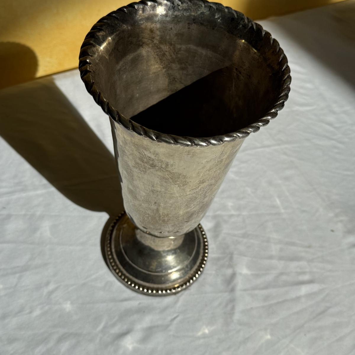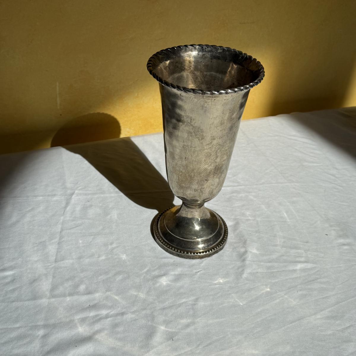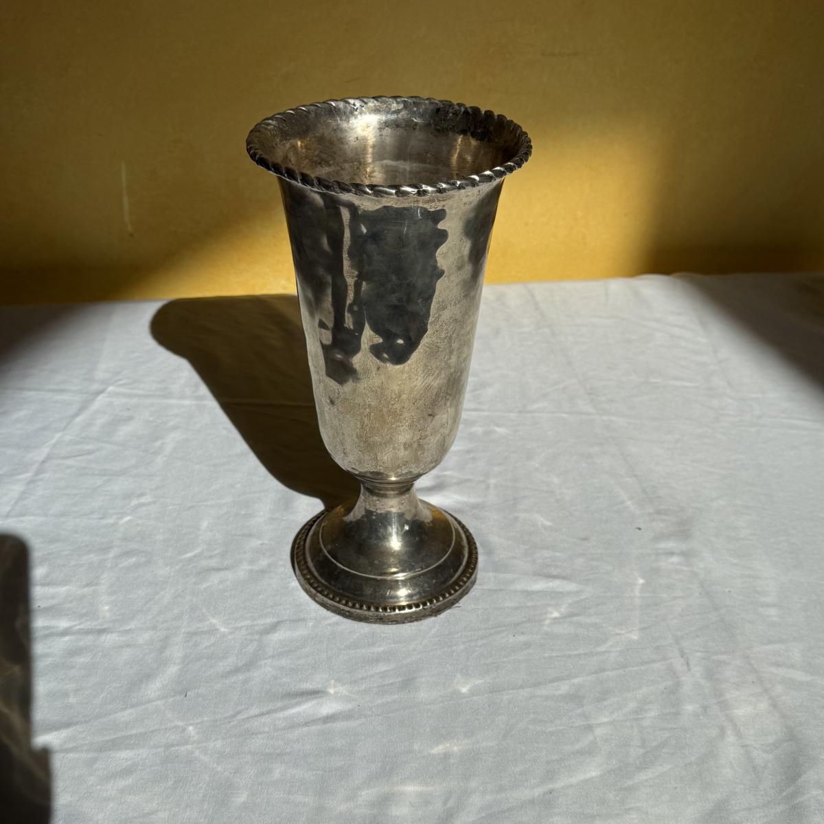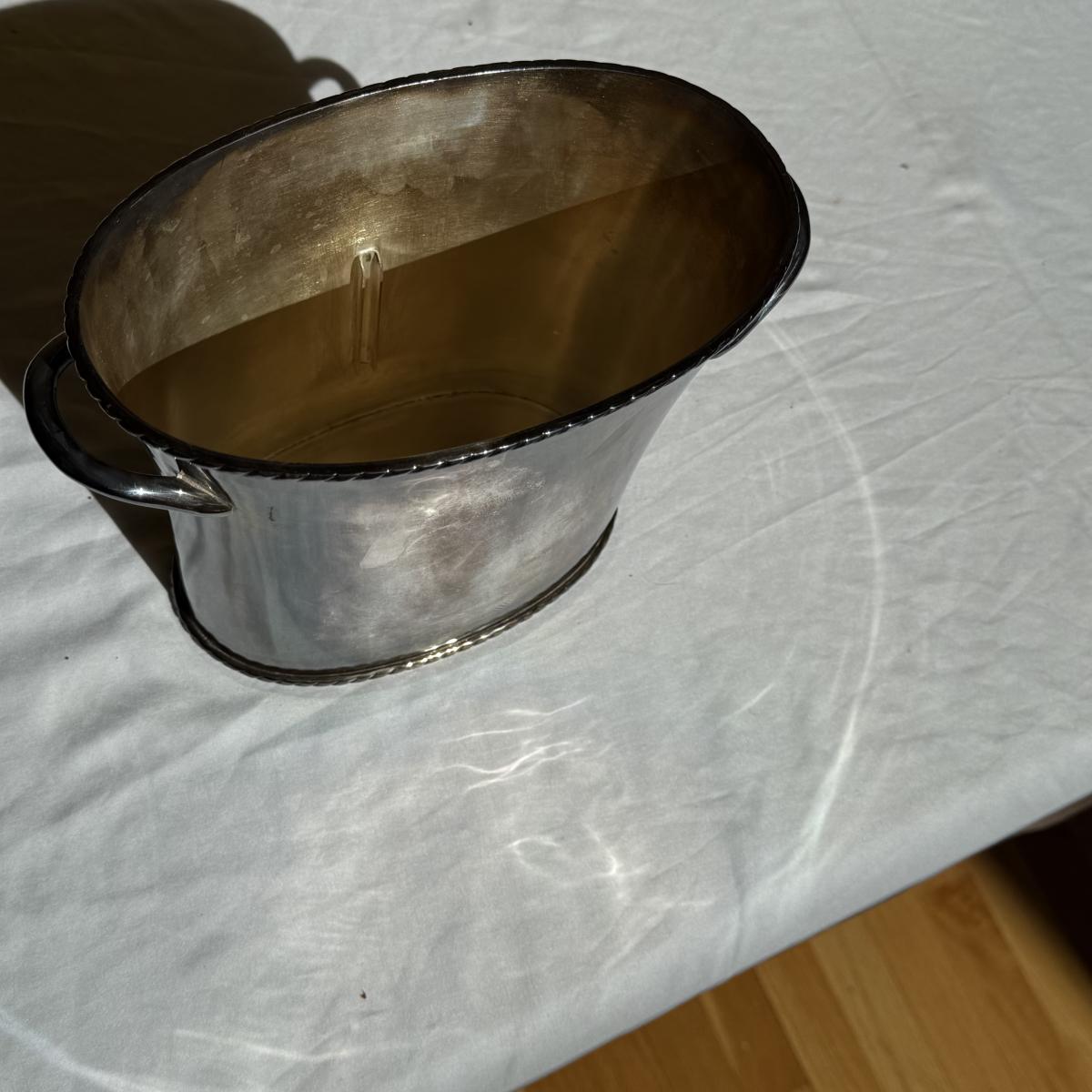 This lot contains three items all of which are different metal vessels that could be used at vases. This first is a pottery barn what appears to be silver plated oval vase. It measures 7.5” x 4.5” at the base and 8”H. Spot test seems to prove that tarnish could be removed with polish, see pictures for details. Next is an Andrea by Sadek what appears to be silver plated trophy style vase. It has a 5”D at the base, a 6”D at the mouth and stands 11.5”H. Again, spot test seems to prove that tarnish could be removed with polish. Last is another oval, what appears to be silver plated vessel that stands on four feet and is lined with another glass vessel. It measures 10” x 5.5” at the mouth and stands 5.5”H.