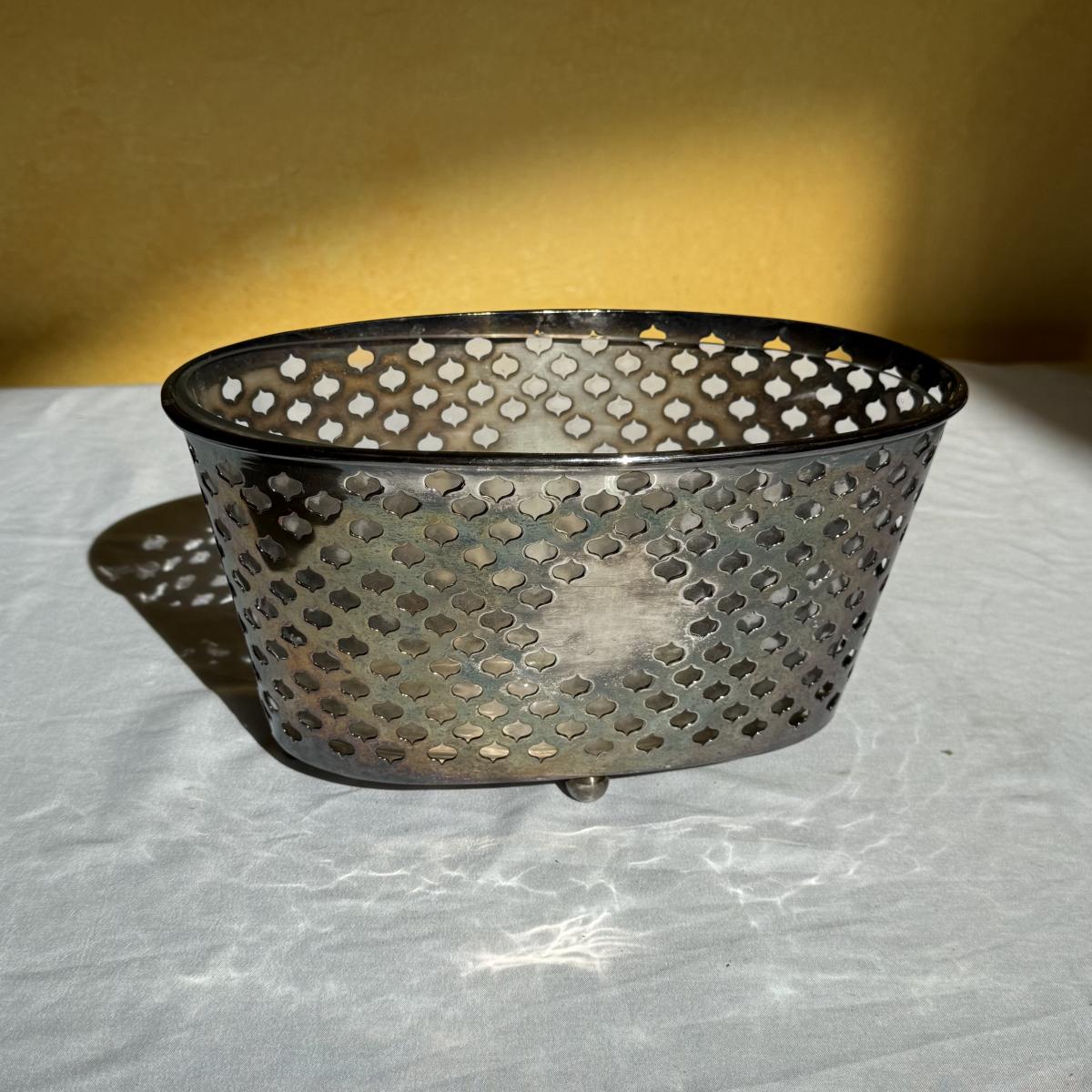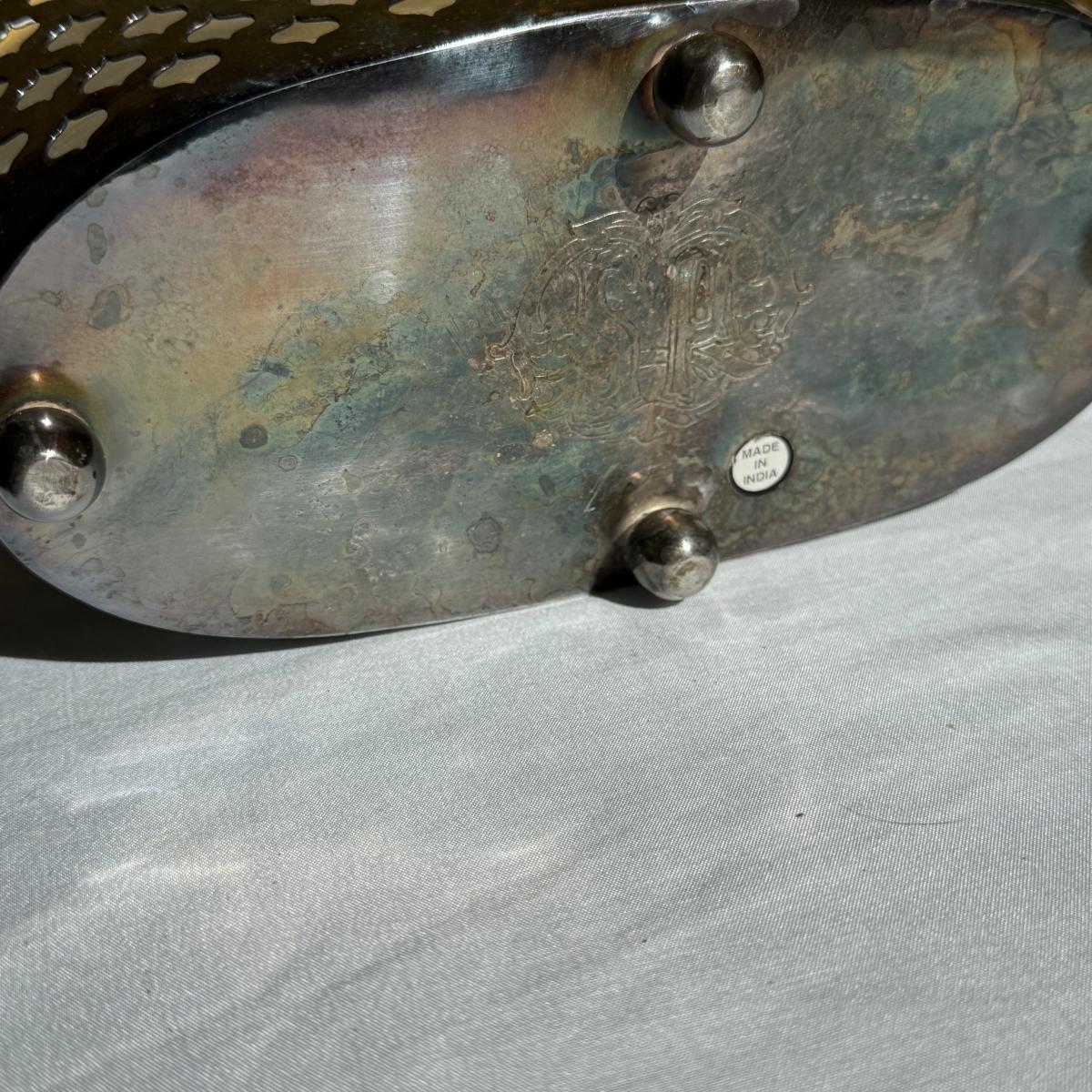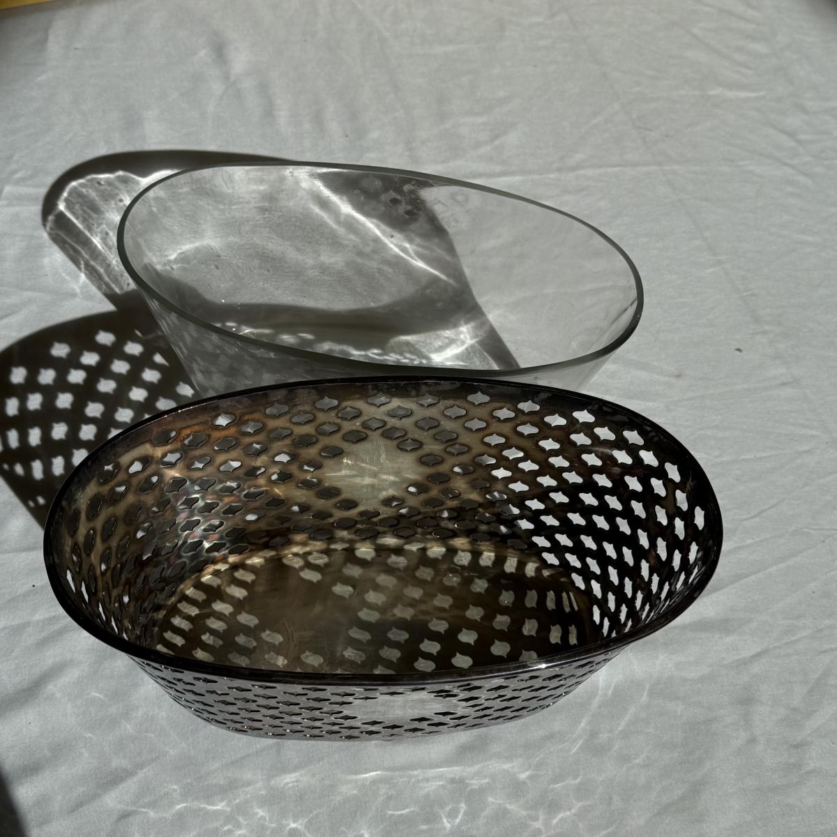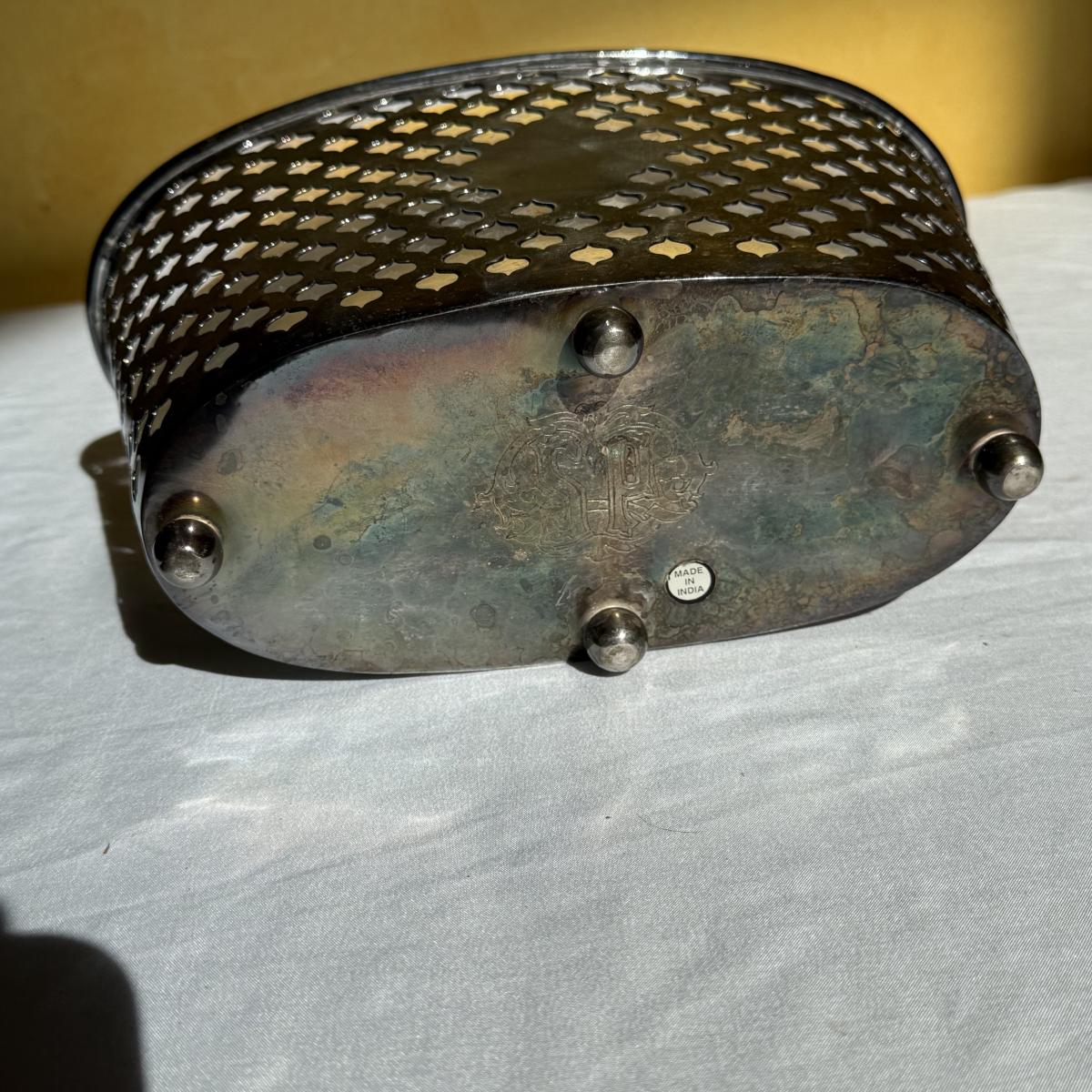 This lot contains three items all of which are different metal vessels that could be used at vases. This first is a pottery barn what appears to be silver plated oval vase. It measures 7.5” x 4.5” at the base and 8”H. Spot test seems to prove that tarnish could be removed with polish, see pictures for details. Next is an Andrea by Sadek what appears to be silver plated trophy style vase. It has a 5”D at the base, a 6”D at the mouth and stands 11.5”H. Again, spot test seems to prove that tarnish could be removed with polish. Last is another oval, what appears to be silver plated vessel that stands on four feet and is lined with another glass vessel. It measures 10” x 5.5” at the mouth and stands 5.5”H.