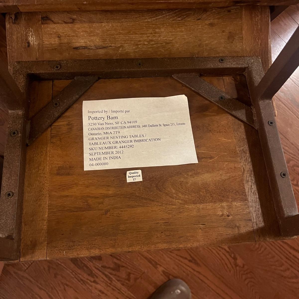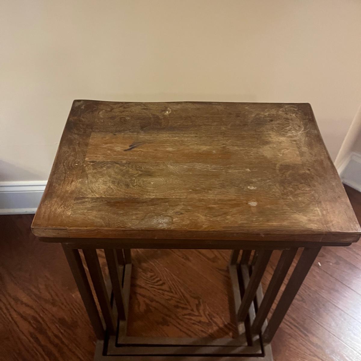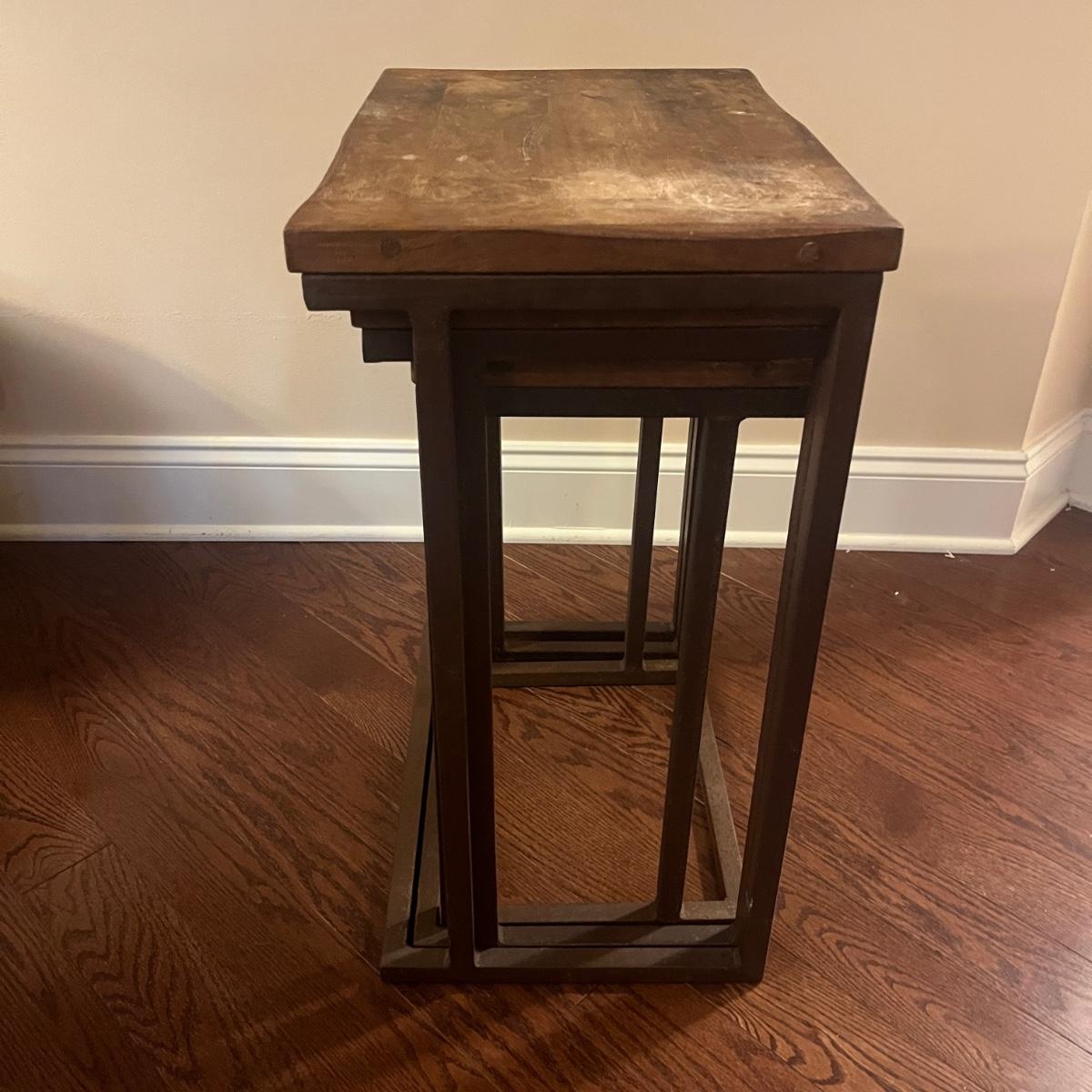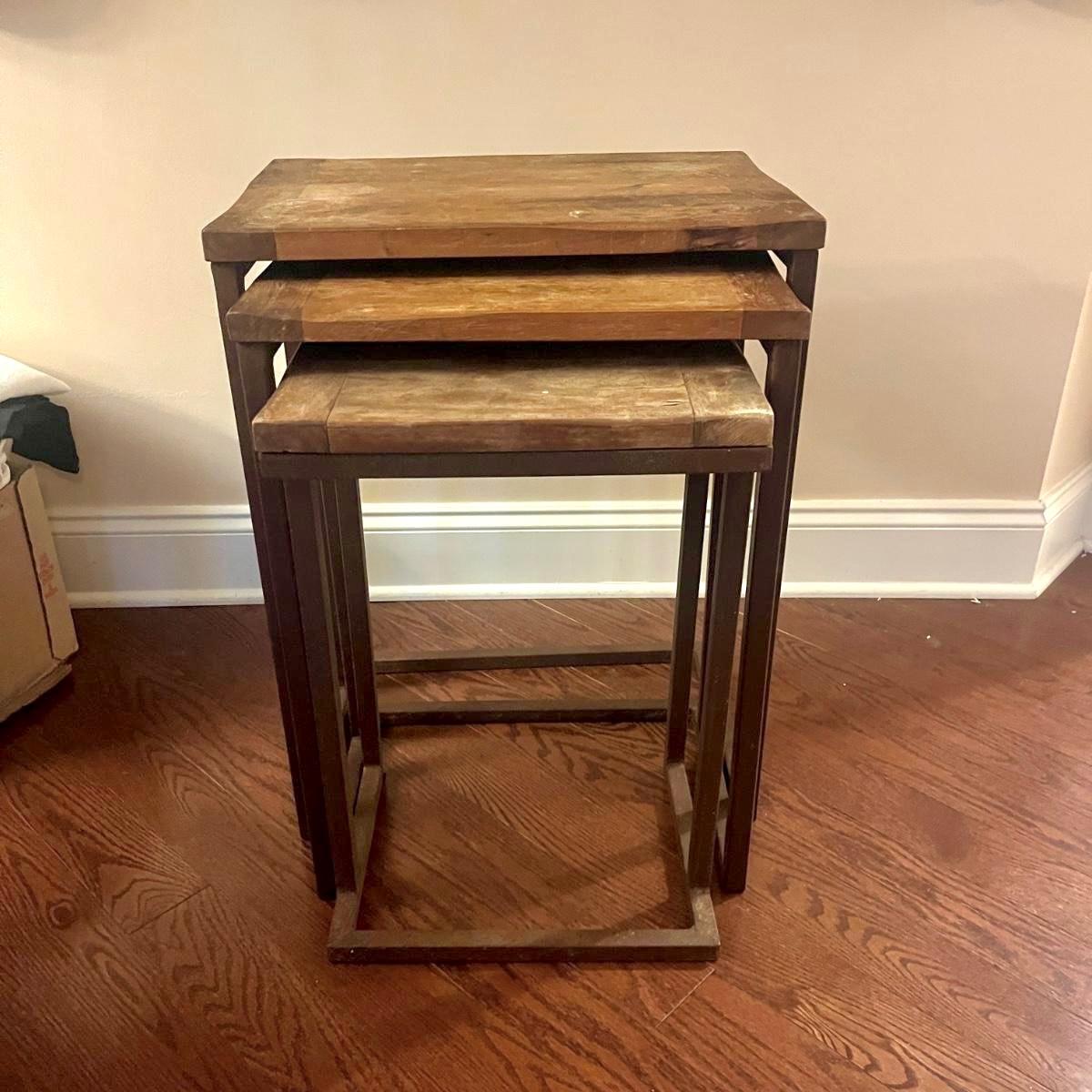 Lot includes a trio of Pottery Barn wood and metal nesting tables. Largest table measures 18” x 12” x 24”H.