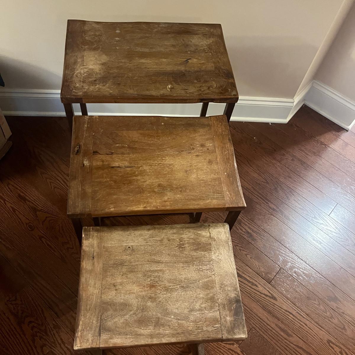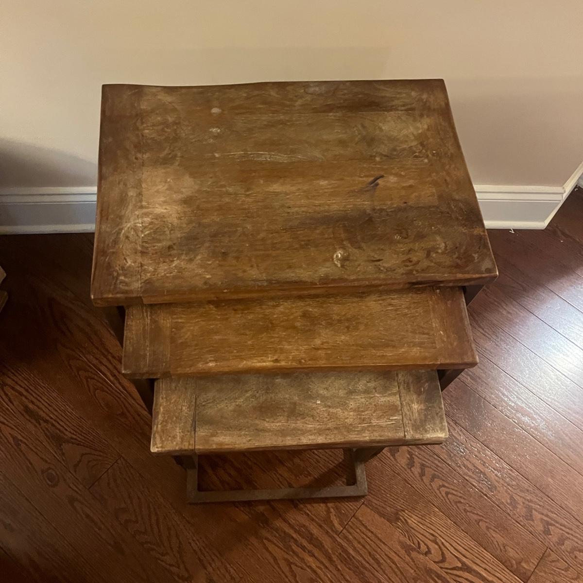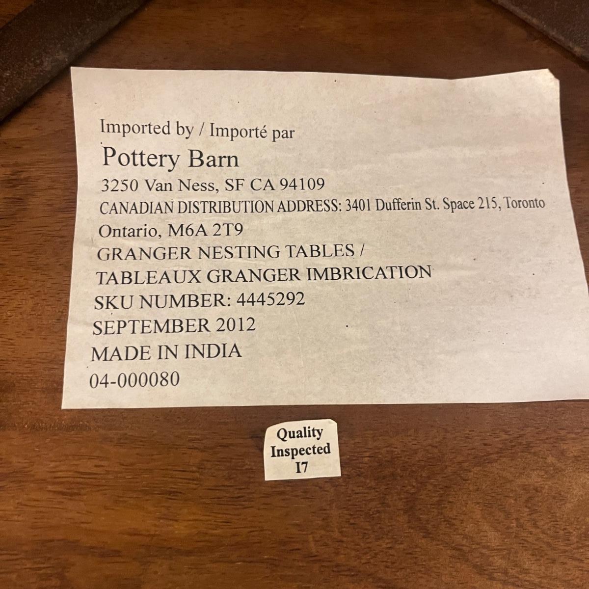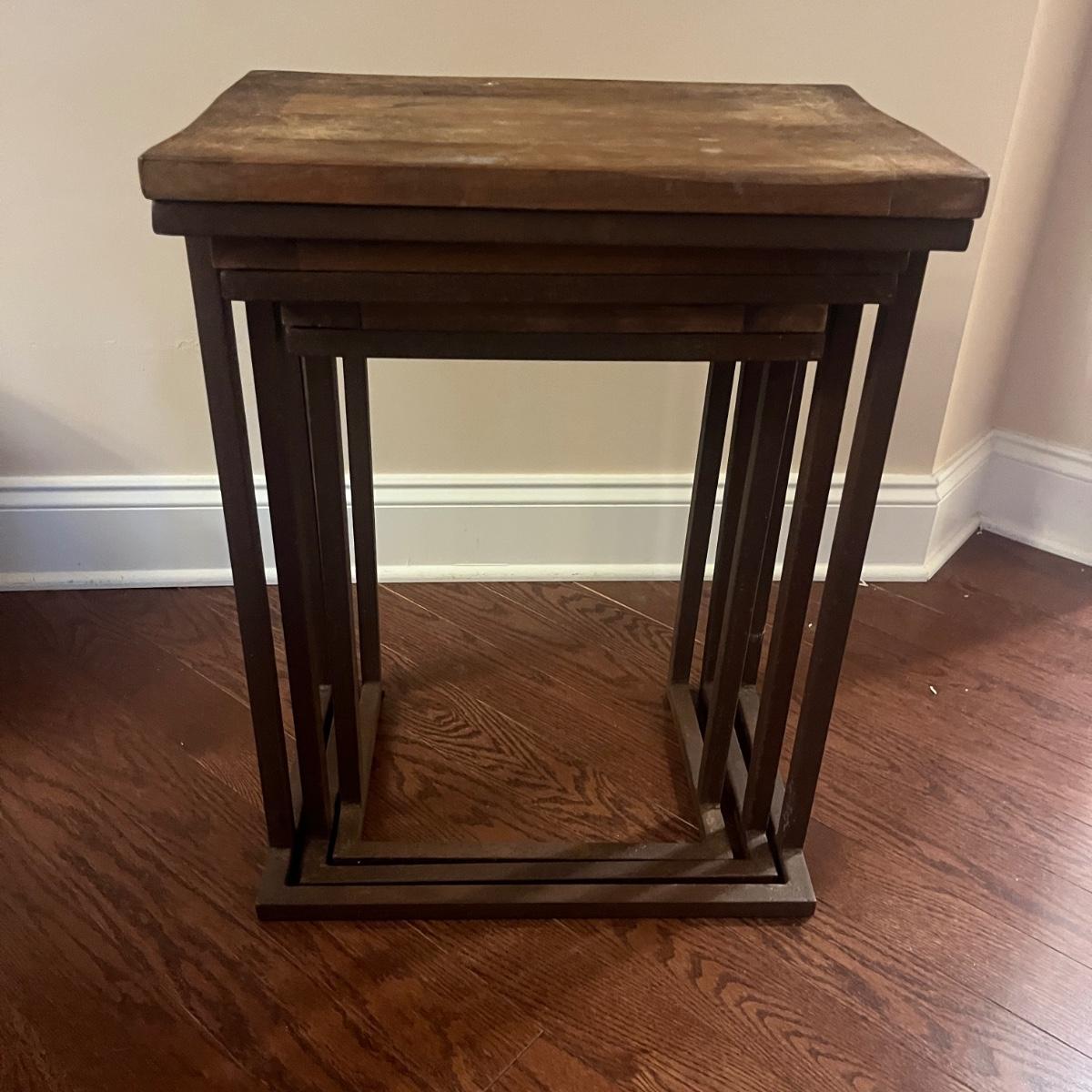 Lot includes a trio of Pottery Barn wood and metal nesting tables. Largest table measures 18” x 12” x 24”H.