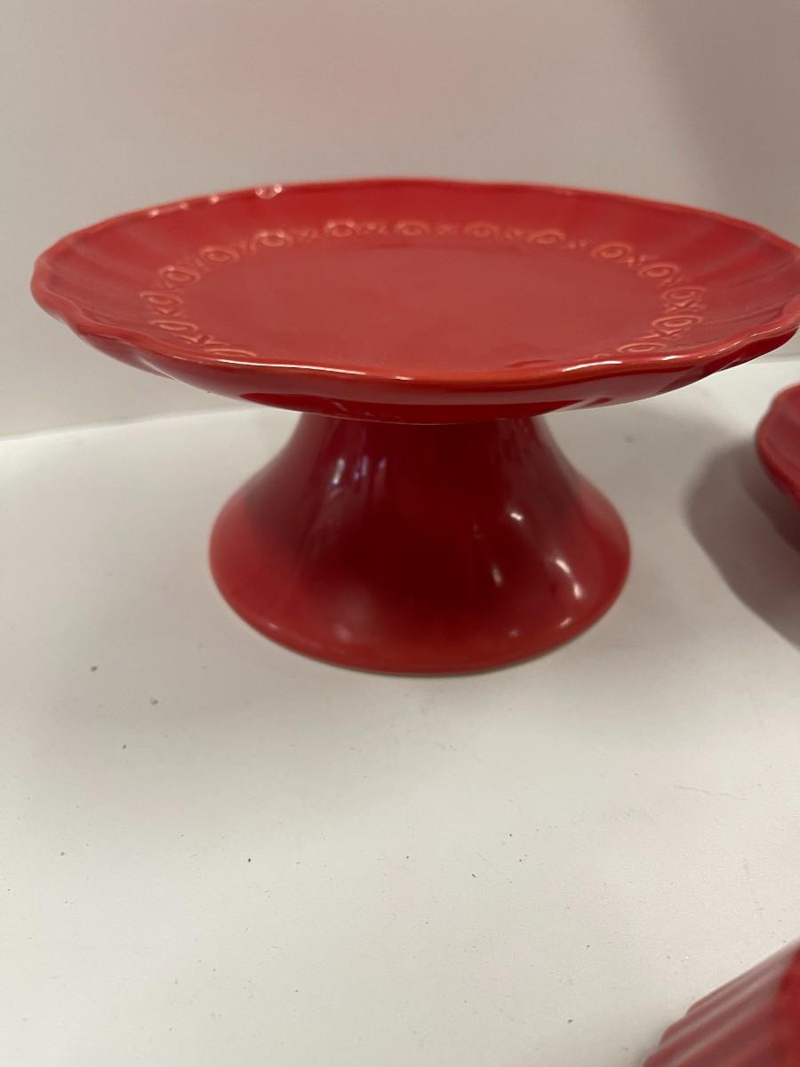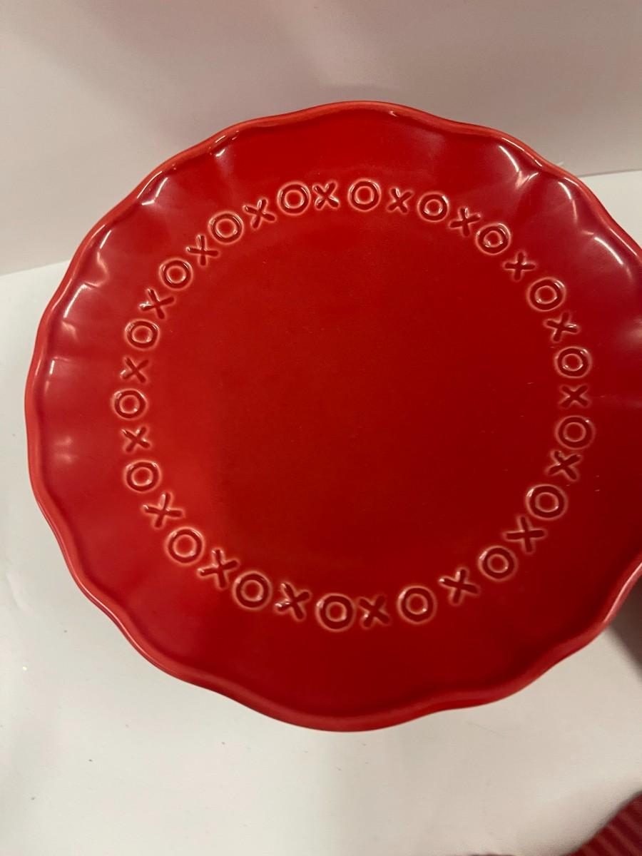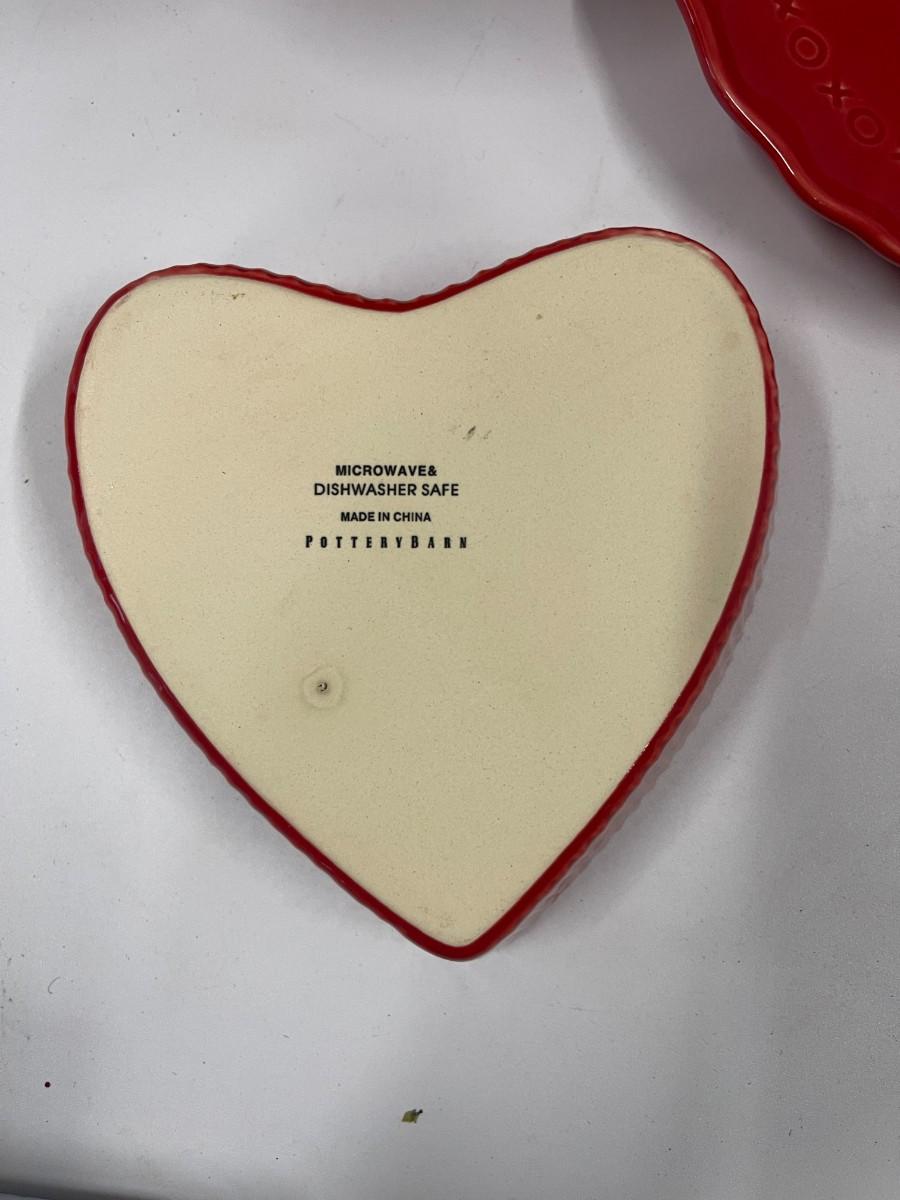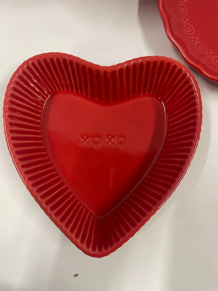 Pottery Barn XOXO Valentine's dishes: small cake plate, two plates and one heart shaped large ramekin.