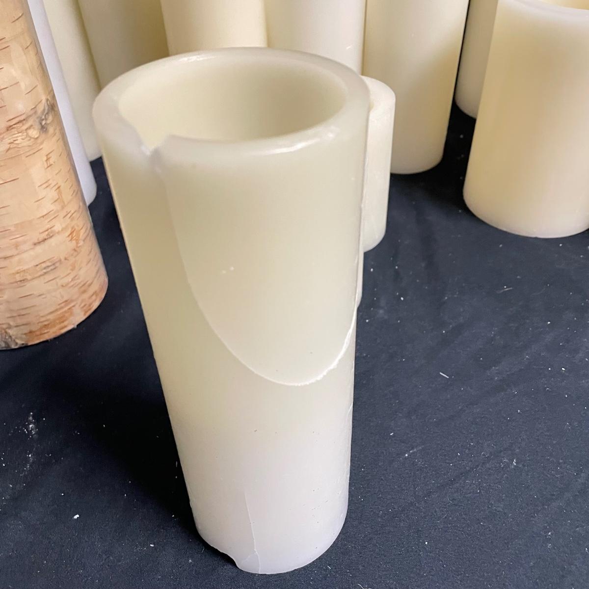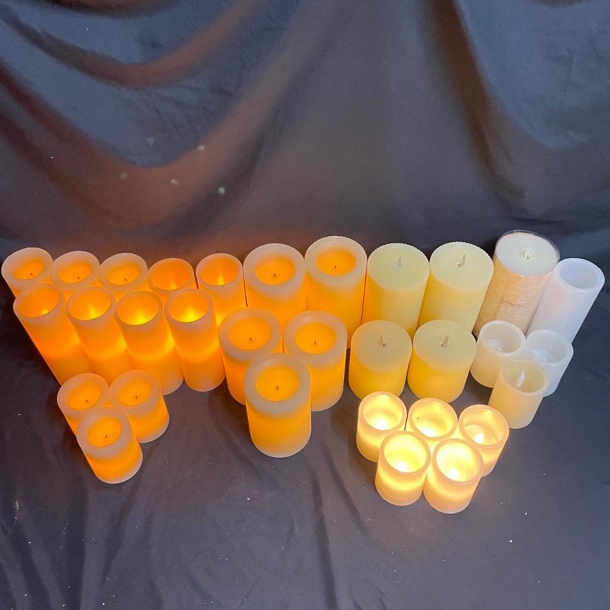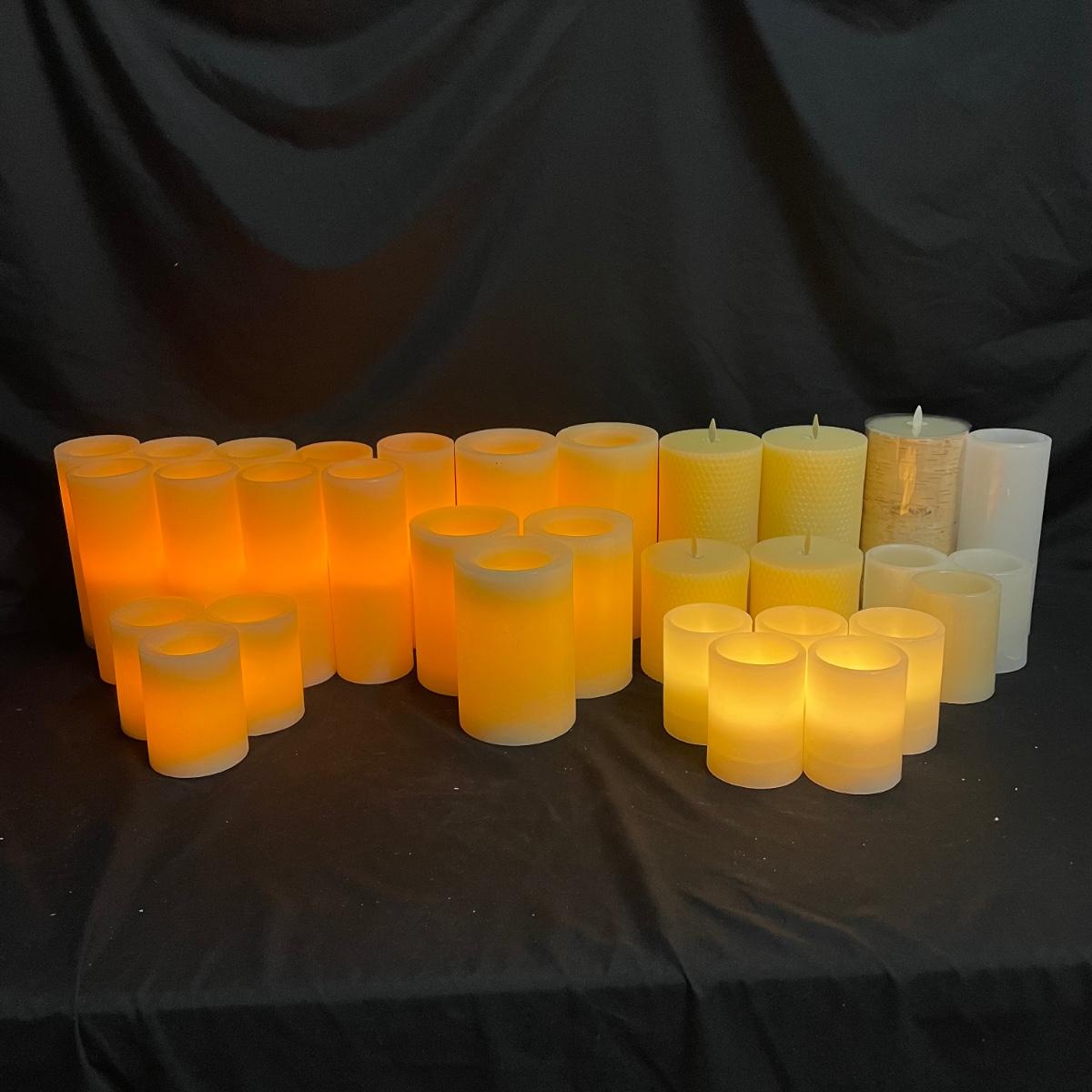Four, likely unused, Luminara flameless candles with another unused birch-designed candle. Lot includes 26 more ivory/off white flameless candles. Photos show which candles turned on, the Luminara set does not contain batteries yet, therefore they were not tested, others either need new batteries or will have to be used as unlit decor only. Some show minor oxidation in the battery compartment, we suggest the winning bidder replaces batteries immediately after purchase. One small 4”H candle has wires exposed near its “flame”, another tall candle has a significant crack and chip. See images. Other candles appear to be in nice shape. The largest candles are 4”D x 8”H. Local pick up only.