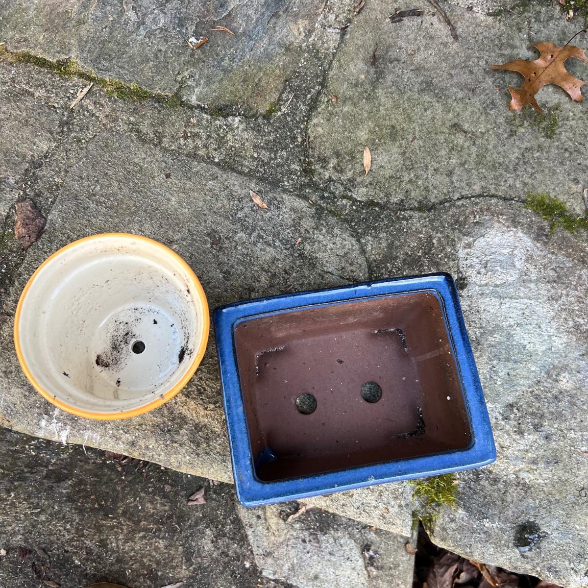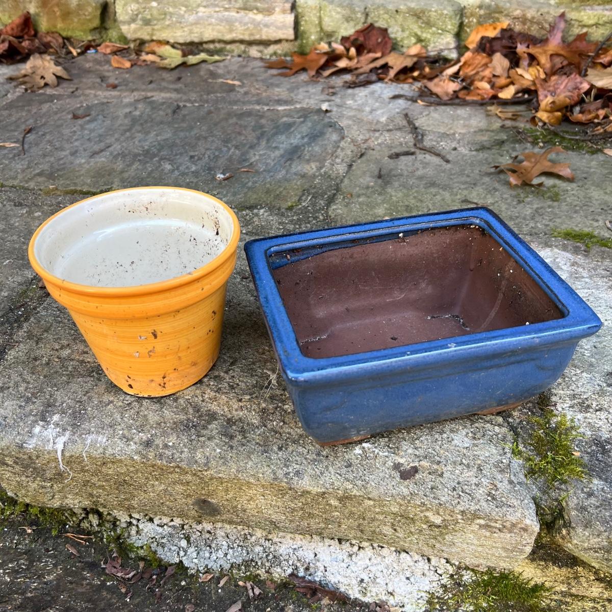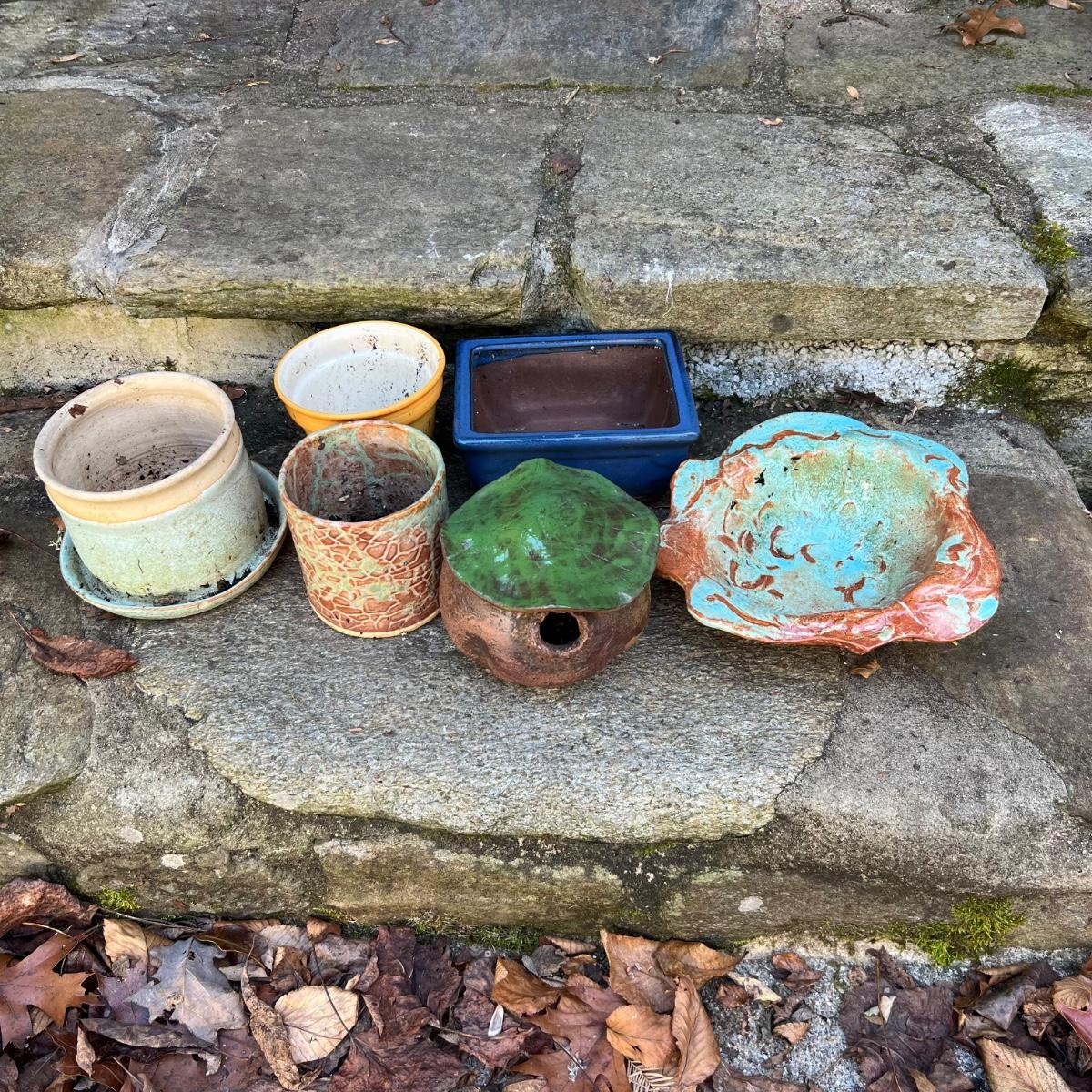 Four small ceramic plant pots all have drainage holes. The attractive pottery bowl appears to be handmade with a turquoise and rust colored glaze; it was being used as a small bird bath. The pottery birdhouse has holes in the back which would likely be to hang it up, it measures 6”D x 4”H.