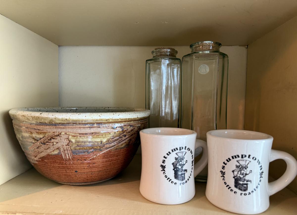Pottery bowl, coffee mugs, pasta noodle glass containers