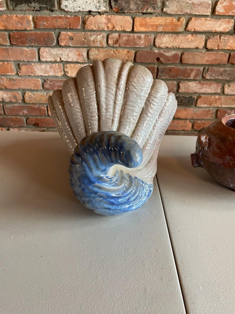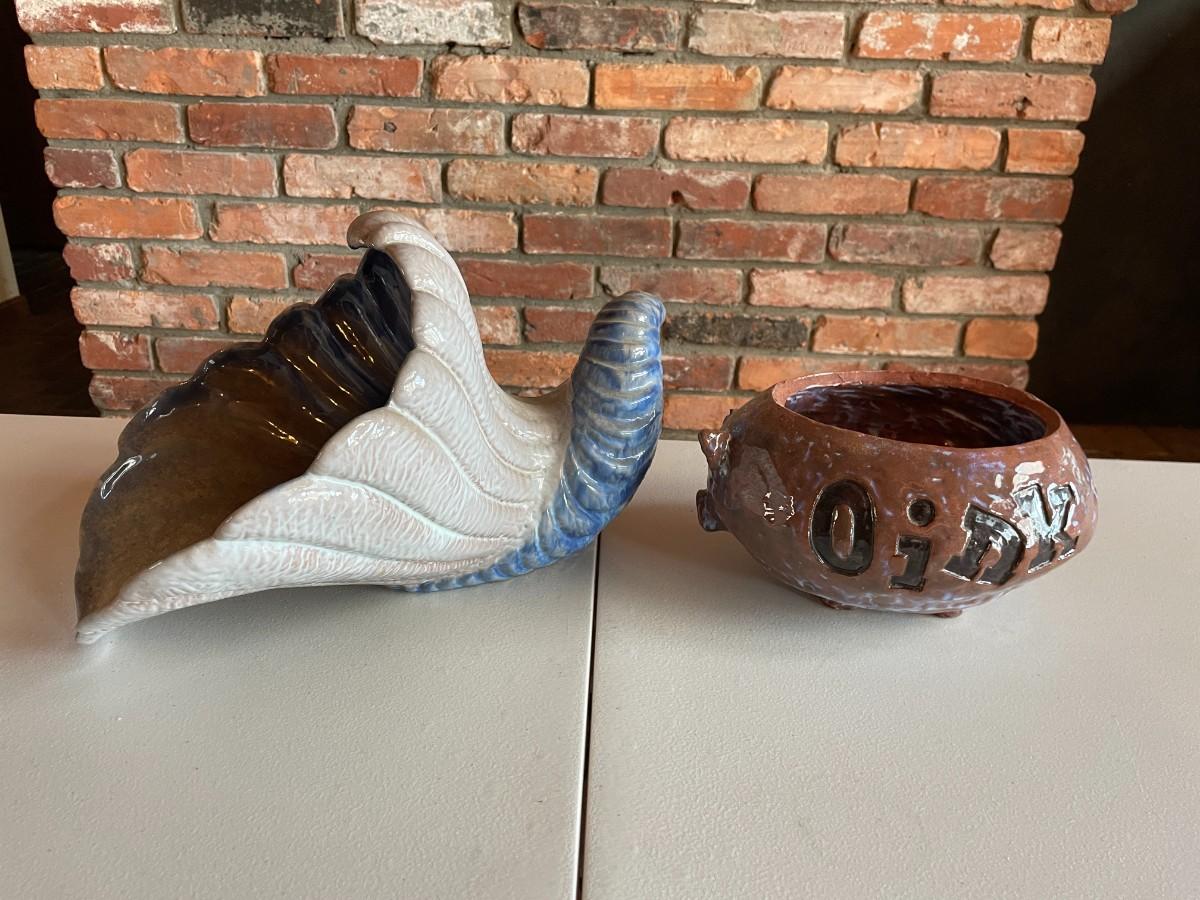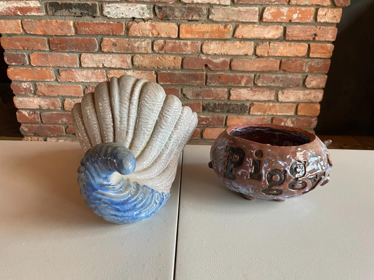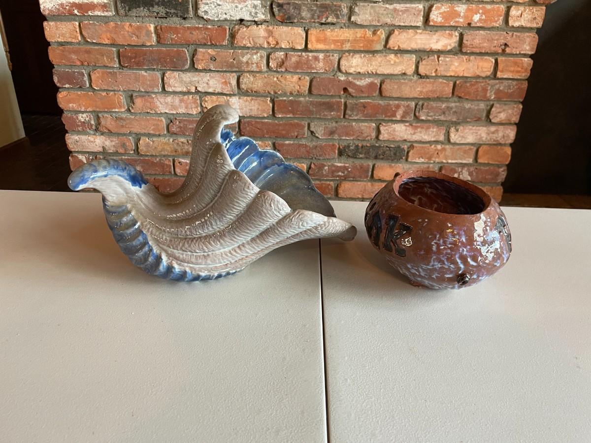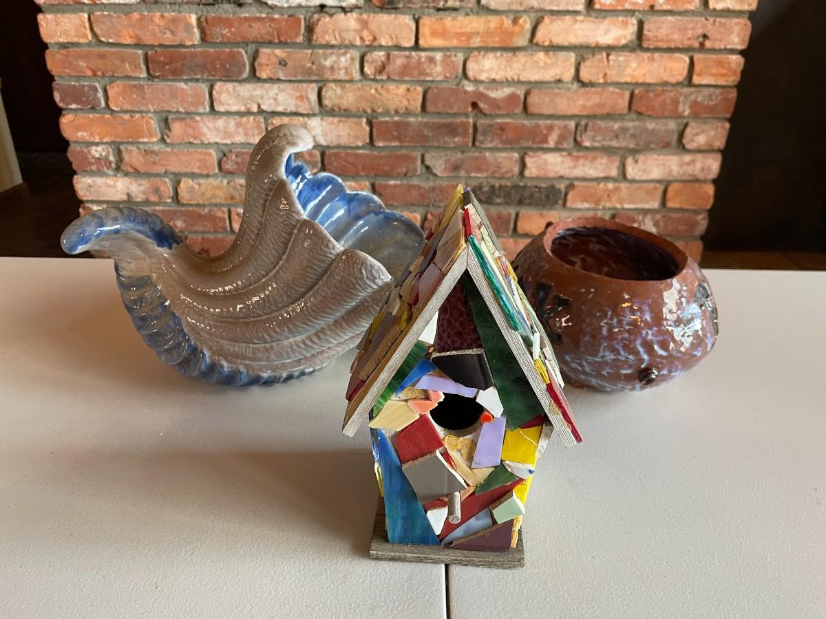 Shells shaped bowl, bird house tile art and brown trinket bowl.