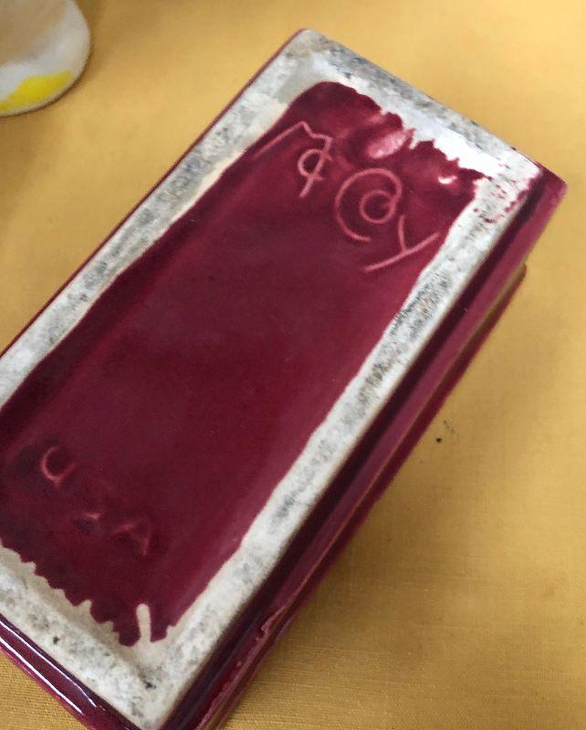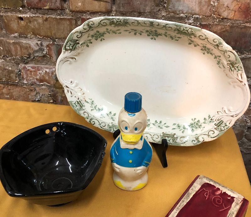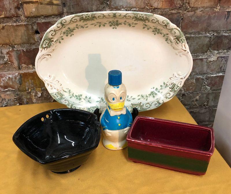 Here is an antique serving platter..a contemporary Utah made pottery bowl...a McCoy planter and a vintage Donald Duck shampoo bottle...