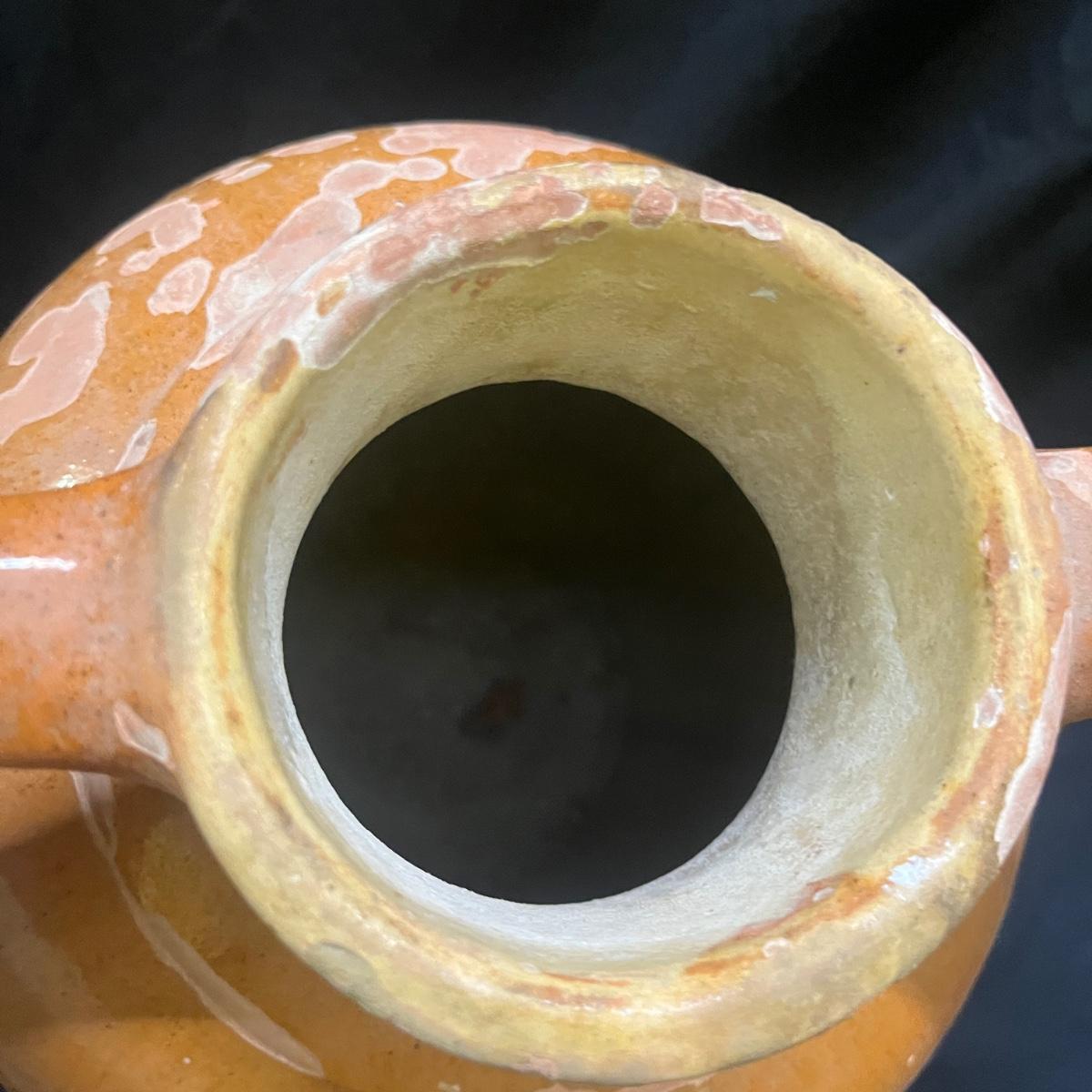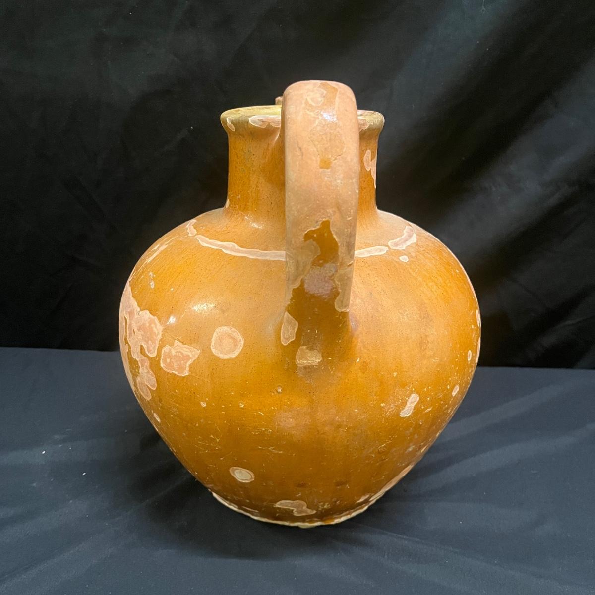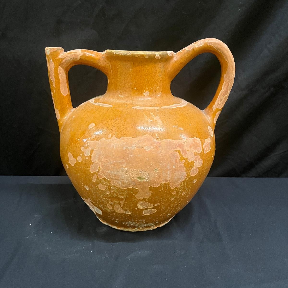 Lot includes a yellow glazed jug that appears to be antique Earthenware, possibly a French water cruche 'orjol'. Jug measures 12”D x 12”H. Due to its age, it has glaze coming off in places and has one deep chip, see pictures.