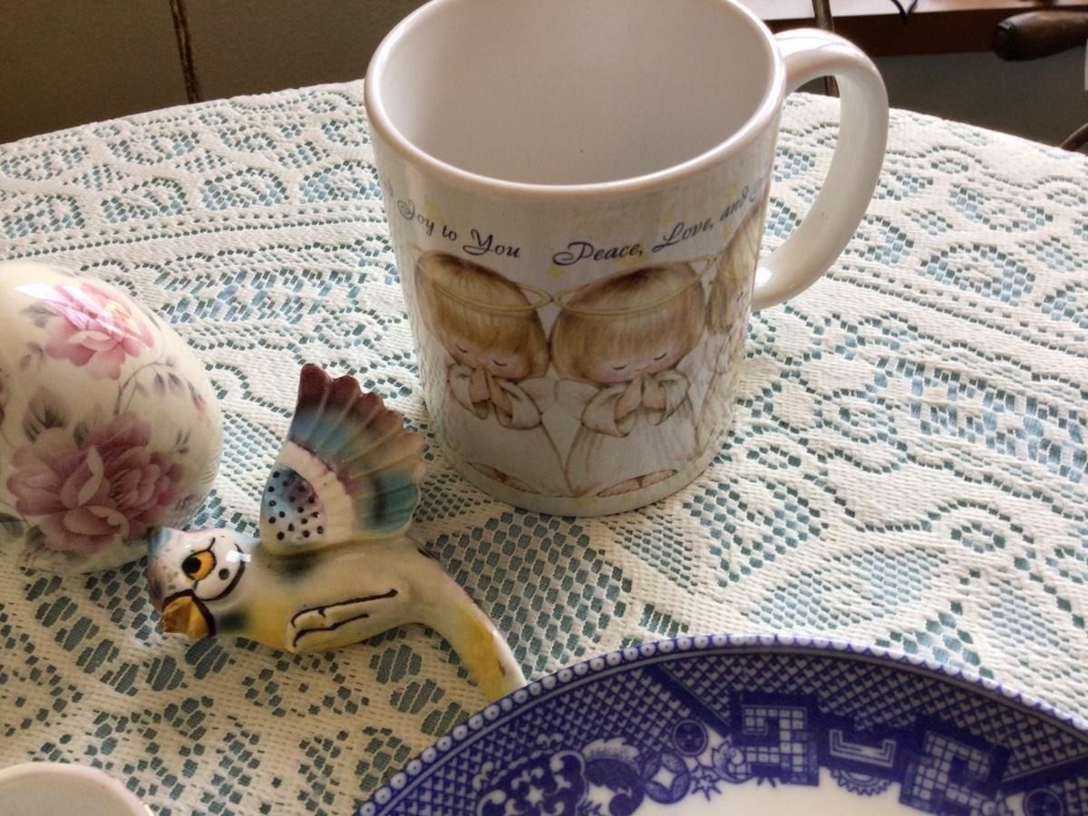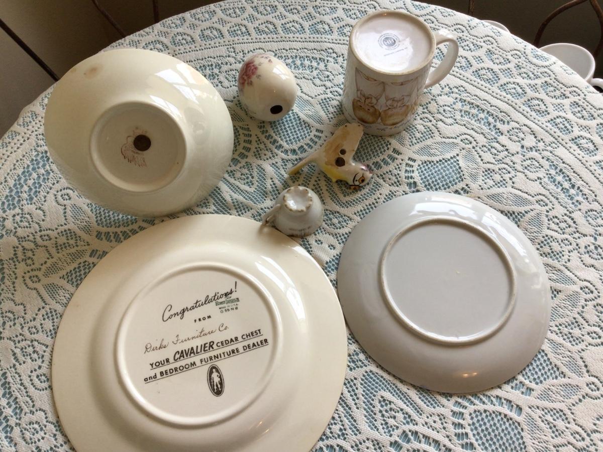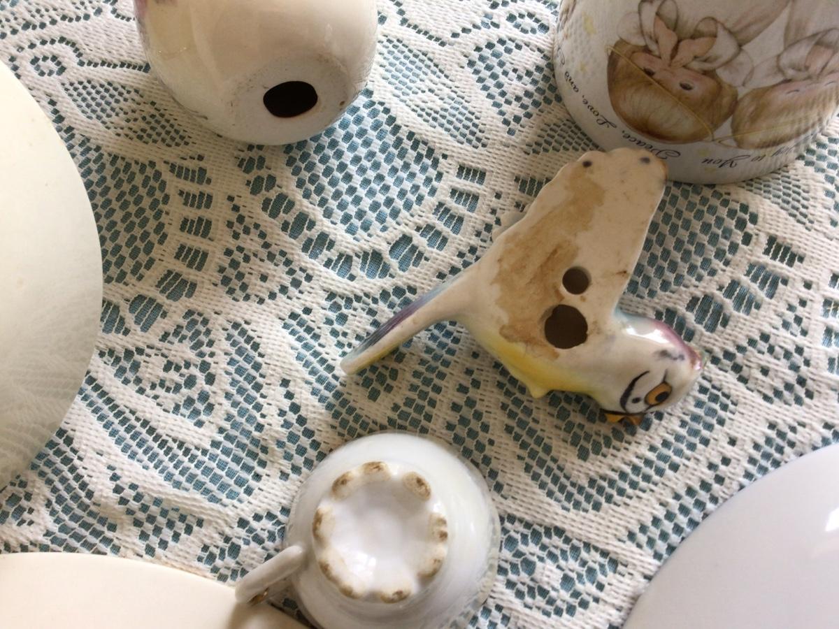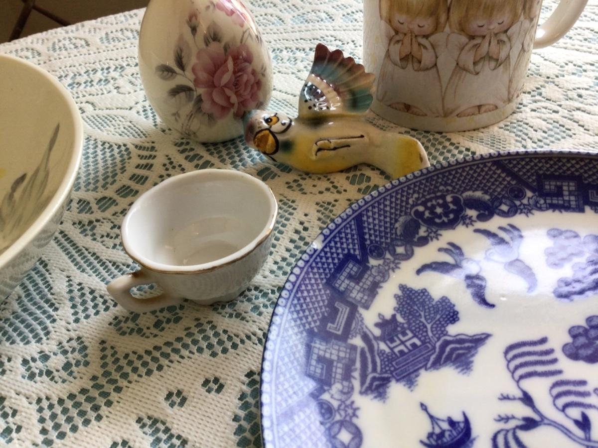 You get Red Wing condiment bowl (with chip). Two plates, egg, bird mug and mini tea cup.