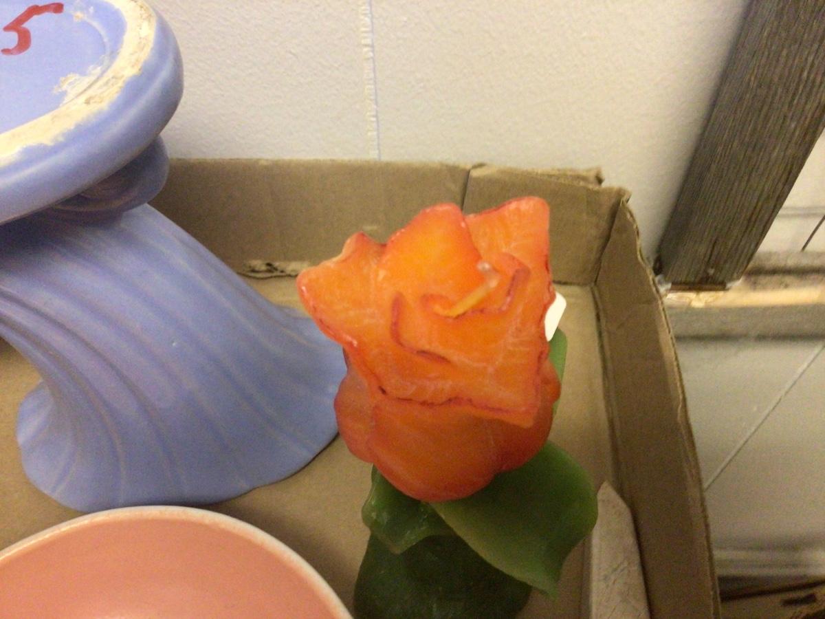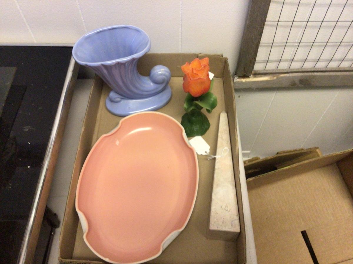 Cornucopia vase purple USA pottery, rose flower candle, oval pottery tray, and marble Washington Monument.