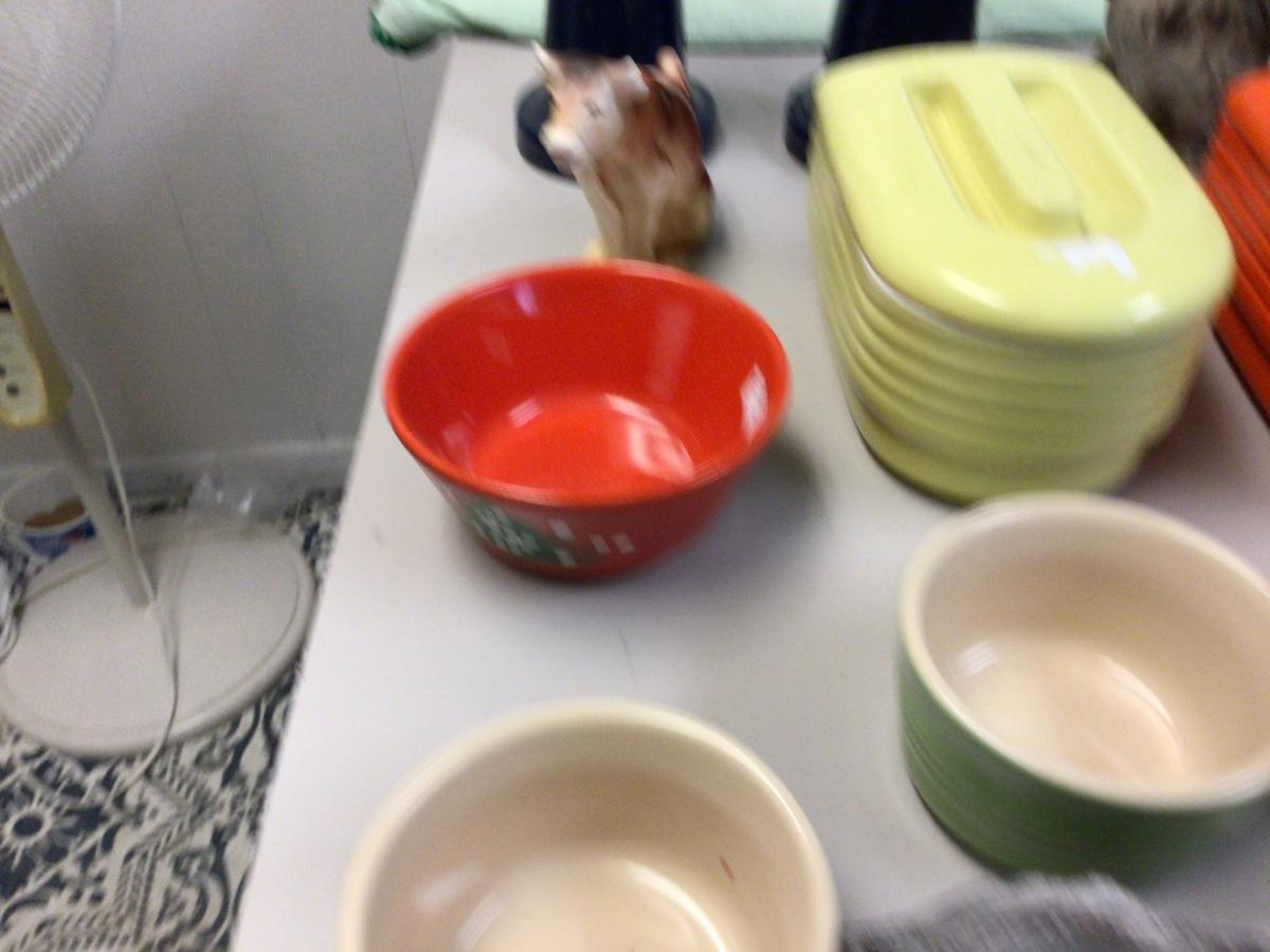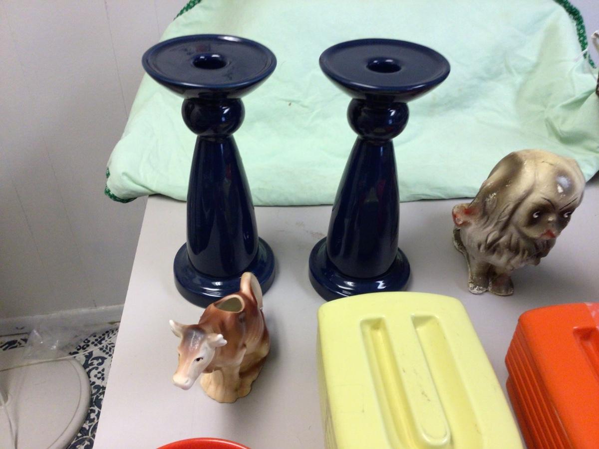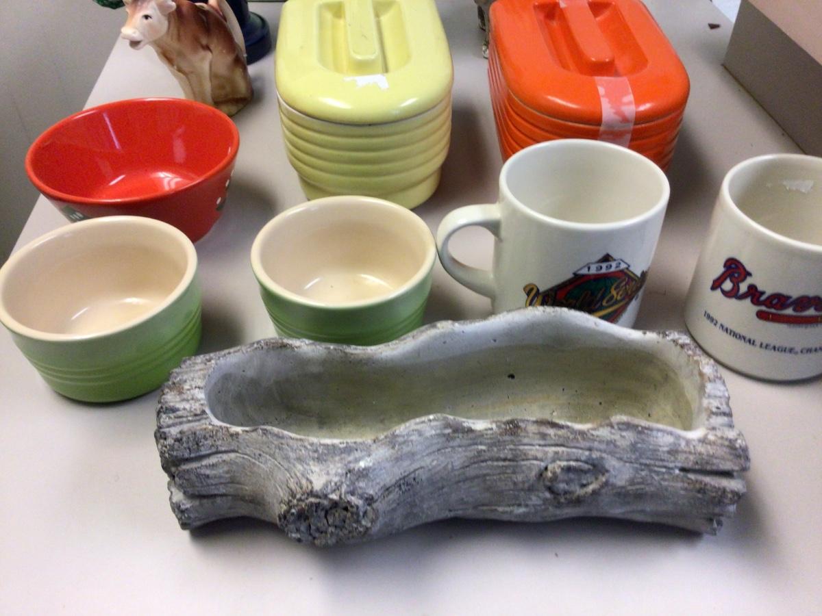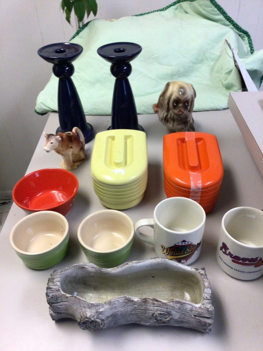 You get two refrigerators dishes, candle holders chalk dog, cow creamer, coffee mugs, dip dishes, log planter.
