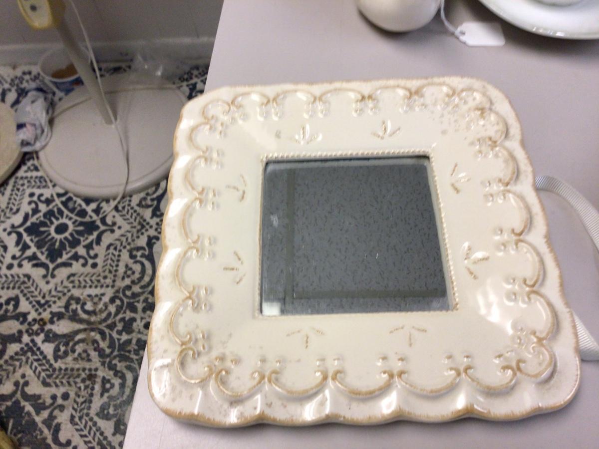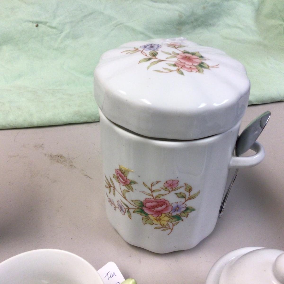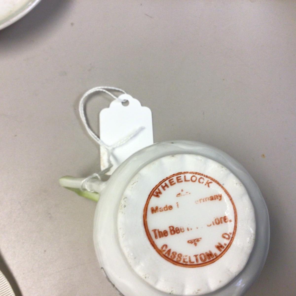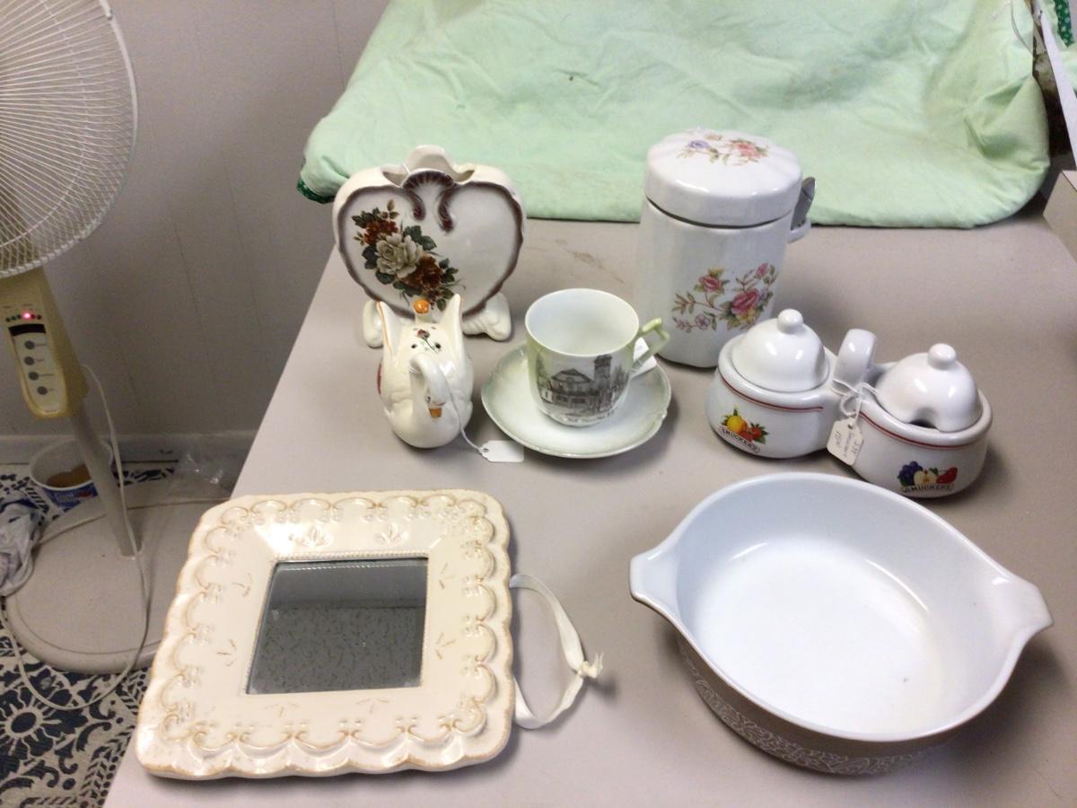 You get heart vase,swan shaker, square mirror, Pyrex bowl, smokers condiment holder, cup and saucer, and coffee canister.