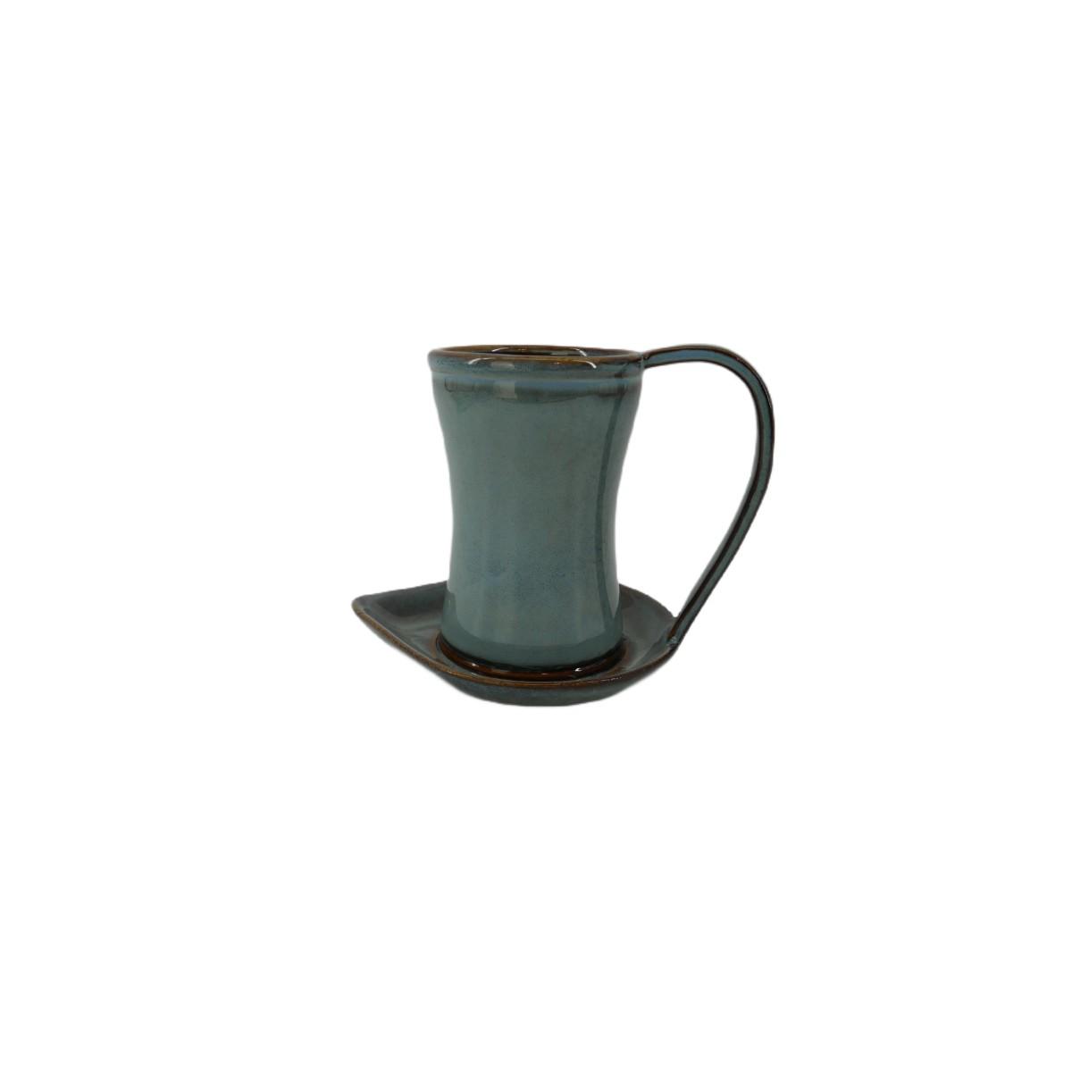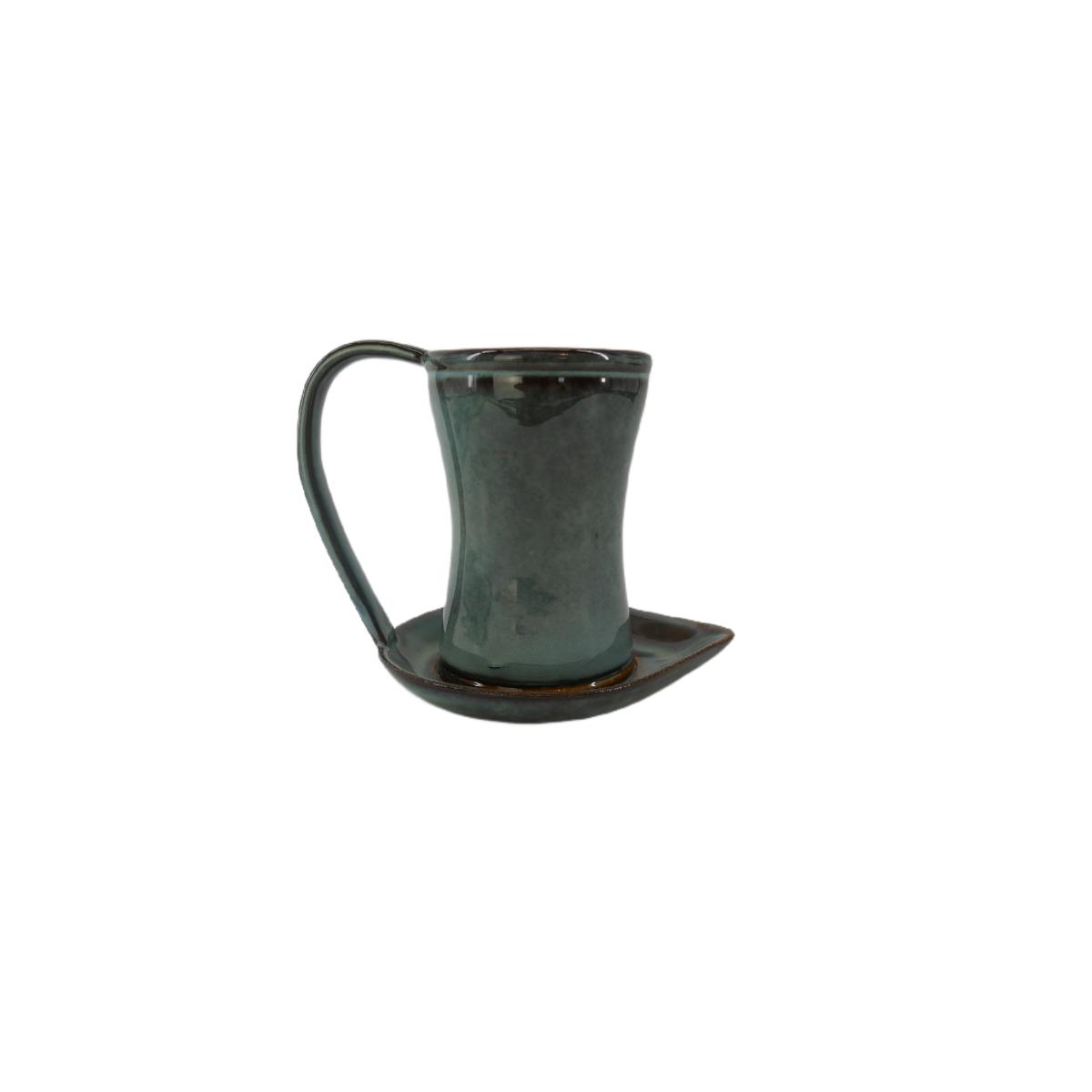 LTD Commodities blue glazed pottery mug with attached drip saucer. Dishwasher, microwave, freezer, and oven safe . Excellent condition, no issues found. Measures L 6" x H 5" x W 5", weighs 15 oz. (D98)