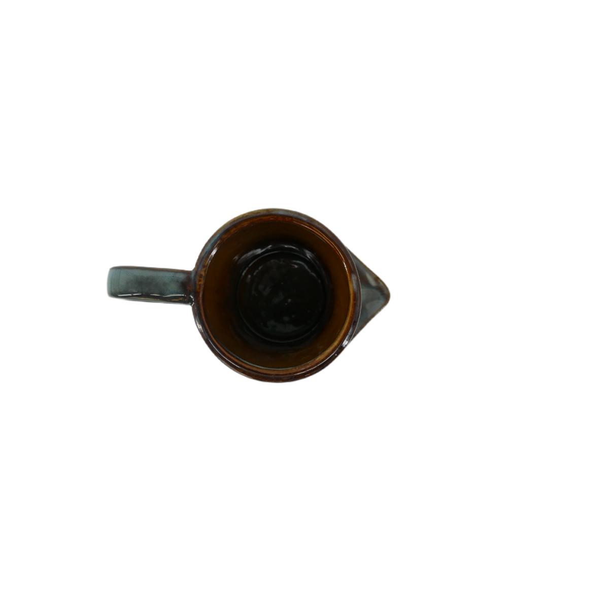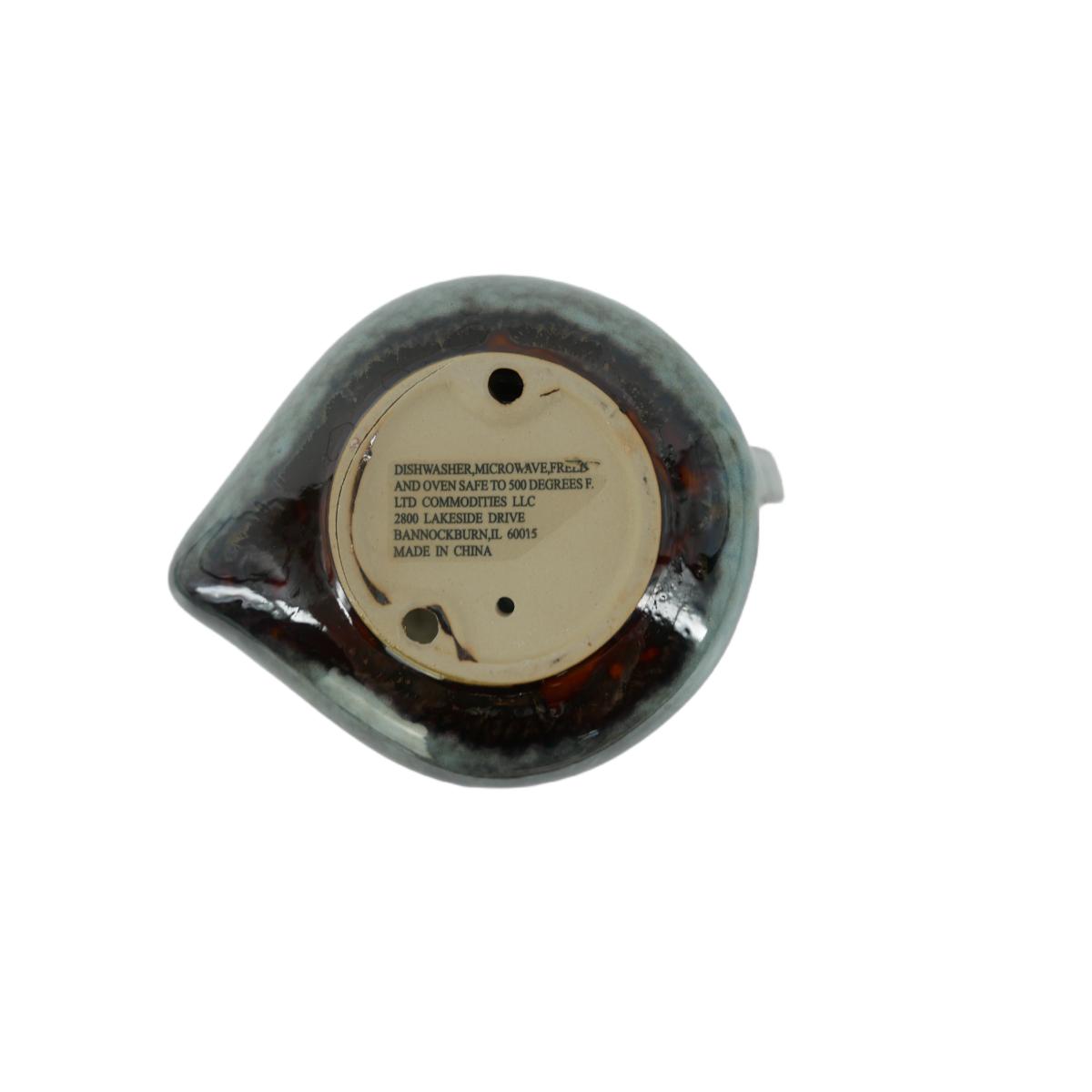 LTD Commodities blue glazed pottery mug with attached drip saucer. Dishwasher, microwave, freezer, and oven safe . Excellent condition, no issues found. Measures L 6" x H 5" x W 5", weighs 15 oz. (D98)