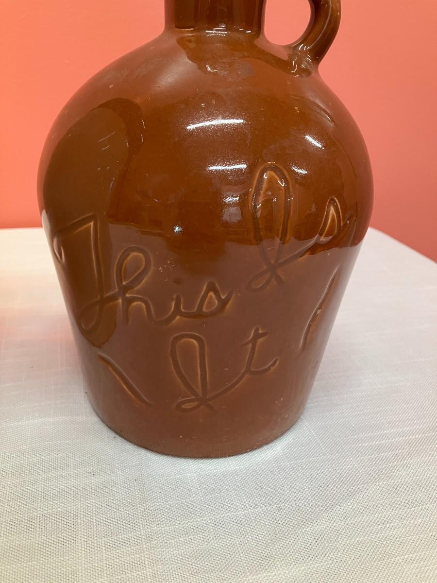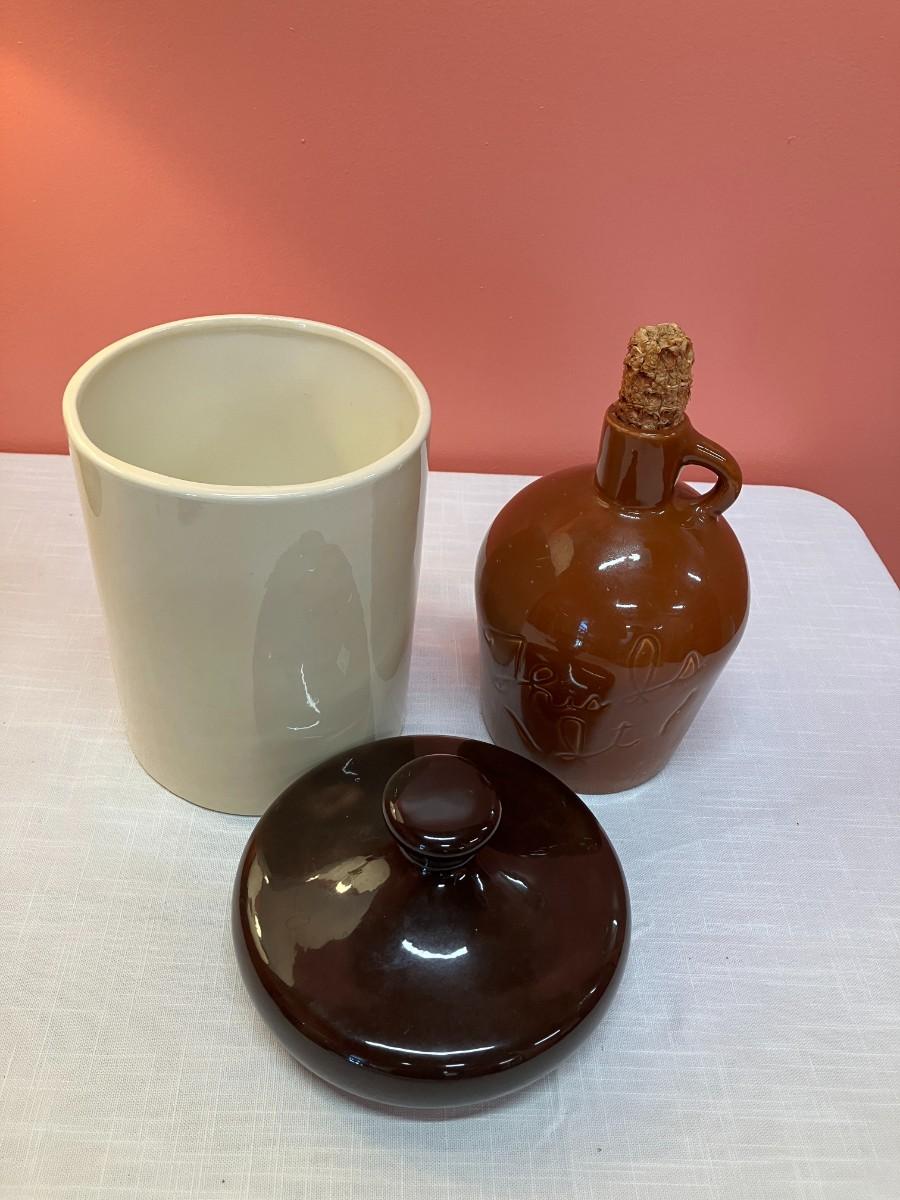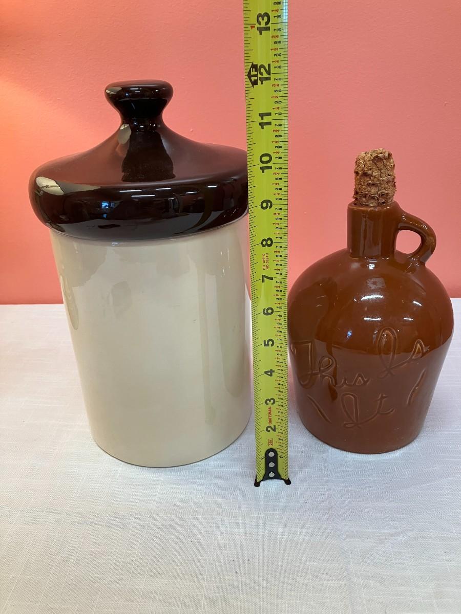 Set includes 2 pieces: 1 House of Webster, TX vintage whiskey jug with corn cob stopper and 1 unmarked pottery canister