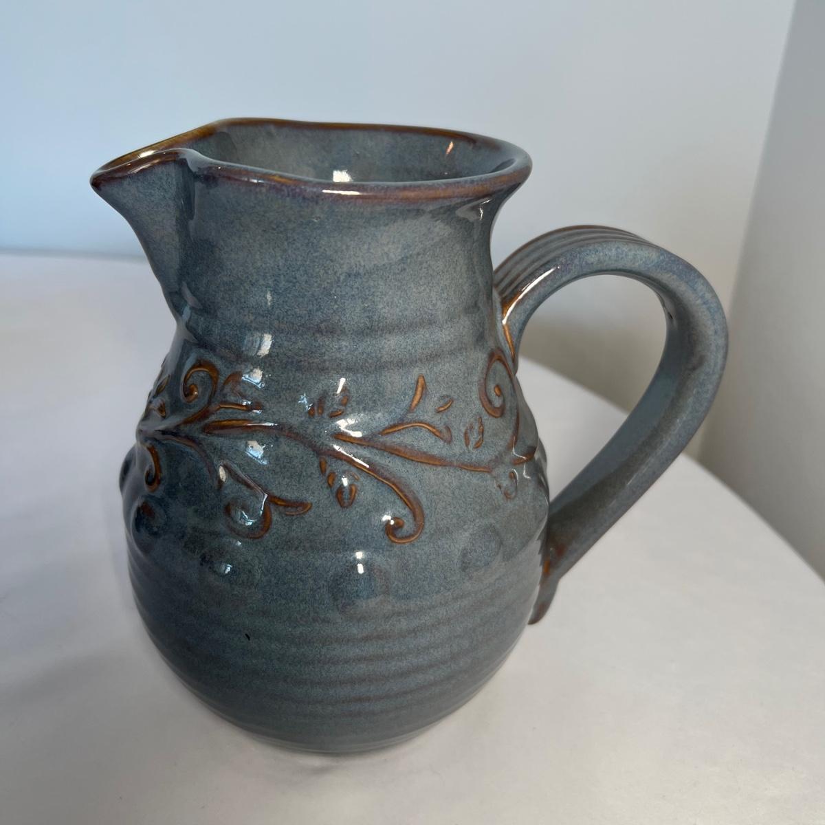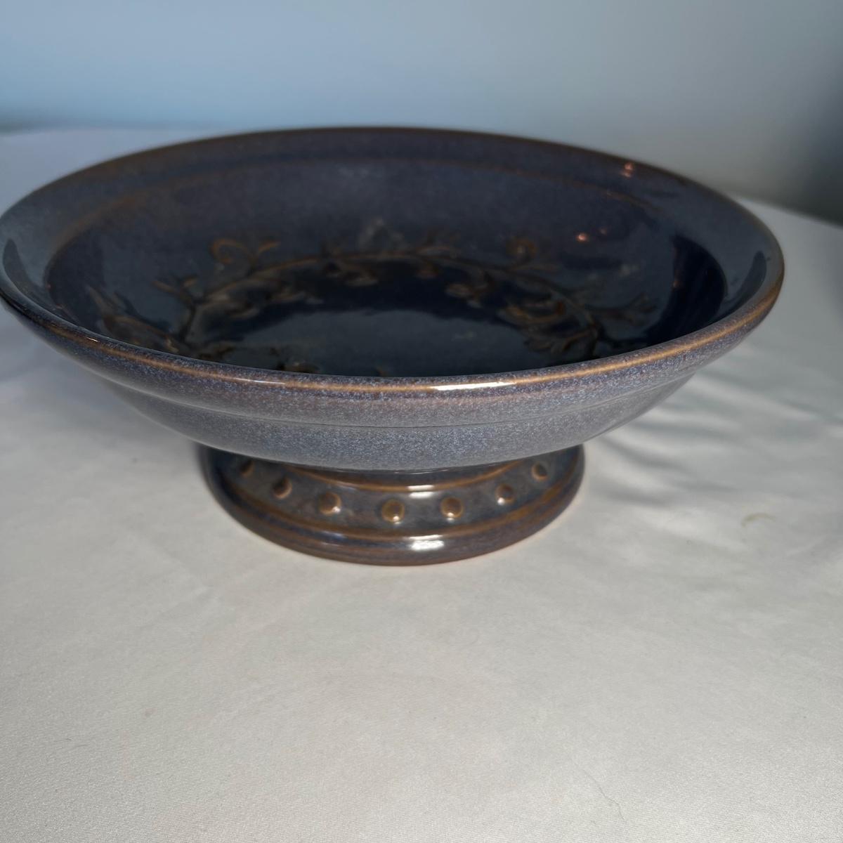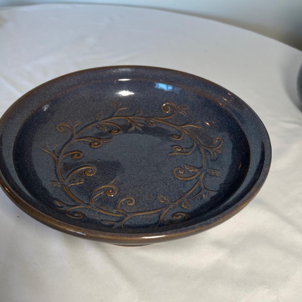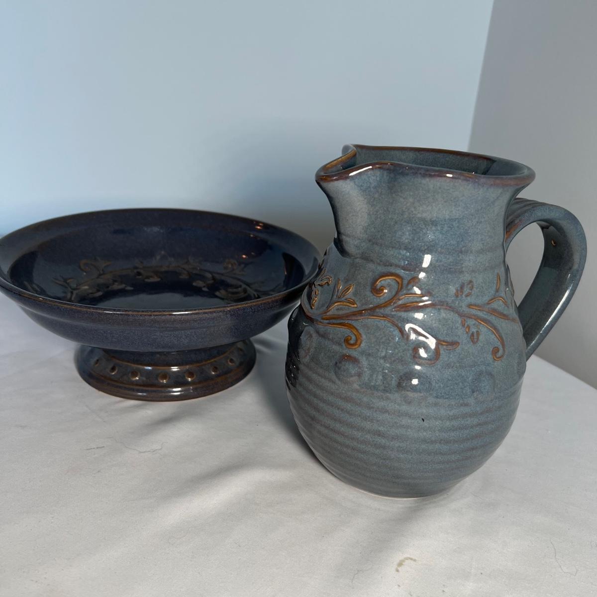 Both pottery pieces in this lot have pretty slip trailed designs. They are both in excellent condition with no chips, cracks or crazing. Pitcher has a blueish purple glaze whereas the dish is purple.