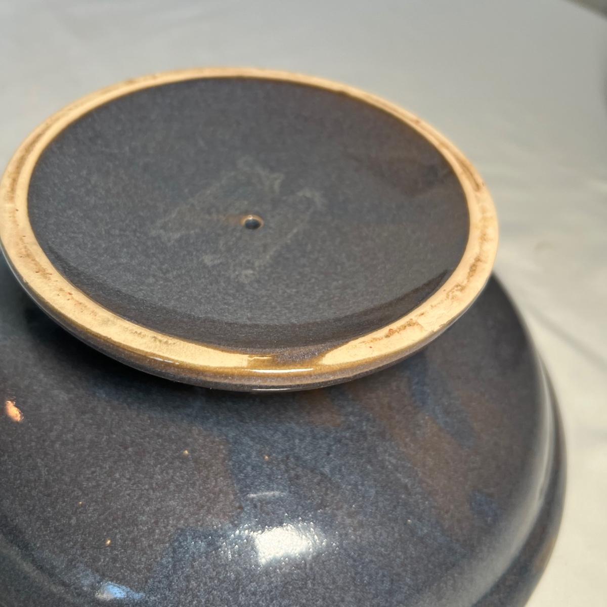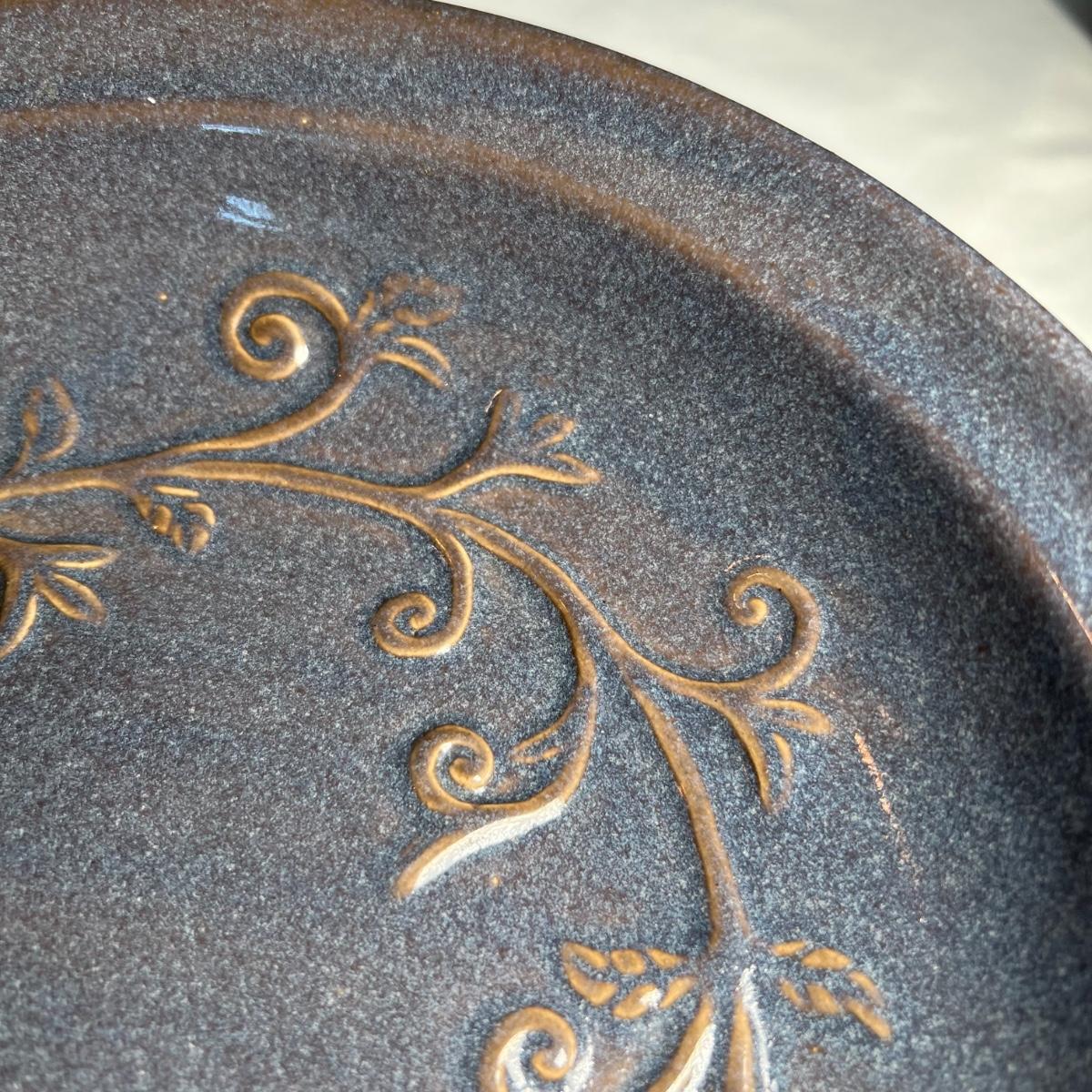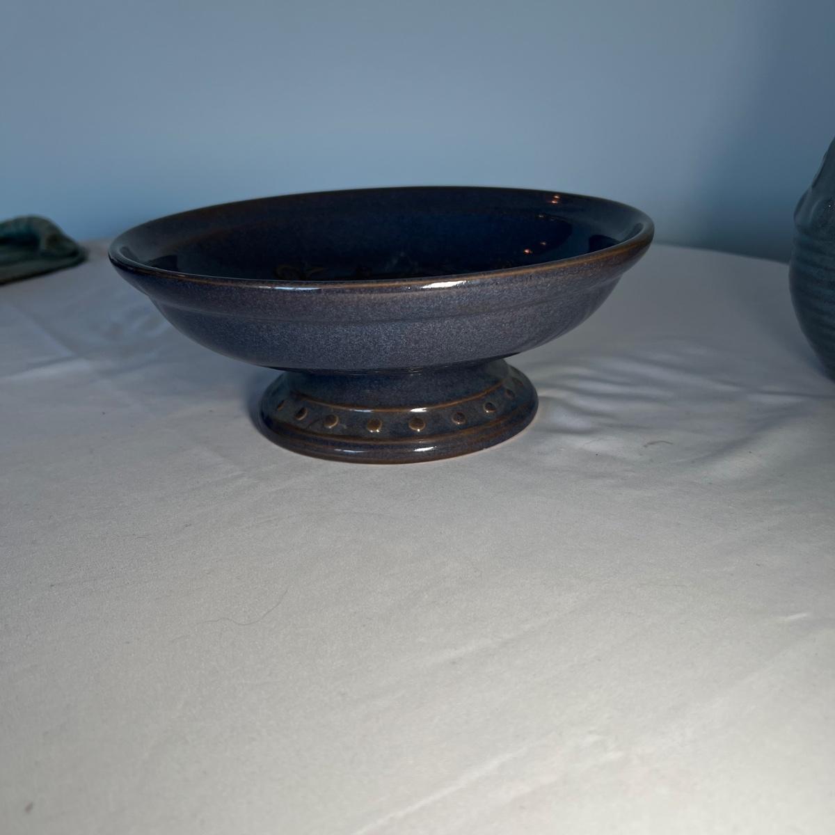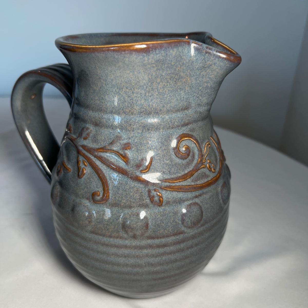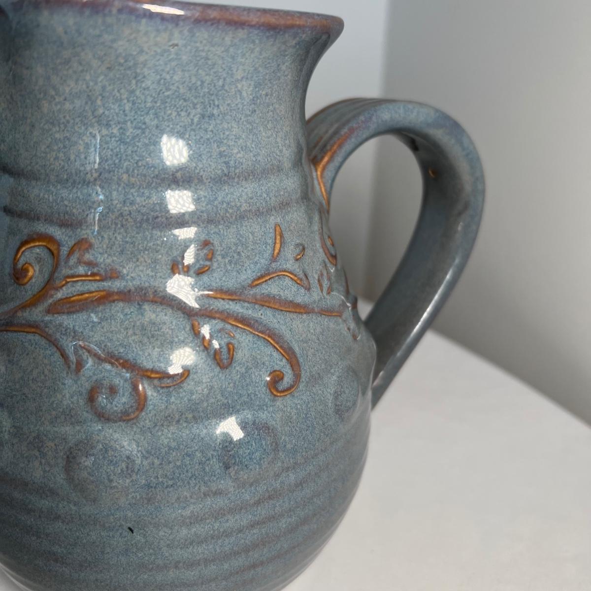 Both pottery pieces in this lot have pretty slip trailed designs. They are both in excellent condition with no chips, cracks or crazing. Pitcher has a blueish purple glaze whereas the dish is purple.