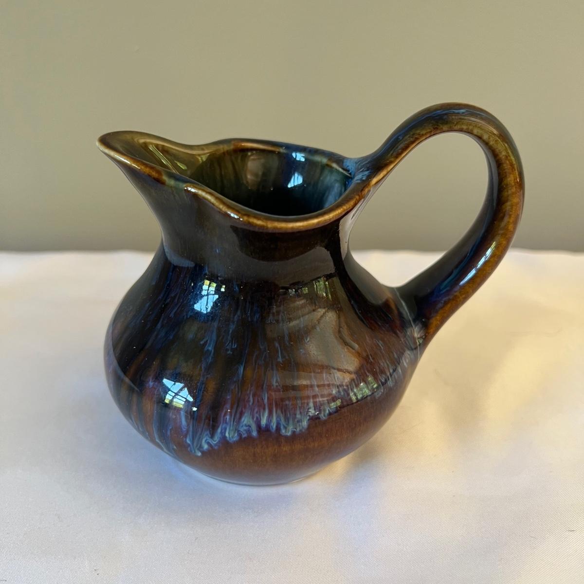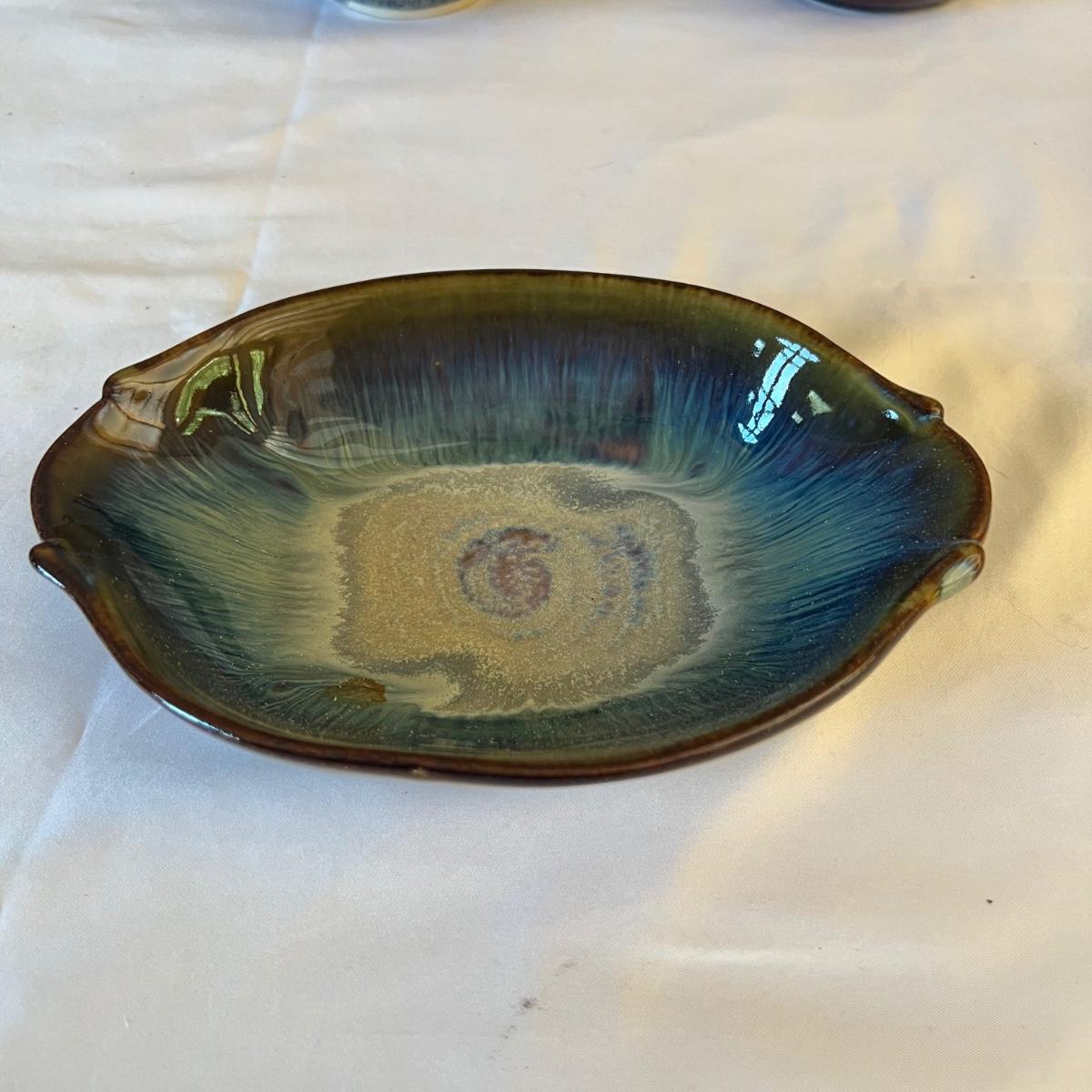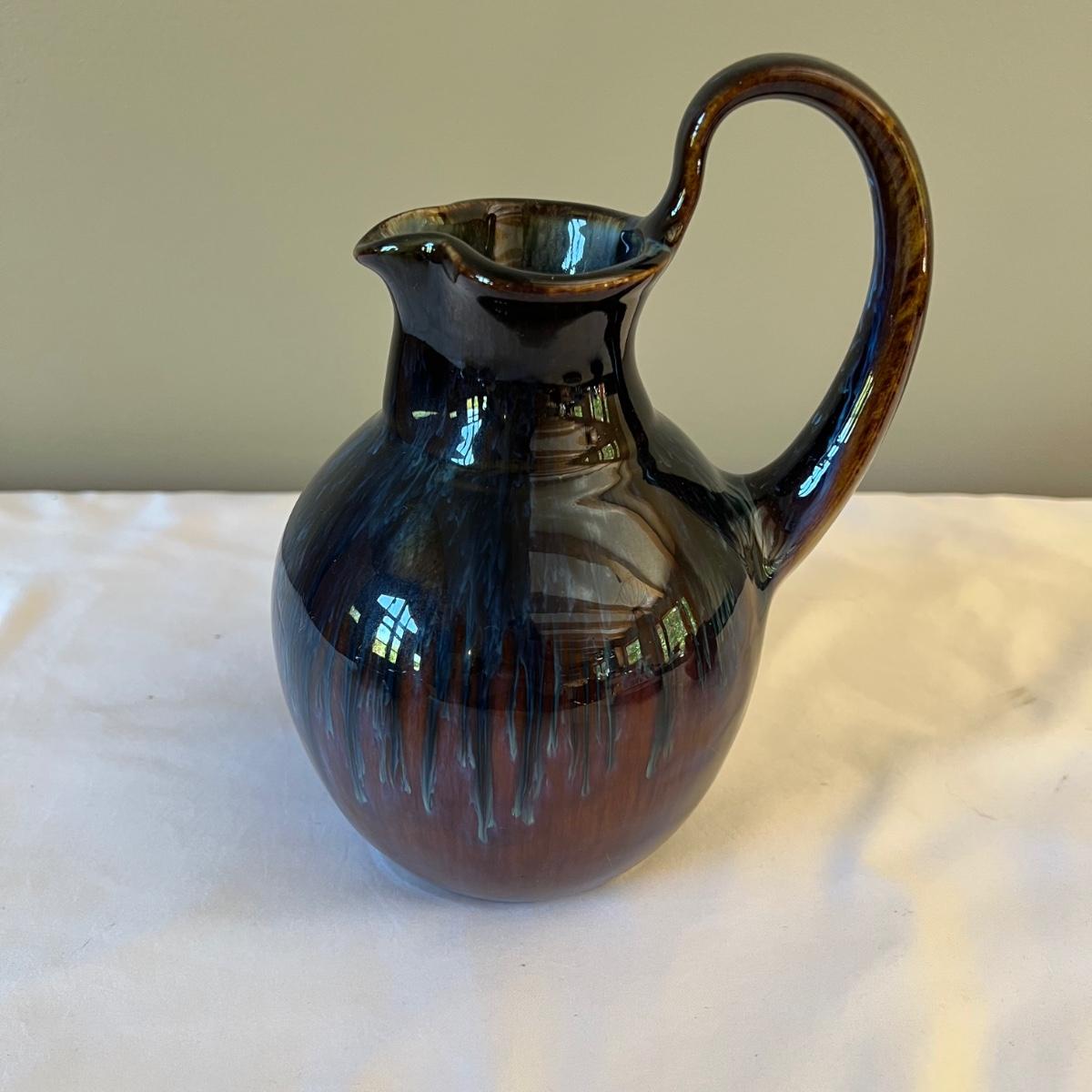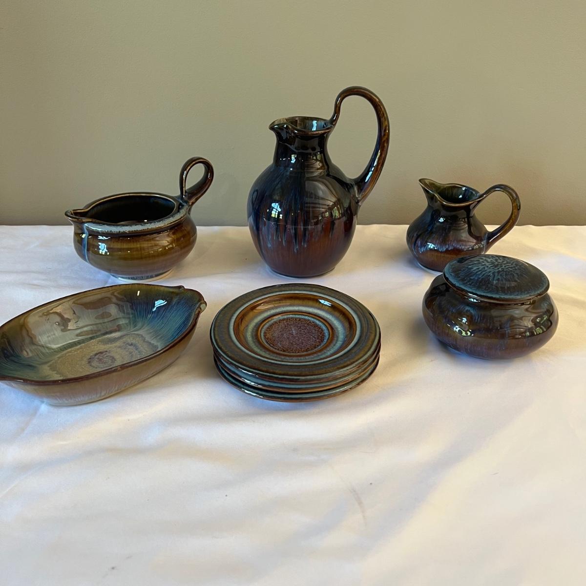 Eight piece set of serving pottery including three pitchers, three small plates, one serving bowl and one covered bowl. The three small plates measure 5.75”D. The smallest pitcher measures 5”D x 3.5”H, the medium pitcher measures 4.5”D x 3”H and the taller pitcher is approximately 5.5”D x 7”H. The serving plate is 7.75” x 5.5” x 1.75”H. Shipping available. Shipping can be costly. We suggest contacting our preferred local shipping provider, Postage Express, with dimensions and getting an estimate before bidding: (828) 670-5501 or postageexpress@yahoo.com.