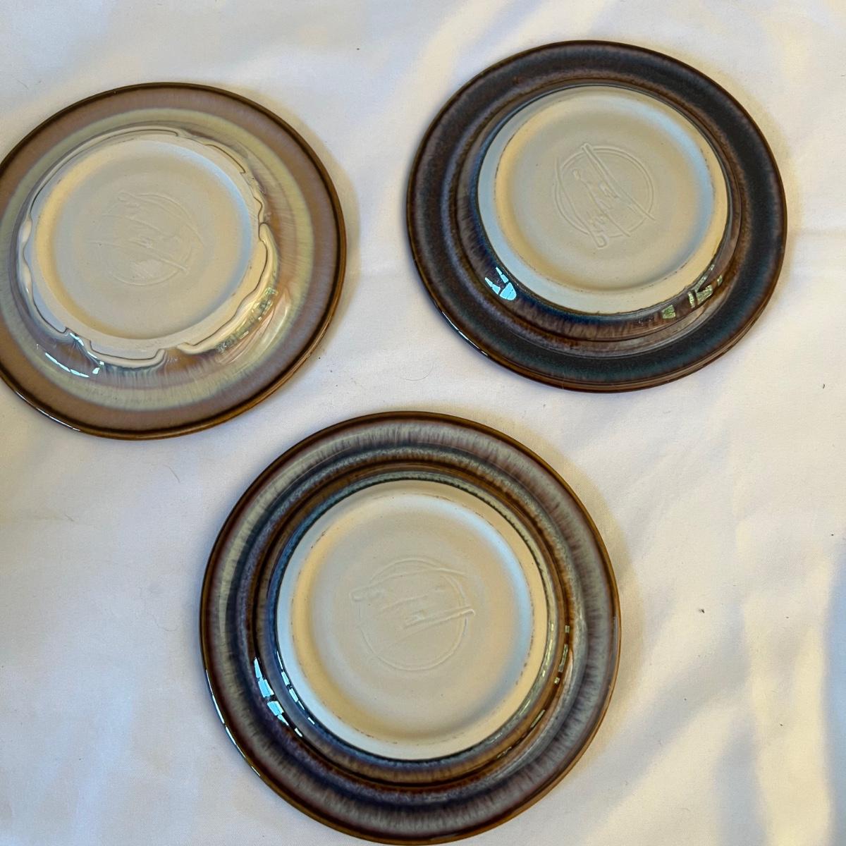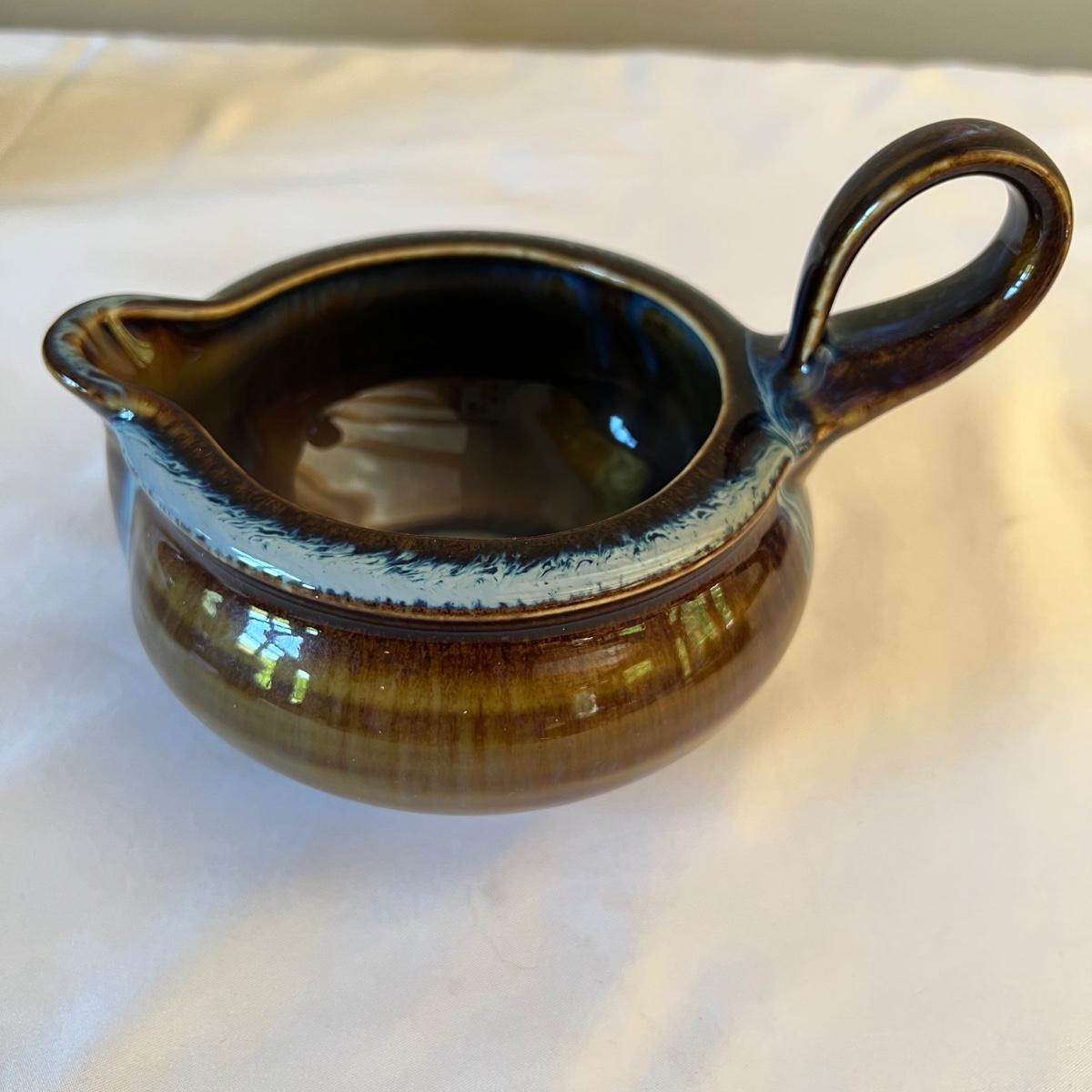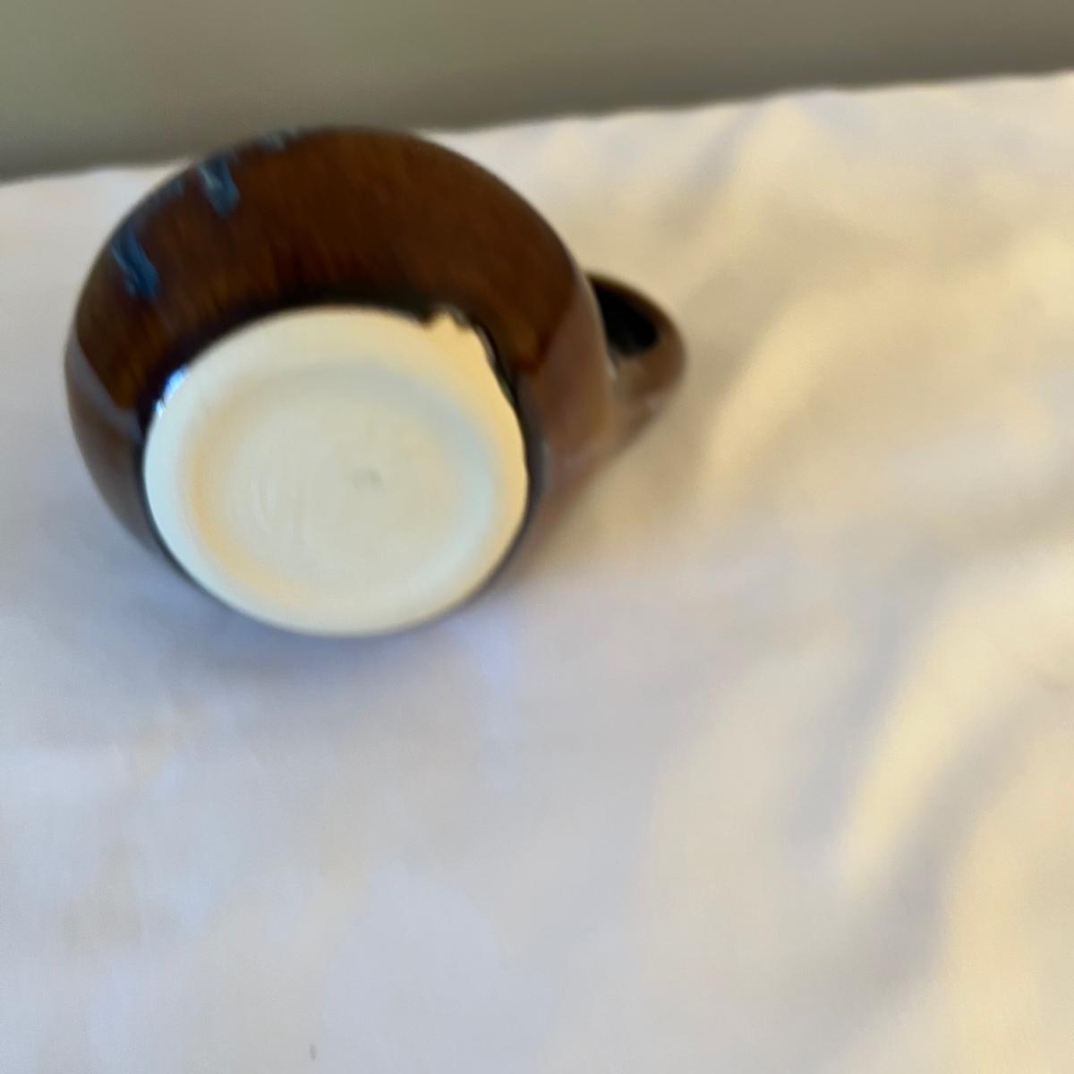 Eight piece set of serving pottery including three pitchers, three small plates, one serving bowl and one covered bowl. The three small plates measure 5.75”D. The smallest pitcher measures 5”D x 3.5”H, the medium pitcher measures 4.5”D x 3”H and the taller pitcher is approximately 5.5”D x 7”H. The serving plate is 7.75” x 5.5” x 1.75”H. Shipping available. Shipping can be costly. We suggest contacting our preferred local shipping provider, Postage Express, with dimensions and getting an estimate before bidding: (828) 670-5501 or postageexpress@yahoo.com.