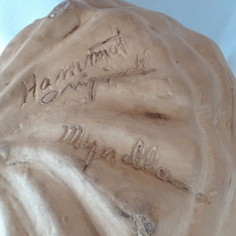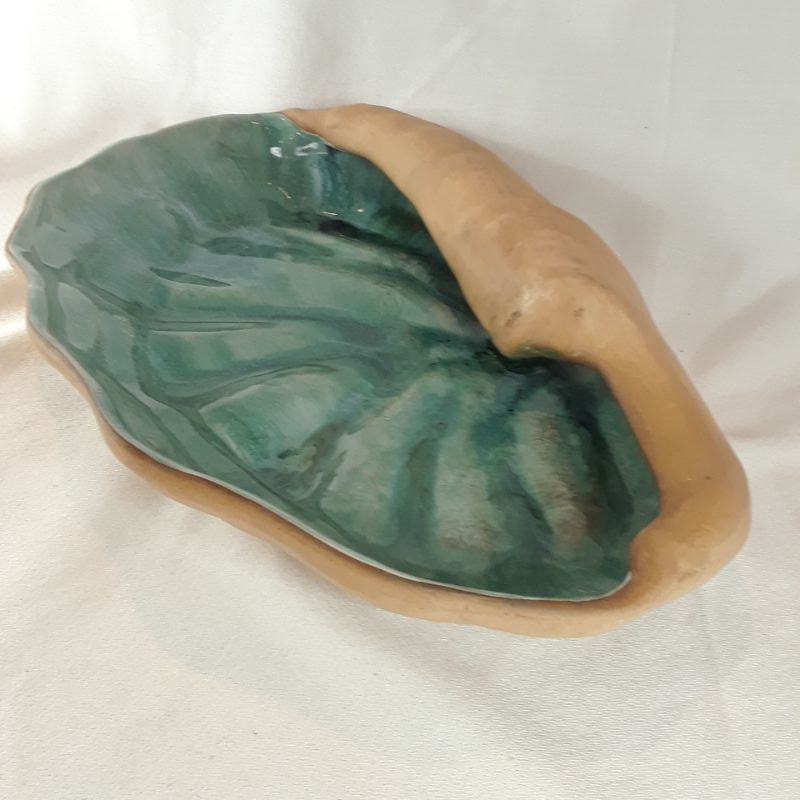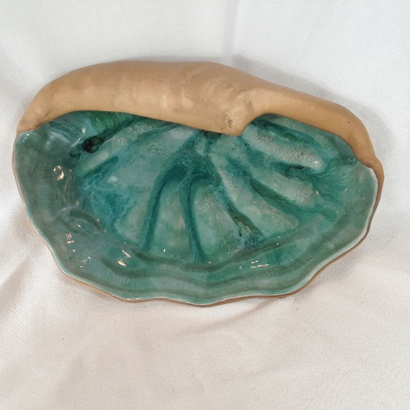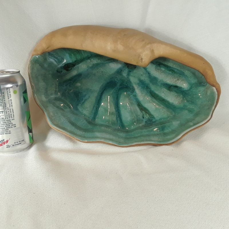 A large beautiful sea shell made by a potter from the 1940's. Outside and bottom are a mat blonde clay finish and the inside is a wonderful Teal Glaze. Signed on bottom: Hammat Original - Mynelle