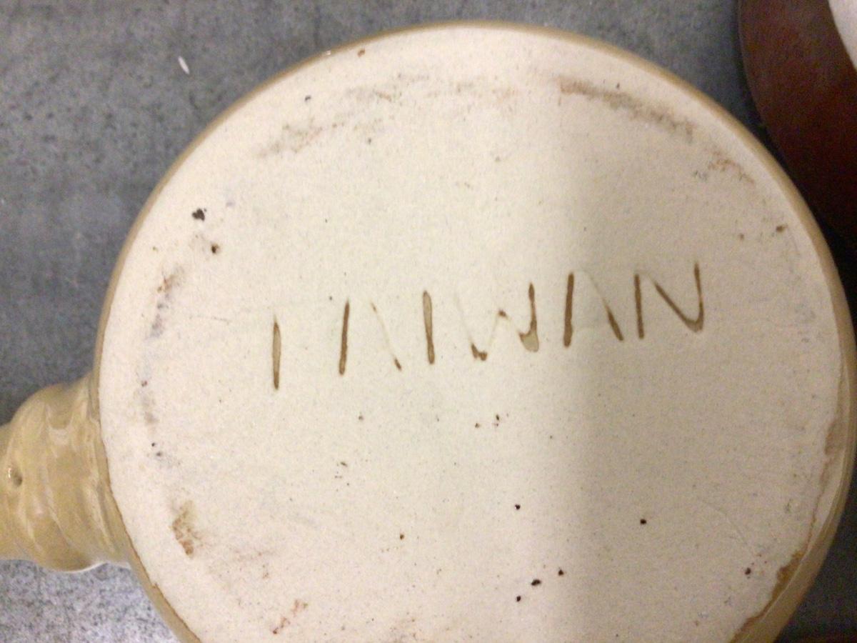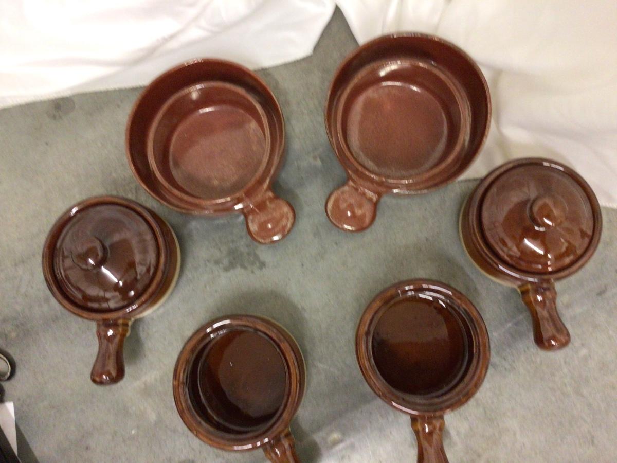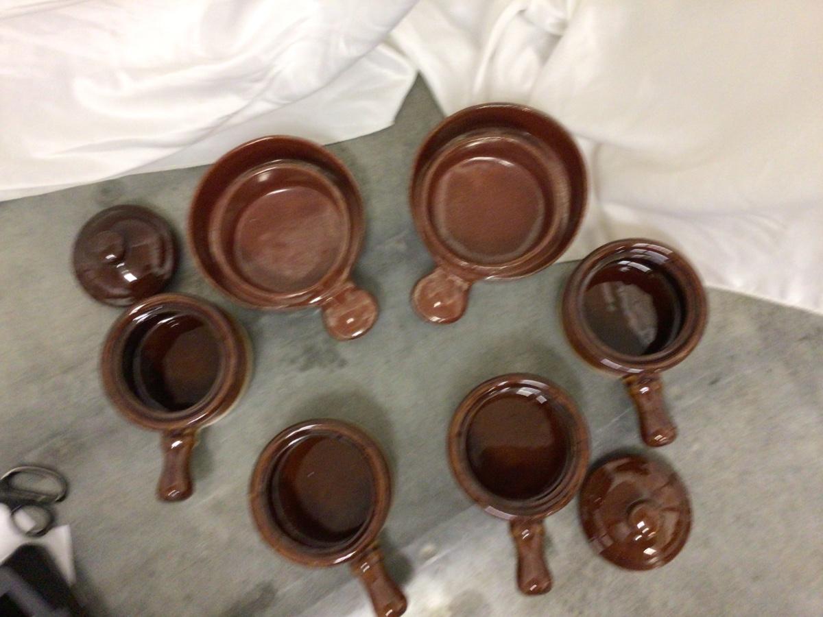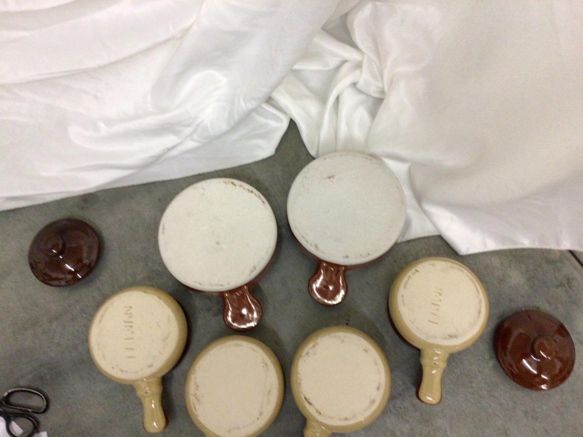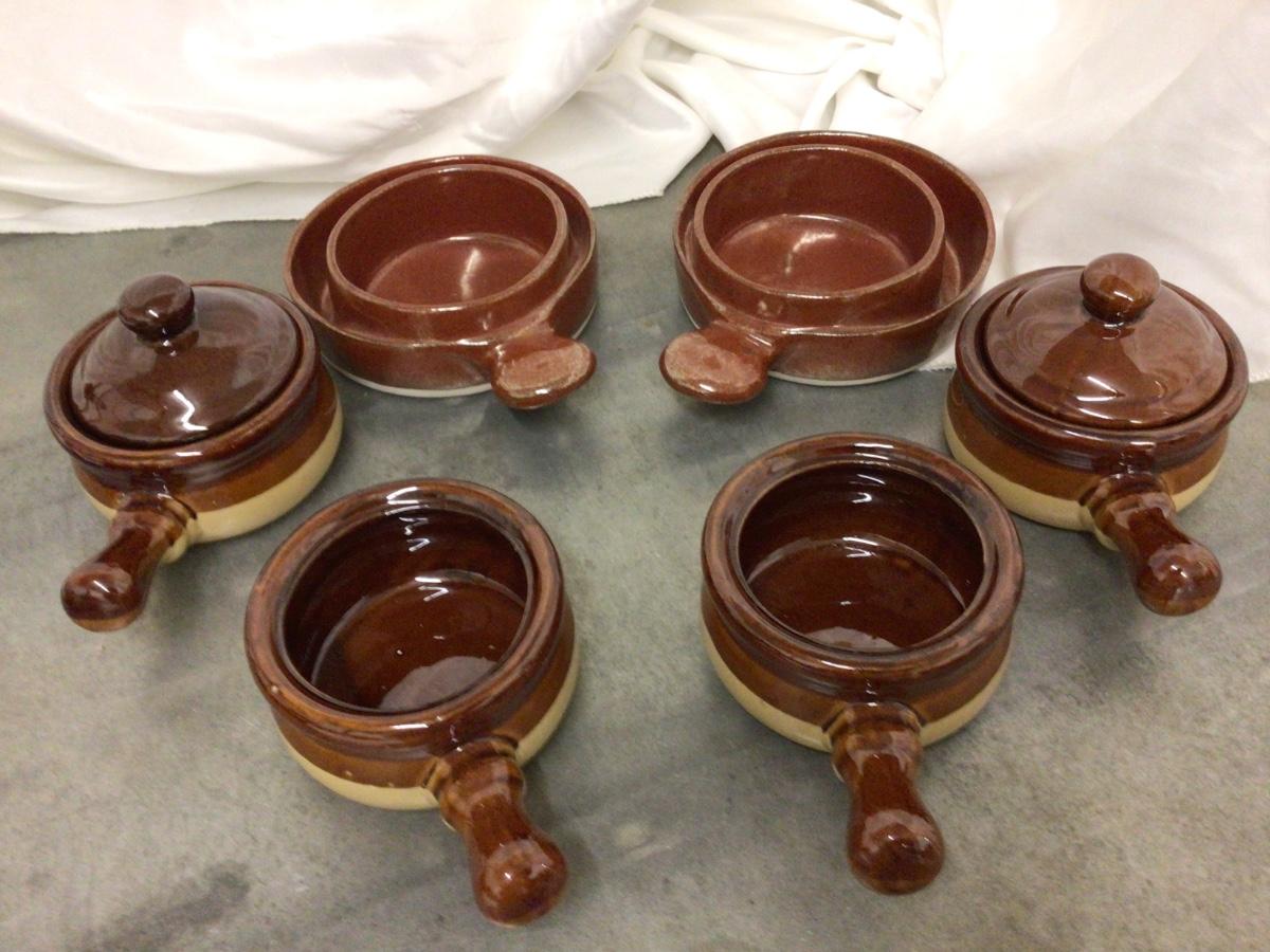 You get two soup bowls with lids, two soup bowls with no lids and two soup bowls with sandwich tray attached. Two Robert Weiss Ceramics, four are made in Tiawan.