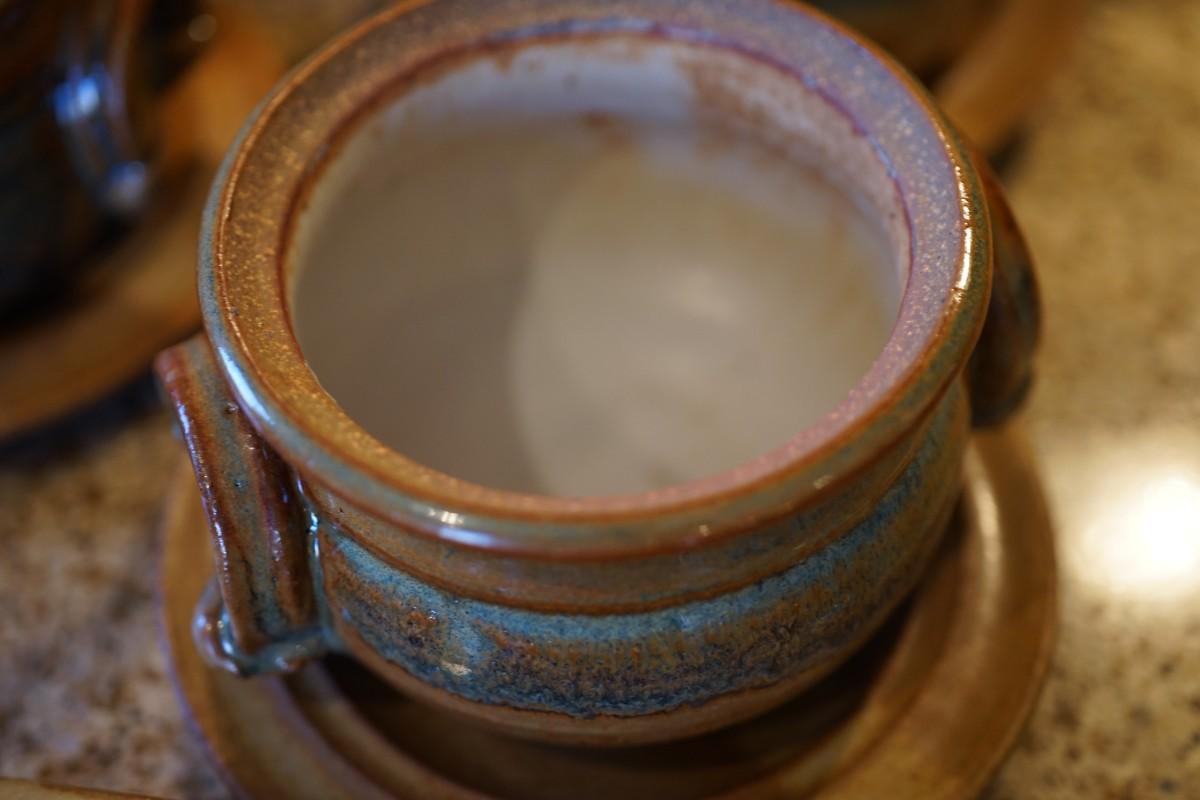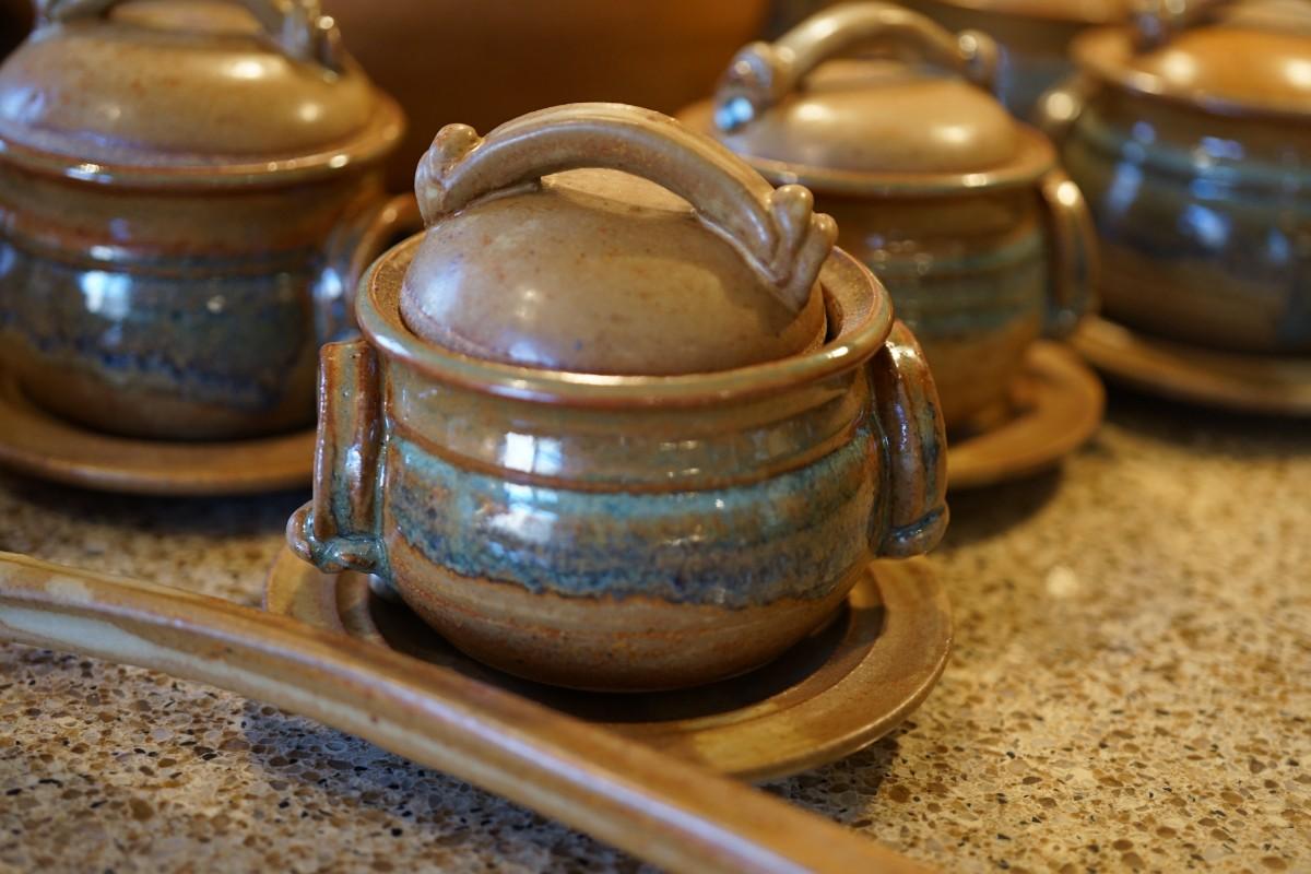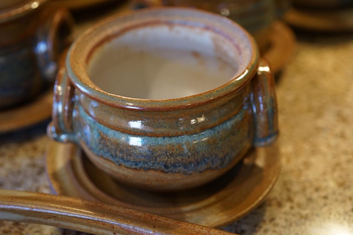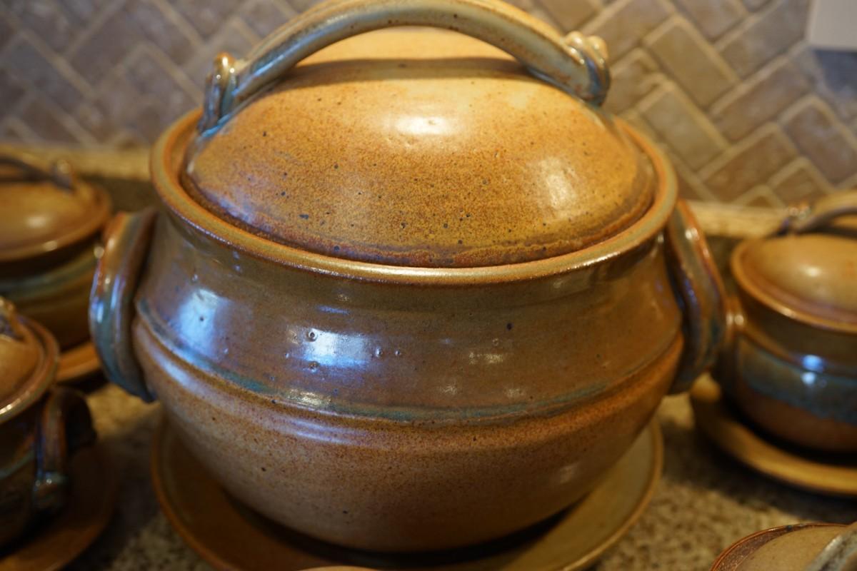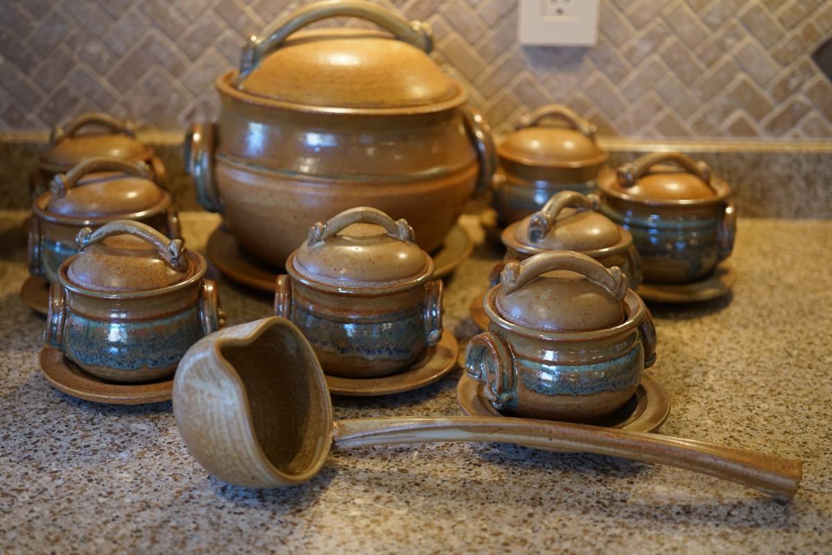 POTTERY SOUP TUREEN WITH EIGHT COVERED BOWLS / LADLE. HAND CRAFTED POTTERY IN EARTH TONES