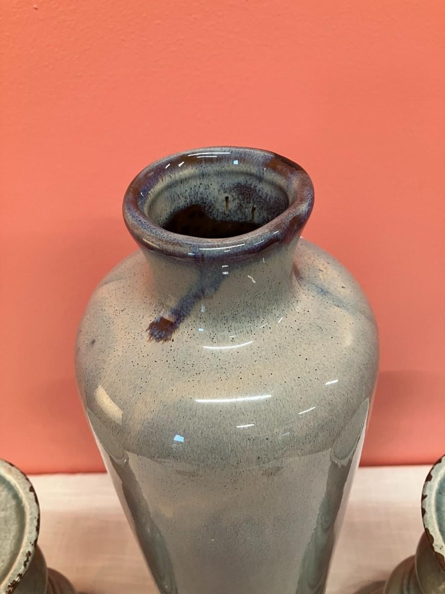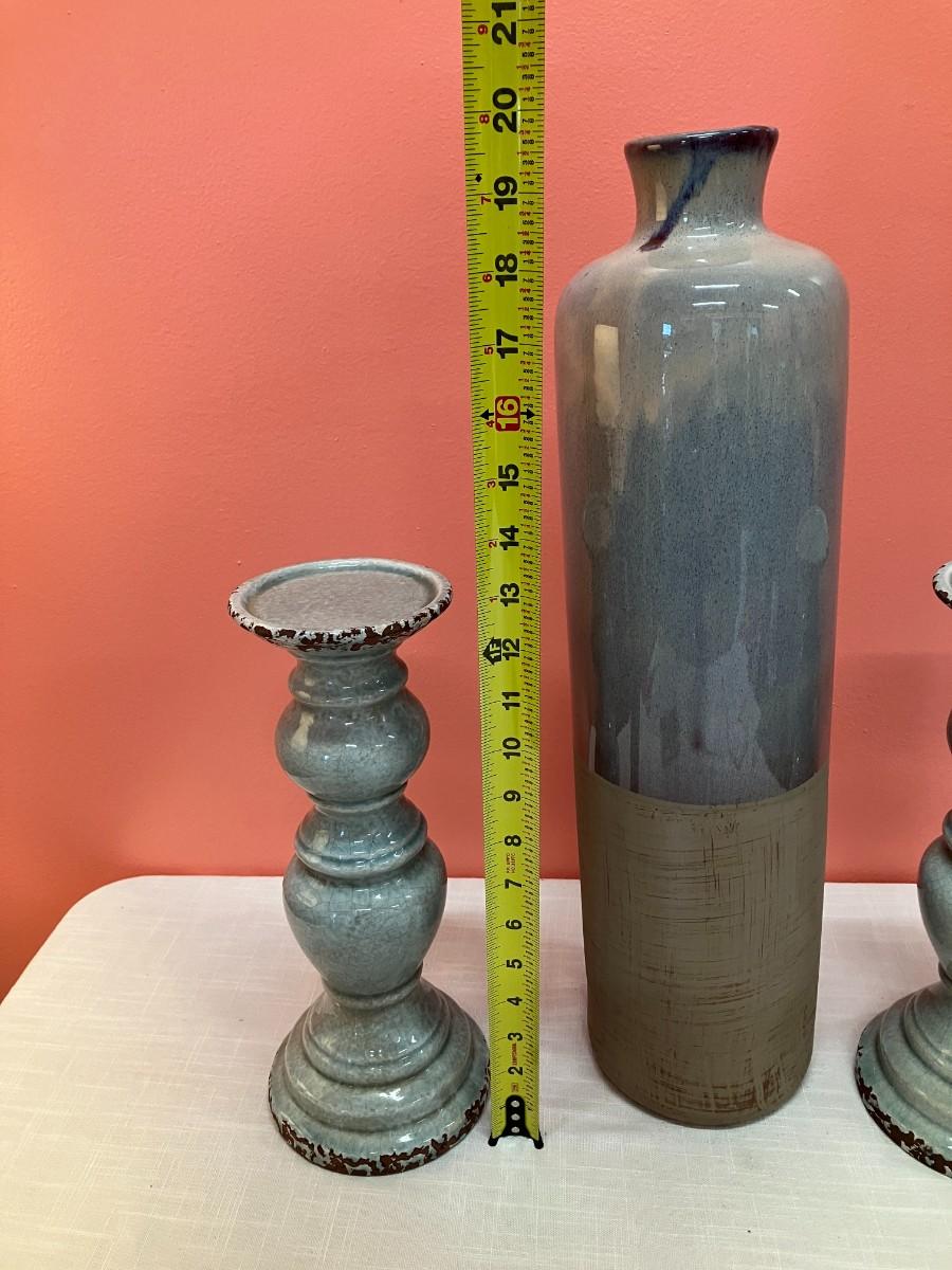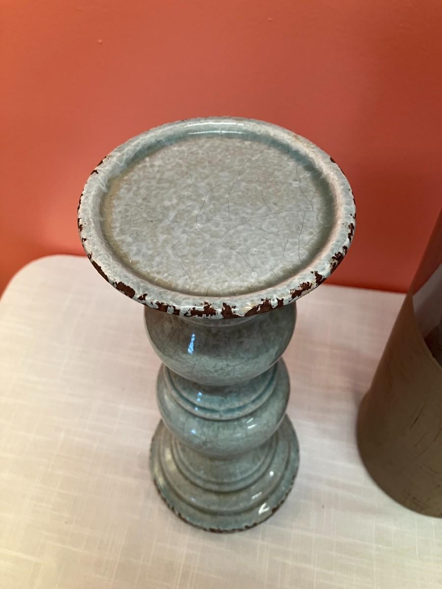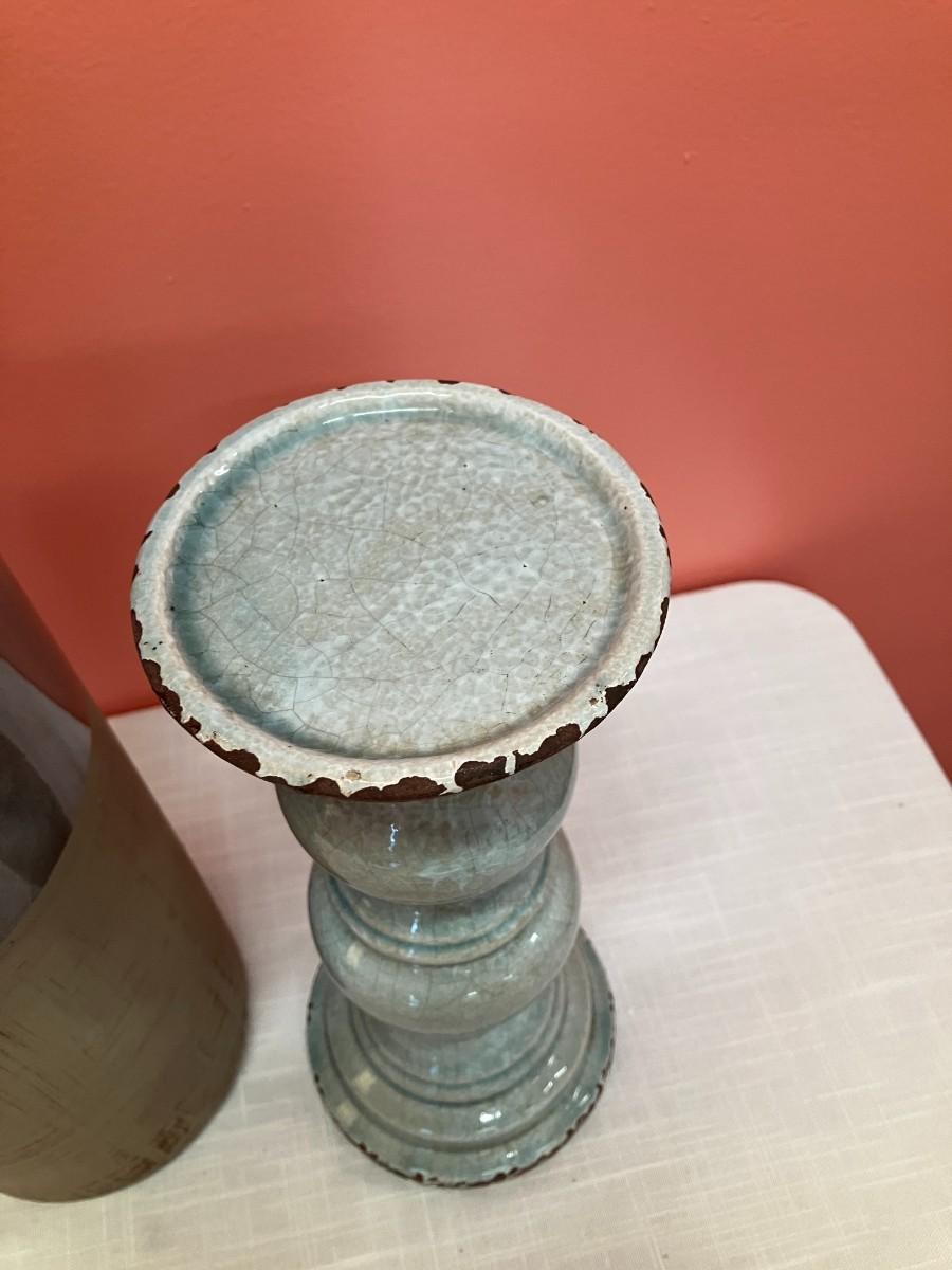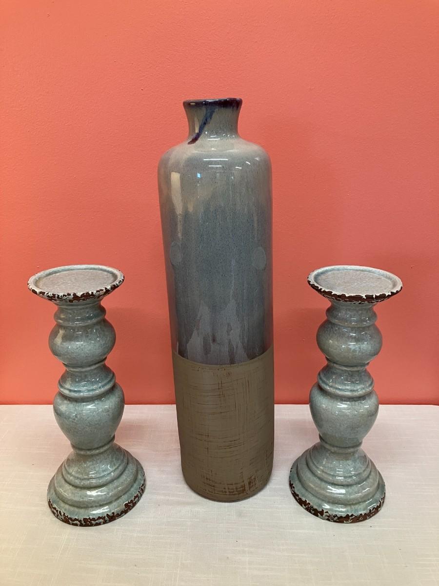 Set of 3 items: tall blue/teal and tan pottery vase and 2 robin's egg blue/teal ceramic candlesticks with crackle finish