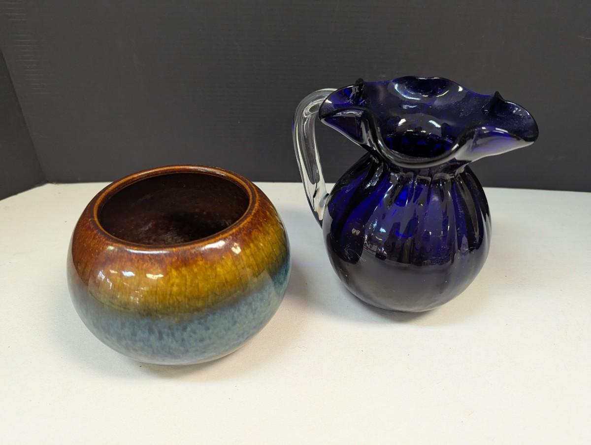 Pottery Vase Planter & Cobalt Blue Glass Pitcher