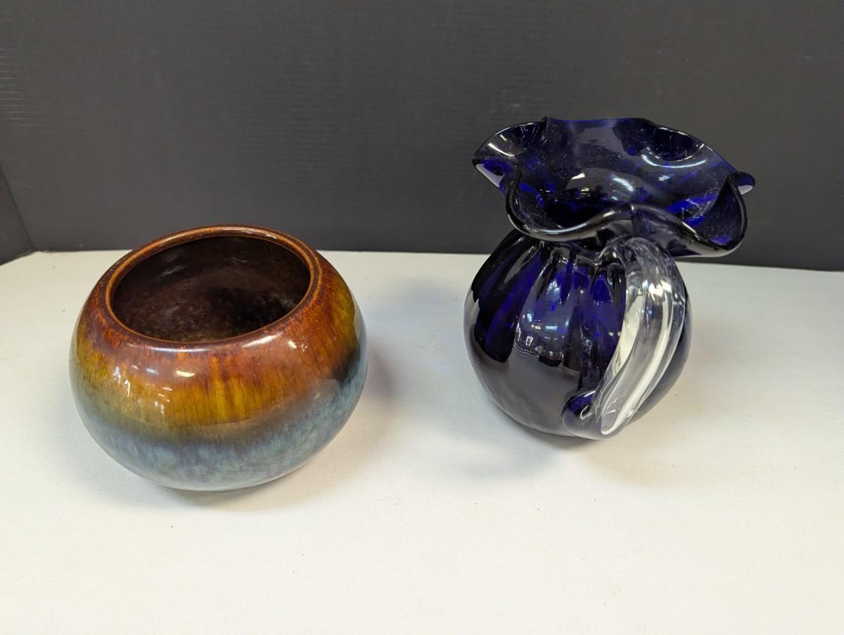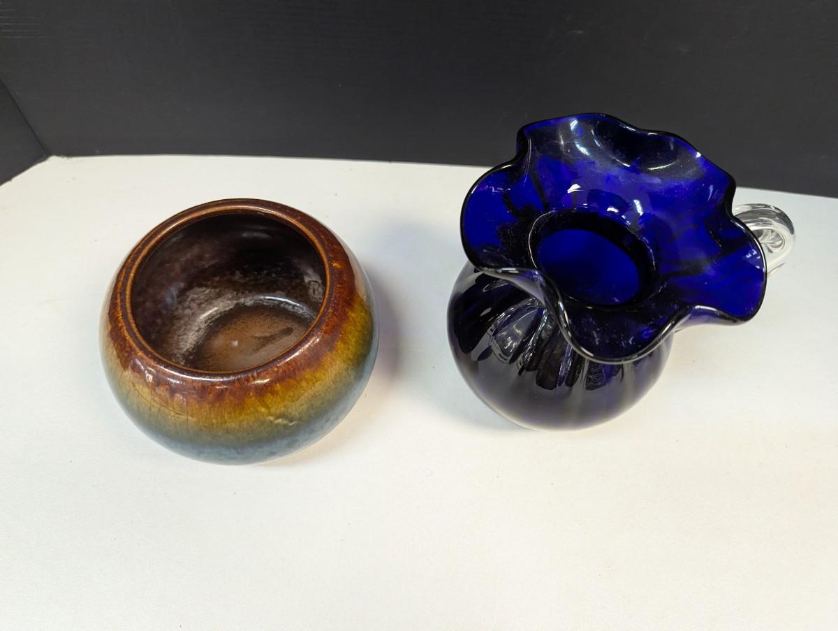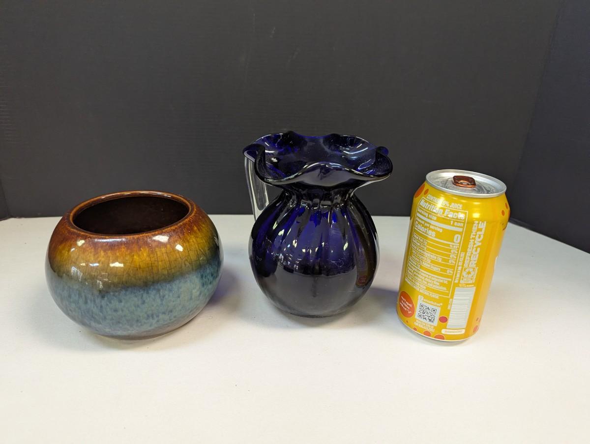 Pottery Vase Planter & Cobalt Blue Glass