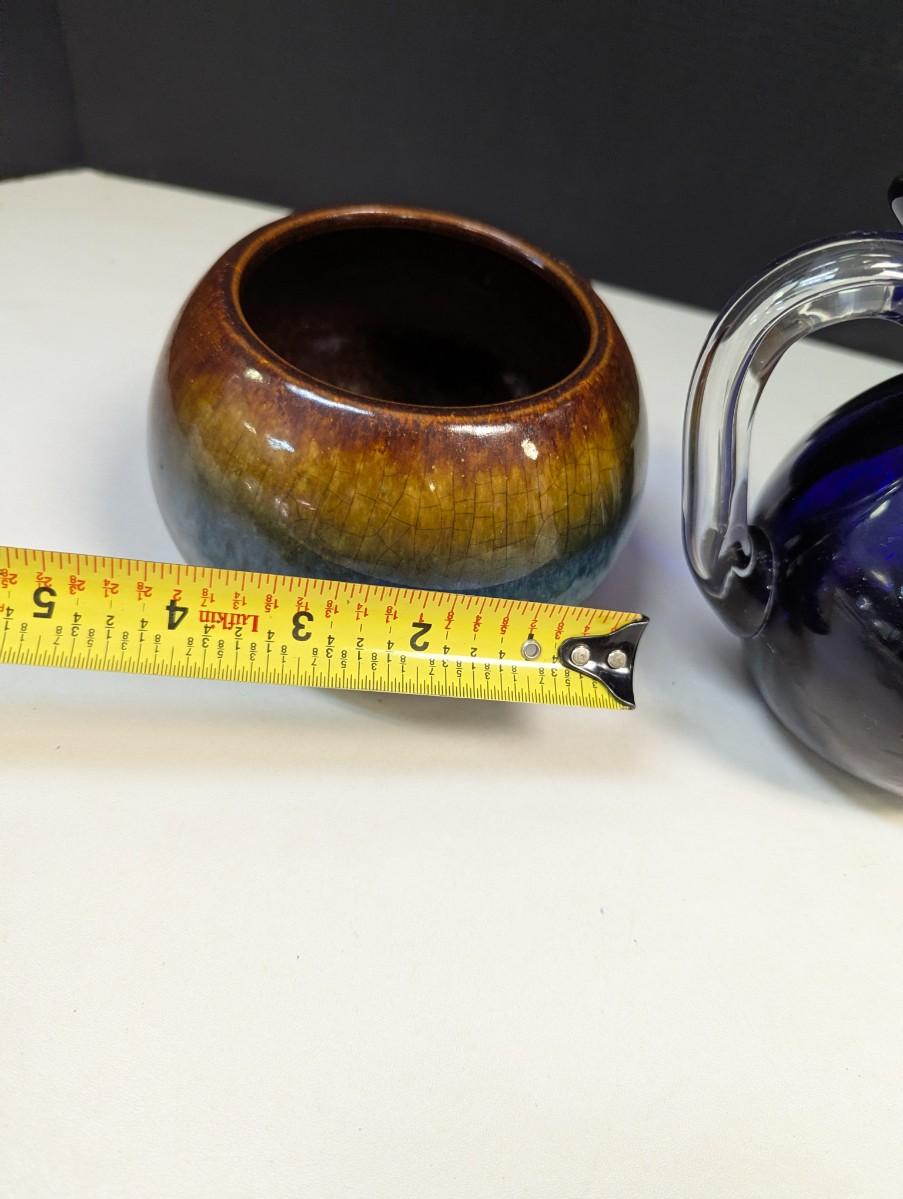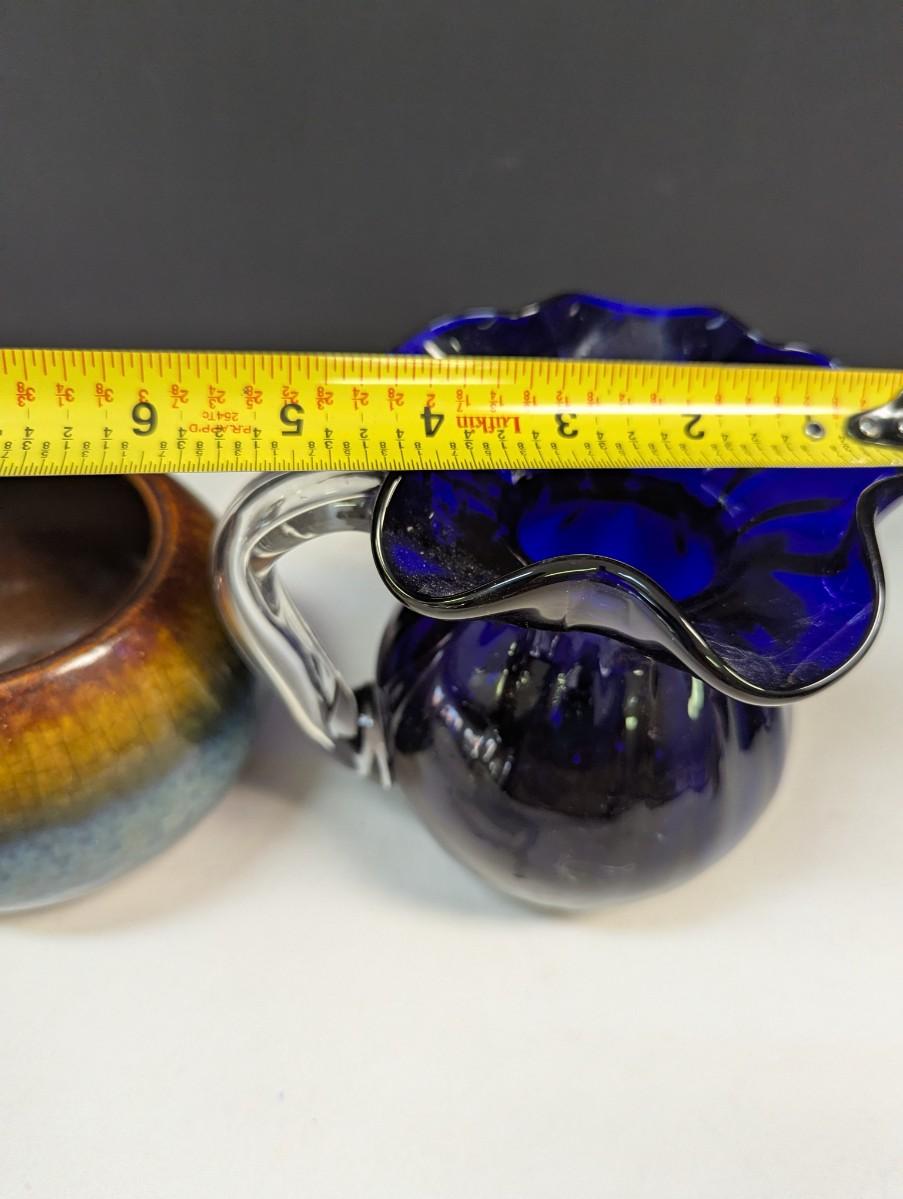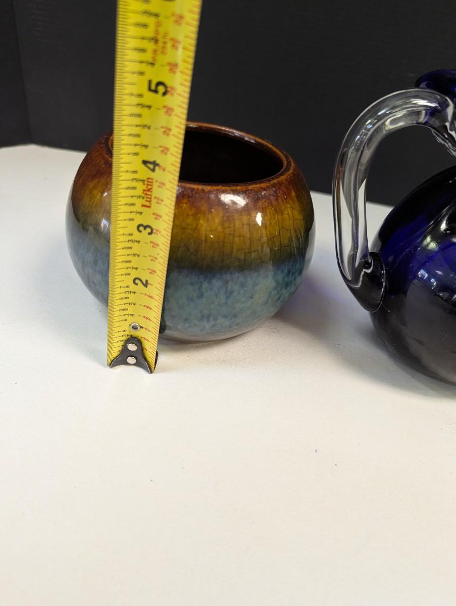 Pottery Vase Planter & Cobalt Blue Glass