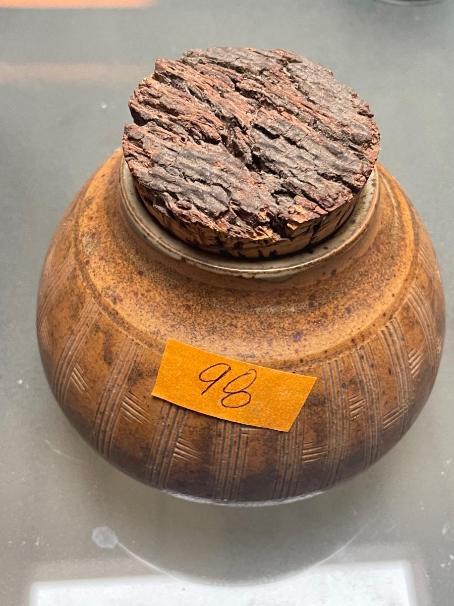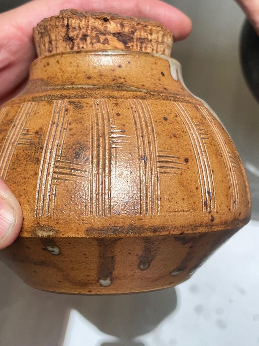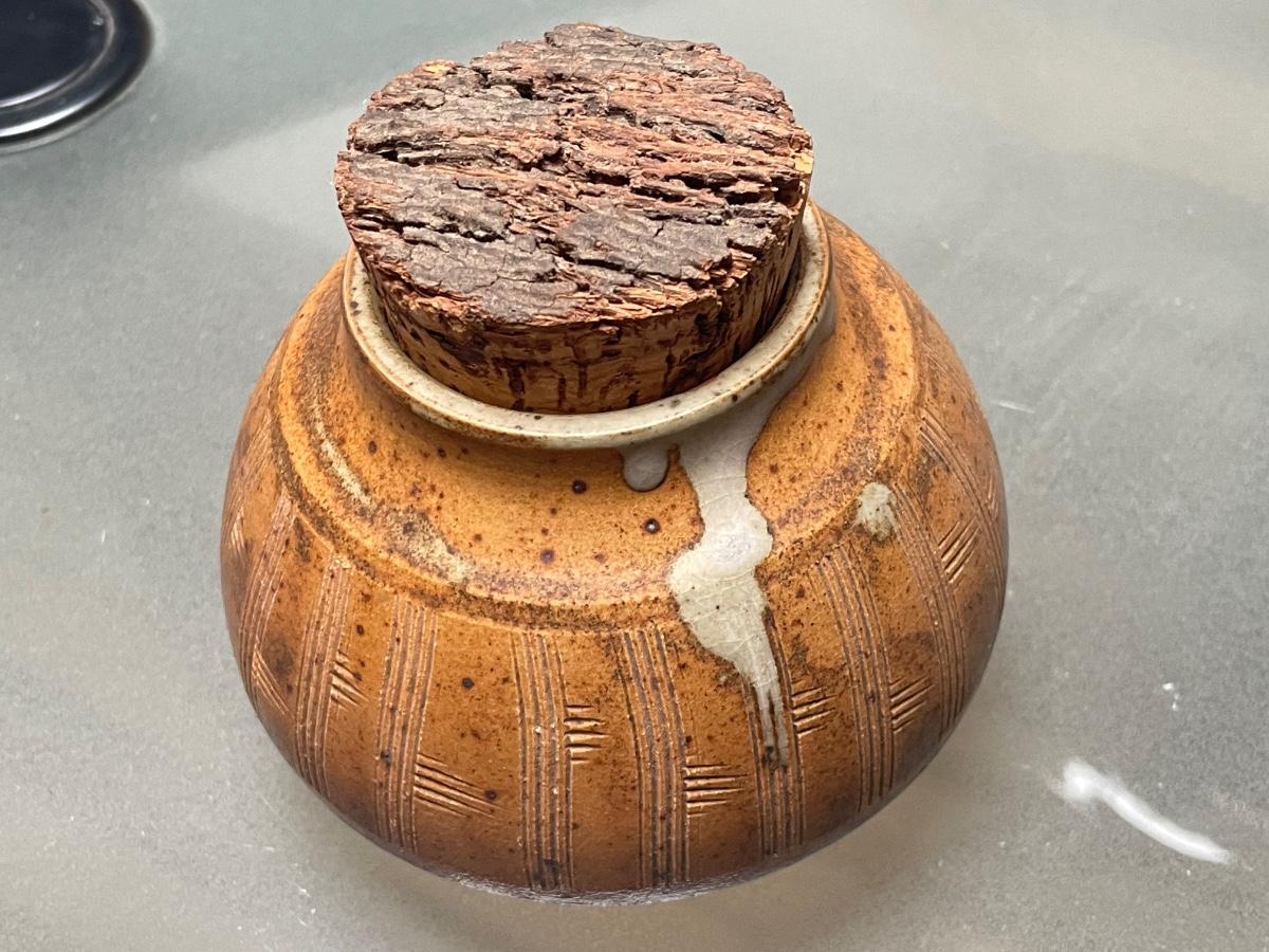 This is a smaller size pottery vessel with cork. Pottery has designs around it.